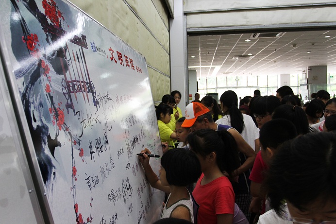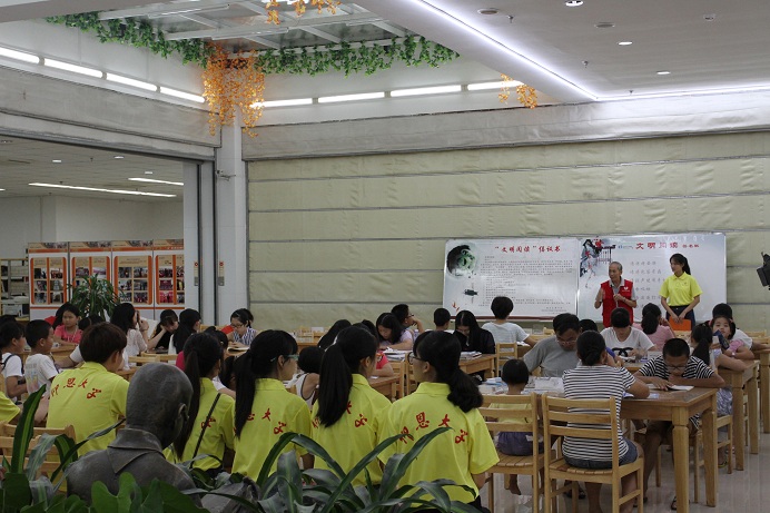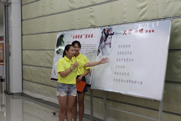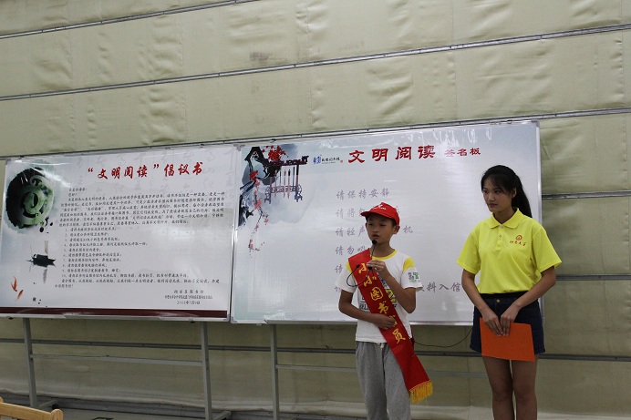 7月9日,翔安区图书馆组织仰恩大学会计学院实践队、文明阅读劝导队、小小图书管理员在馆内举行文明阅读倡议仪式。首先由仰恩大学实践队队员陈妙萍同学、小小图书管理员颜弘煜小朋友以及老年人文明阅读劝导队代表郑寿山老师,分别简要地谈了自己开展文明阅读劝导的感想,共同发起文明阅读倡议,发动所有在场的读者、志愿者等在文明阅读倡议宣传板上签字支持文明阅读,在场人员积极响应,踊跃参与。仪式结束后,大学生实践队和志愿者们统一着装,分散到全馆各个功能区,分发《文明阅读倡议书》,开展文明阅读劝导工作,对读者大声喧哗、追逐嬉戏等不文明行为给予及时制止和劝导。