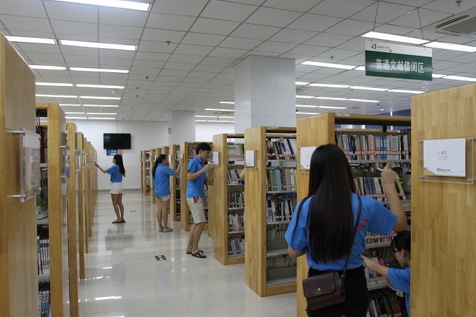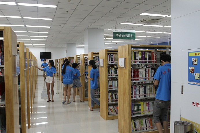 7月10日下午,翔安区图书馆与仰恩大学会计学院实践队在馆内联合开展“书海寻宝”搜书活动。仰恩大学会计学院实践队是翔安区图书馆在暑期接收的大学生志愿者服务队,通过前期对他们进行图书馆知识讲解和上架排架培训,队员们已基本熟悉图书馆的馆藏分布和图书分类。此次“书海寻宝”活动正是对他们进行的一项考核,要求队员们手持写有书目的纸条,在规定时间内找到图书所在书架位置,找出书。活动不仅有趣,而且让他们更好地掌握图书分类,在社会实践中更快更有效地上架整架和指导读者找书。