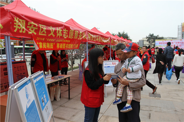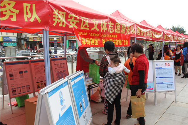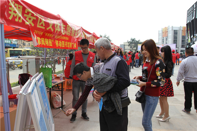 11月30日,中共翔安区委宣传部、区委文明办在翔安区新店泰禾天街举办翔安区创建新兴街“文明行为示范街”现场推进会,翔安区图书馆组织文化志愿者到现场开展了“志愿服务进社区”活动,进行 “掌阅翔图”翔安区移动图书馆推广、图书馆及分馆“邻里书屋”宣传、“书香翔安”全民读书月宣传、现场办证借书等。