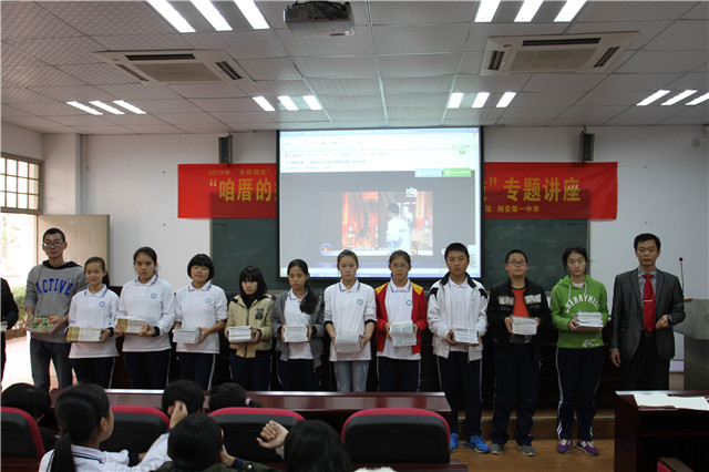 12月16日, 翔安区图书馆“公共文化服务校园行”走进厦门市翔安一中,举办了“咱厝的好声音——闽南童谣 答嘴鼓”讲座,邀请了号称翔安“郭德纲”的答嘴鼓传承人郭建居老师,为该校师生讲述了蕴含社会主义核心价值观的闽南童谣。讲座开始前,郭建居老师向师生代表赠送了《咱厝的好声音》一书,而后教授同学们学习闽南童谣、答嘴鼓,蕴含文明礼仪、道德教育、交通安全的内容,朗朗上口、通俗易懂的语言,生动活泼、诙谐风趣的讲座受到大家的欢迎,学生们听得津津有味、笑声不断,时不时跟着老师诵读起来,让师生们在学习闽南文化的同时,弘扬和践行社会主义核心价值观。