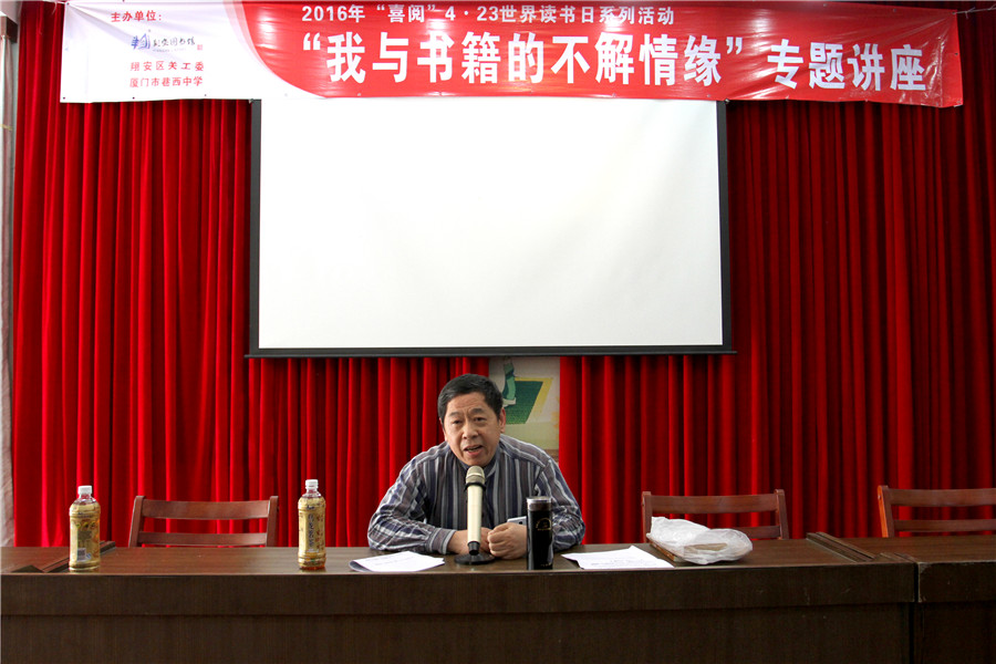此次讲座是翔安区图书馆举办的2016年“喜阅”4.23世界读书日系列活动之“博学教室”专题讲座,也是“公共文化服务校园行”的活动内容之一。据悉,蔡水妙系巷西中学首任校长,此次他回到曾经工作过的地方,向师生们讲述了他半辈子的读书历程,也饱含了他与书籍不解的情缘,其中真实的经历、动人的故事让师生们听得如痴如醉,蔡老师还结合自己读书的体会,向师生们传授读书方法,鼓励他们通过阅读,切身体会书籍的“喜阅”,享受阅读的乐趣。