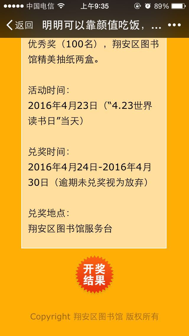 得奖情况请点击[开奖结果]进入“最美读书人”微信知识问答活动链接,点击“开奖结果”进行查询。请中奖的粉丝朋友们凭获奖sn码及个人信息至翔安区图书馆服务台兑奖。