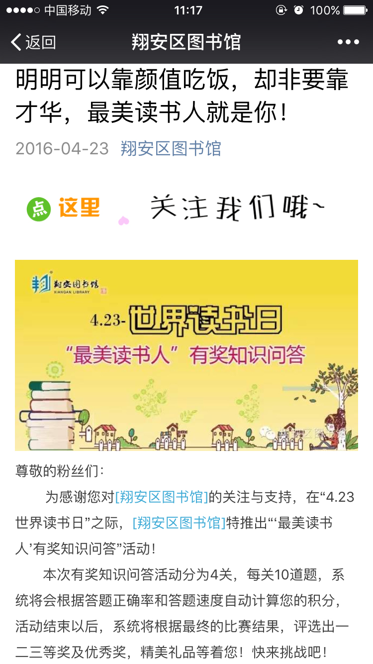今年4月23日,是第21个“世界读书日”,翔安区图书馆为了进一步倡导全民阅读,开展了线下2016年“喜阅”4.23世界读书日系列活动以及线上微信公众平台的“最美读书人”有奖问答活动。