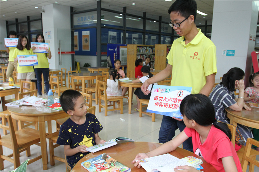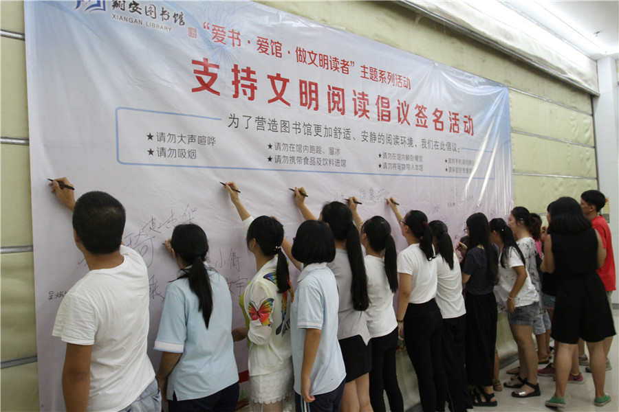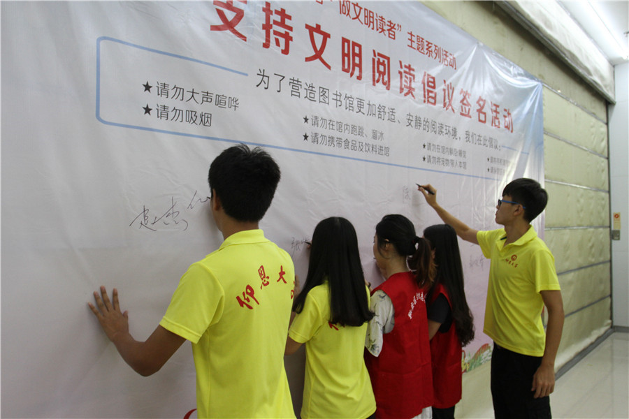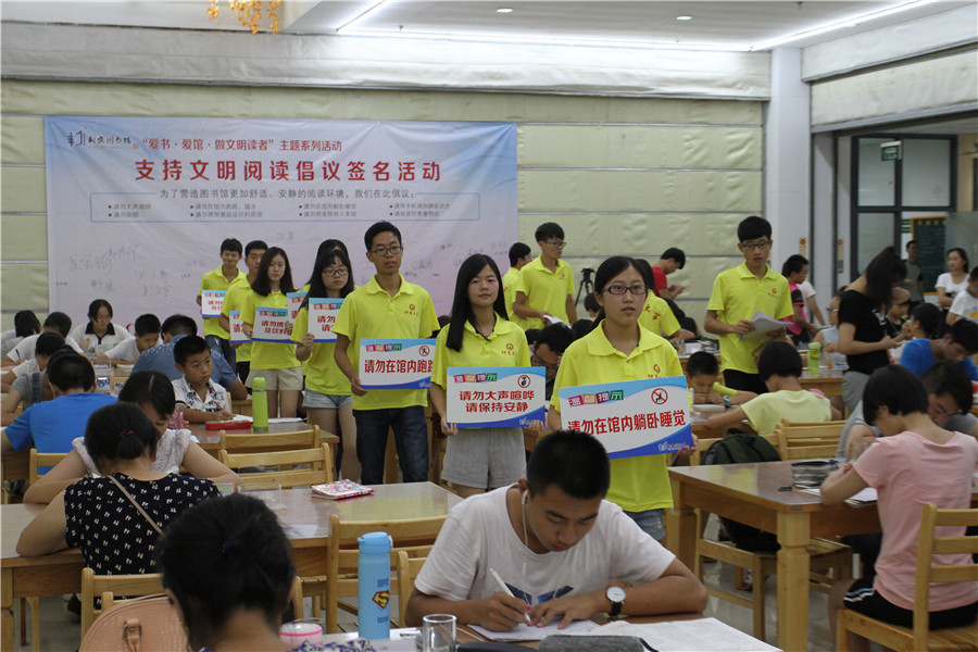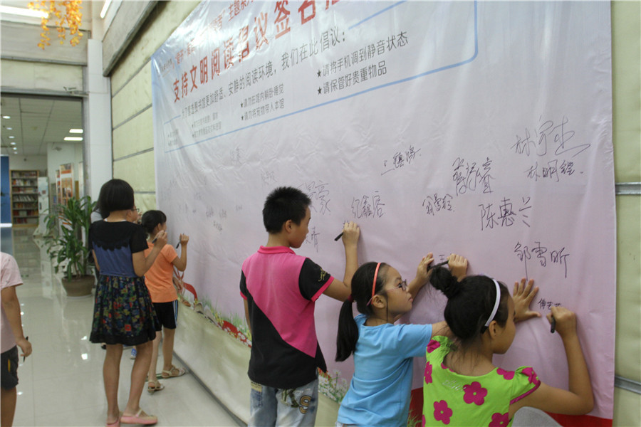 7月14日,翔安区图书馆组织仰恩大学管理学院暑期实践队、文明阅读劝导队、小小图书管理员在馆内举办“爱书·爱馆·做文明读者”主题系列活动启动仪式暨支持文明阅读倡议签名活动。