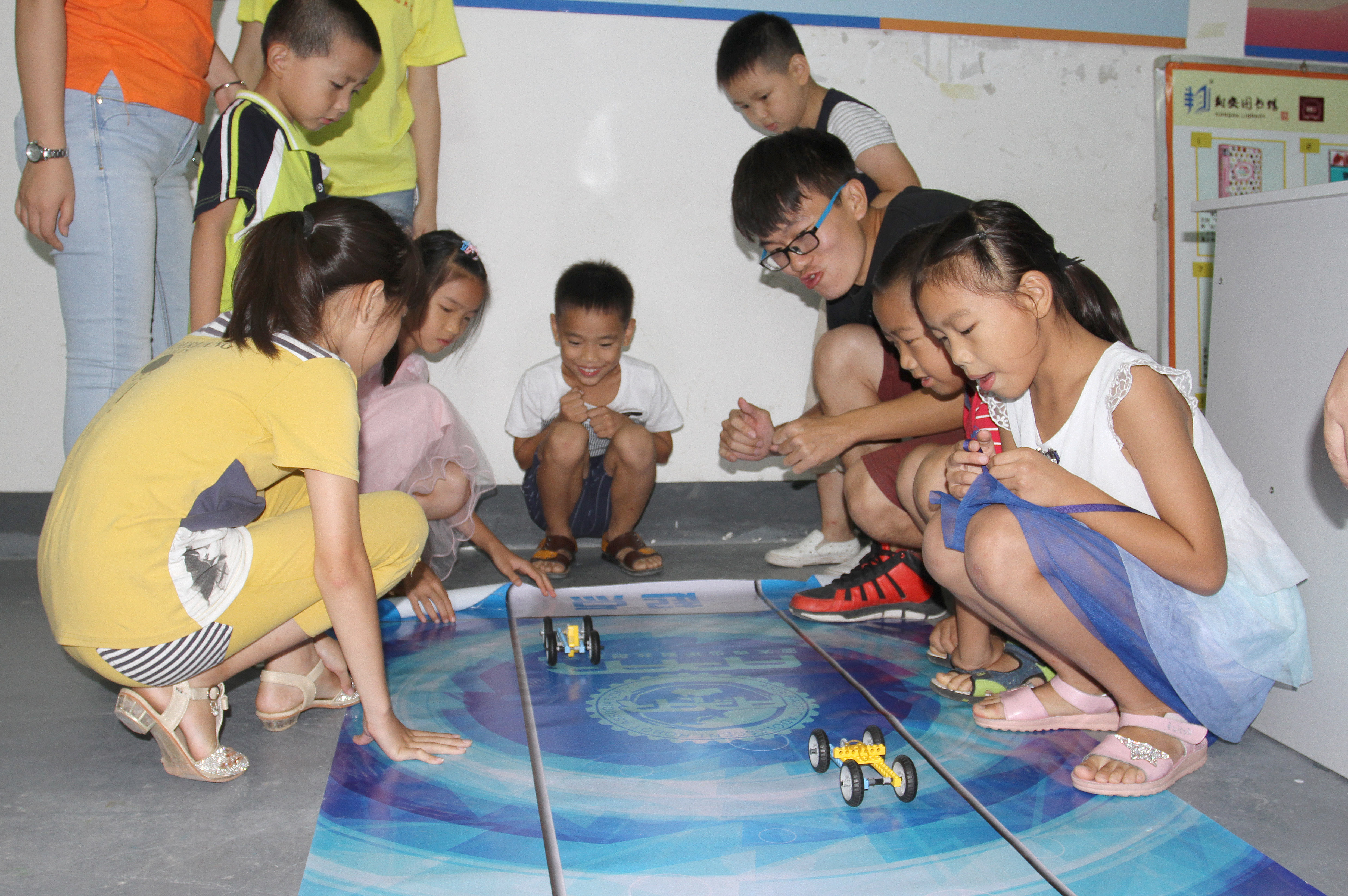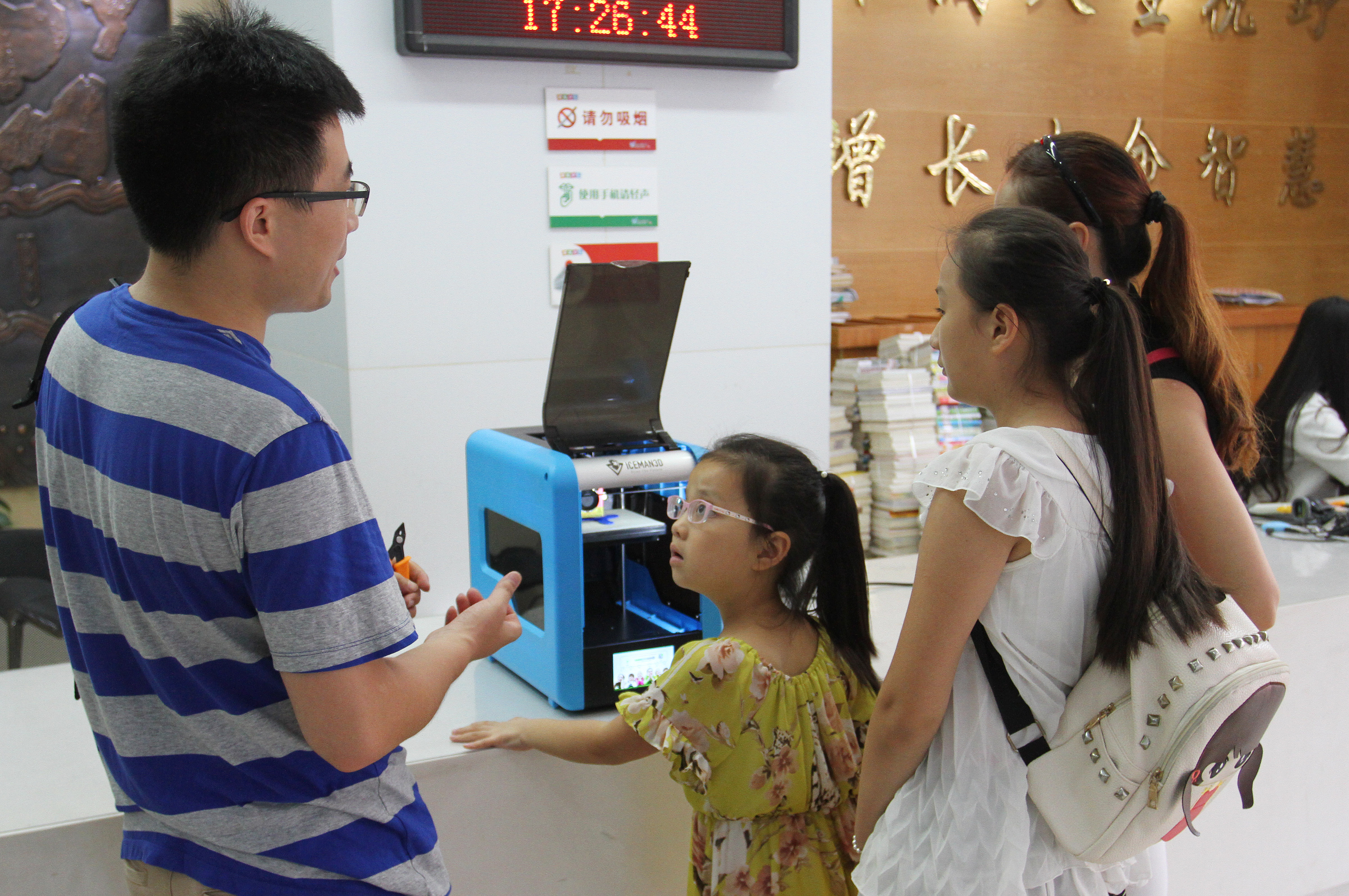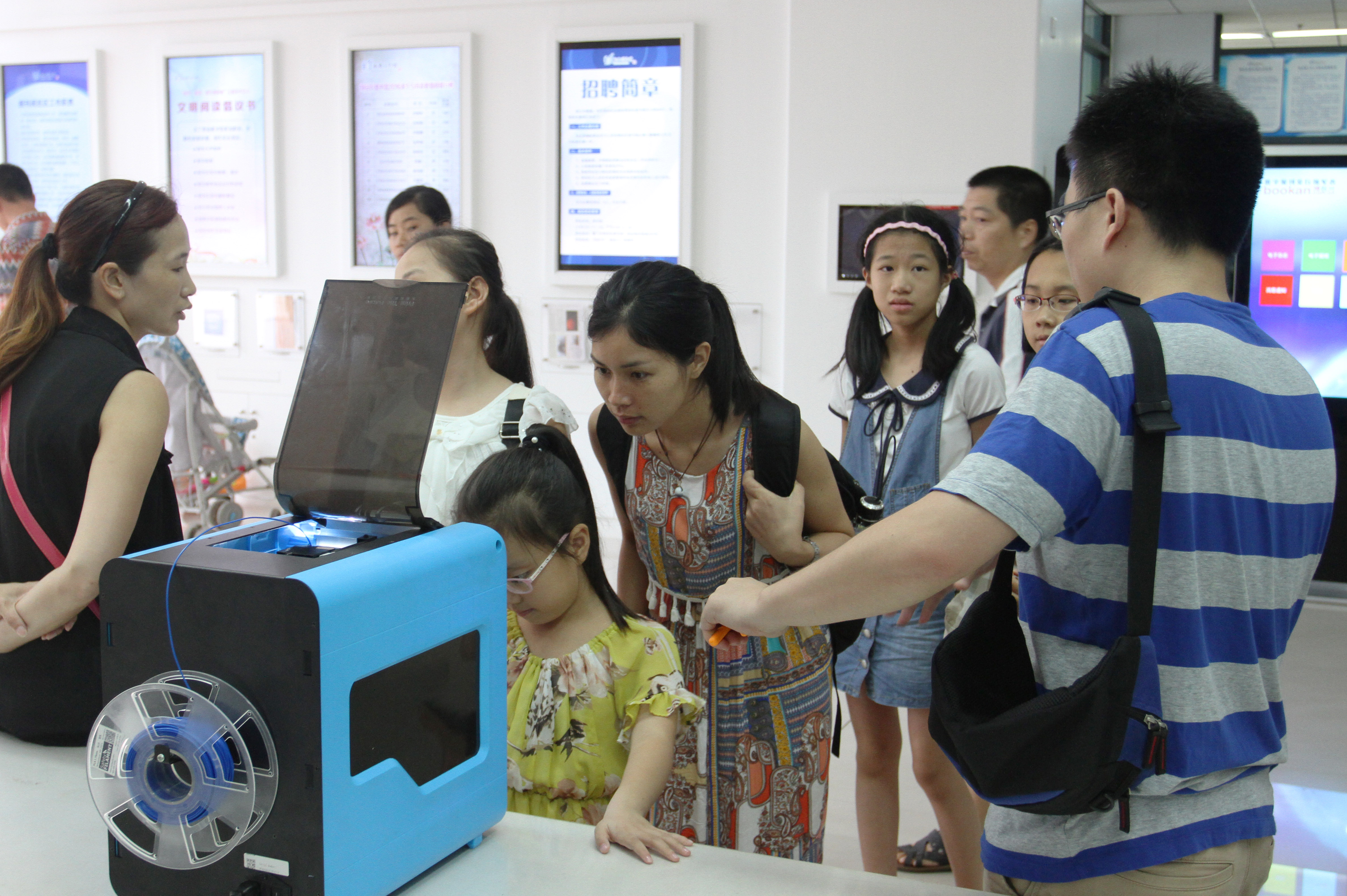 7月19日,“小小创客家”科普令营的小营员们在老师的指导下搭建组装弹力小车,利用弹簧的物理原理让小车跑起来,并分组进行比赛。活动结束后,图书馆继续在门厅做3D打印机打印展示。