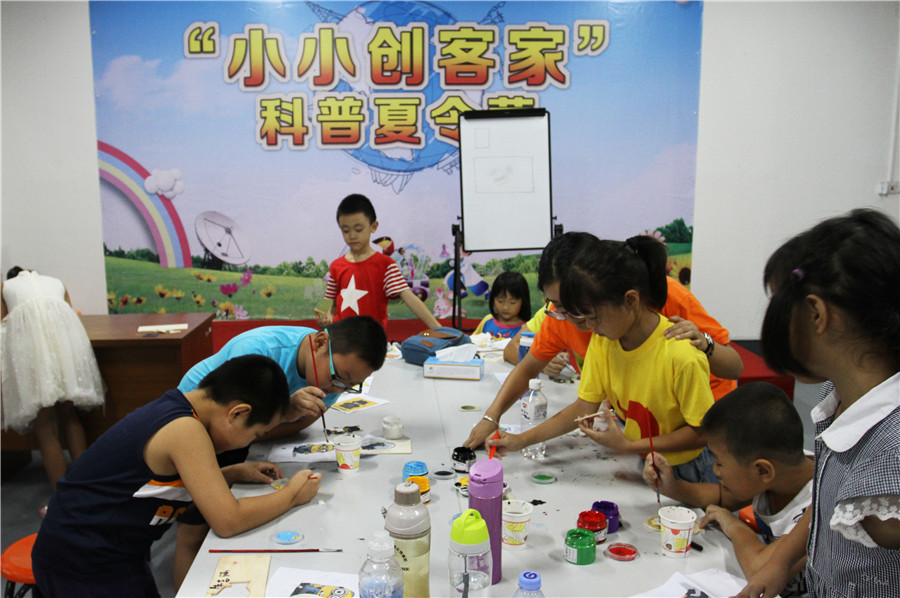 7月20日,“小小创客家”科普夏令营进行到最后一天,小营员们在老师的指导下进行微型机床的体验,用机床切割制作小朋友自己喜欢、画有动物等图案的作品并上色。