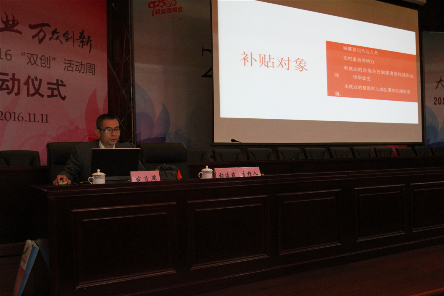 启动仪式由区人社局局长纪添财主持,市人社局副局长洪向新讲话,区政府副区长许永良致辞。区政府副区长许永良宣布“大众创业 万众创新”活动周开幕,并为“创业达人宣讲团”授旗。