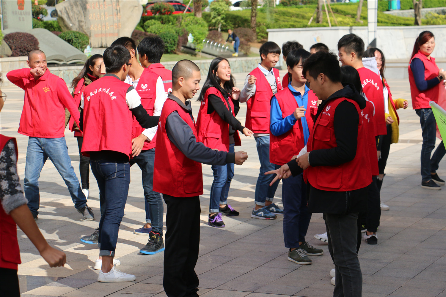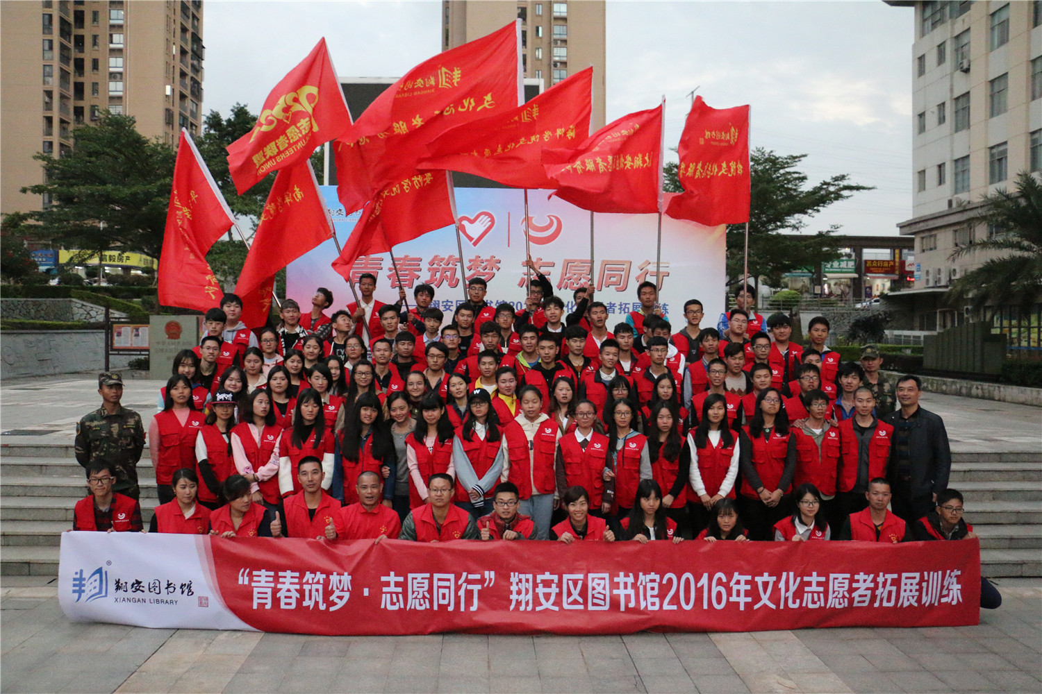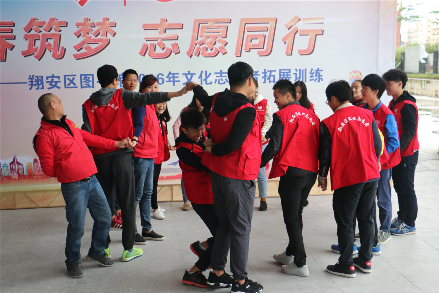11月27日,翔安区图书馆在文化中心广场举办“青春筑梦 志愿同行”2016年文化志愿者拓展训练,近100名翔安区图书馆文化志愿者骨干参加培训,他们主要来自厦门大学、海洋学院、技师学院、南洋学院、华天涉外学院、安防学院等6所高校以及92580志愿者联盟。