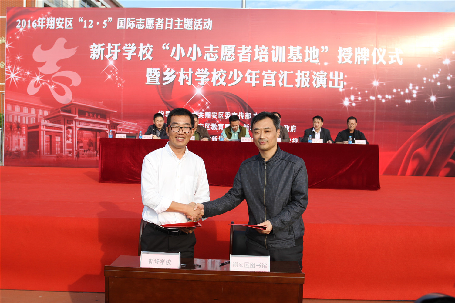 新圩学校是翔安区图书馆新设立的分馆,活动中,由区图书馆馆长张胜峰和新圩学校校长林东荣共同签订了《“邻里书屋”共建协议》。今后,双方将在全民阅读推广、文化下乡、志愿服务、社团活动等方面资源共建共享,积极参与厦门争创“全国志愿服务模范城”,共同推动翔安公共文化服务工作。图书馆将定期开展“流动服务车”进站服务,更新书籍,开展参考咨询、读书活动等,把图书馆开到师生们身边。