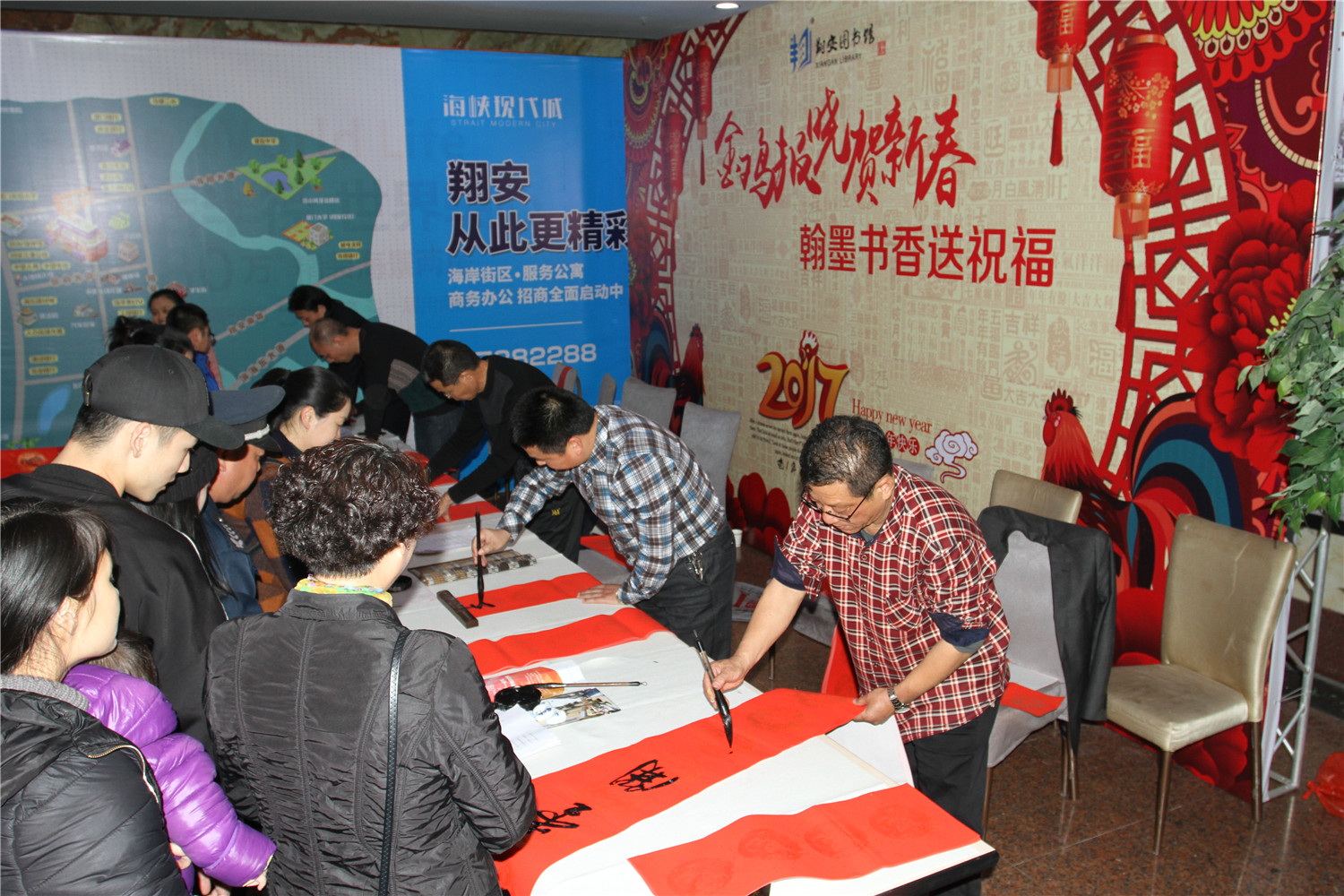 1月14日、15日,翔安区图书馆分别在馆内、汇景购物广场举办“金鸡报晓贺新春 翰墨书香送祝福”新春系列活动。来自翔安区的本土书法家在这里挥毫泼墨,免费手书春联送给读者,一幅幅充满喜庆吉祥的春联为读者们送上了新春的祝福。活动现场还开展了“迎新春 送祝福”国学知识有奖竞猜,让读者在踊跃竞猜的同时,过一个有文化氛围的新春佳节。