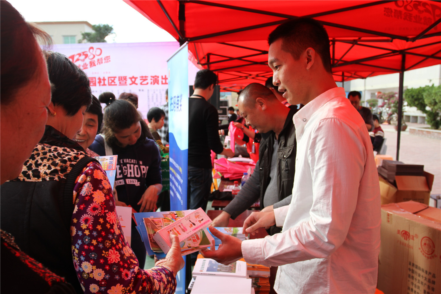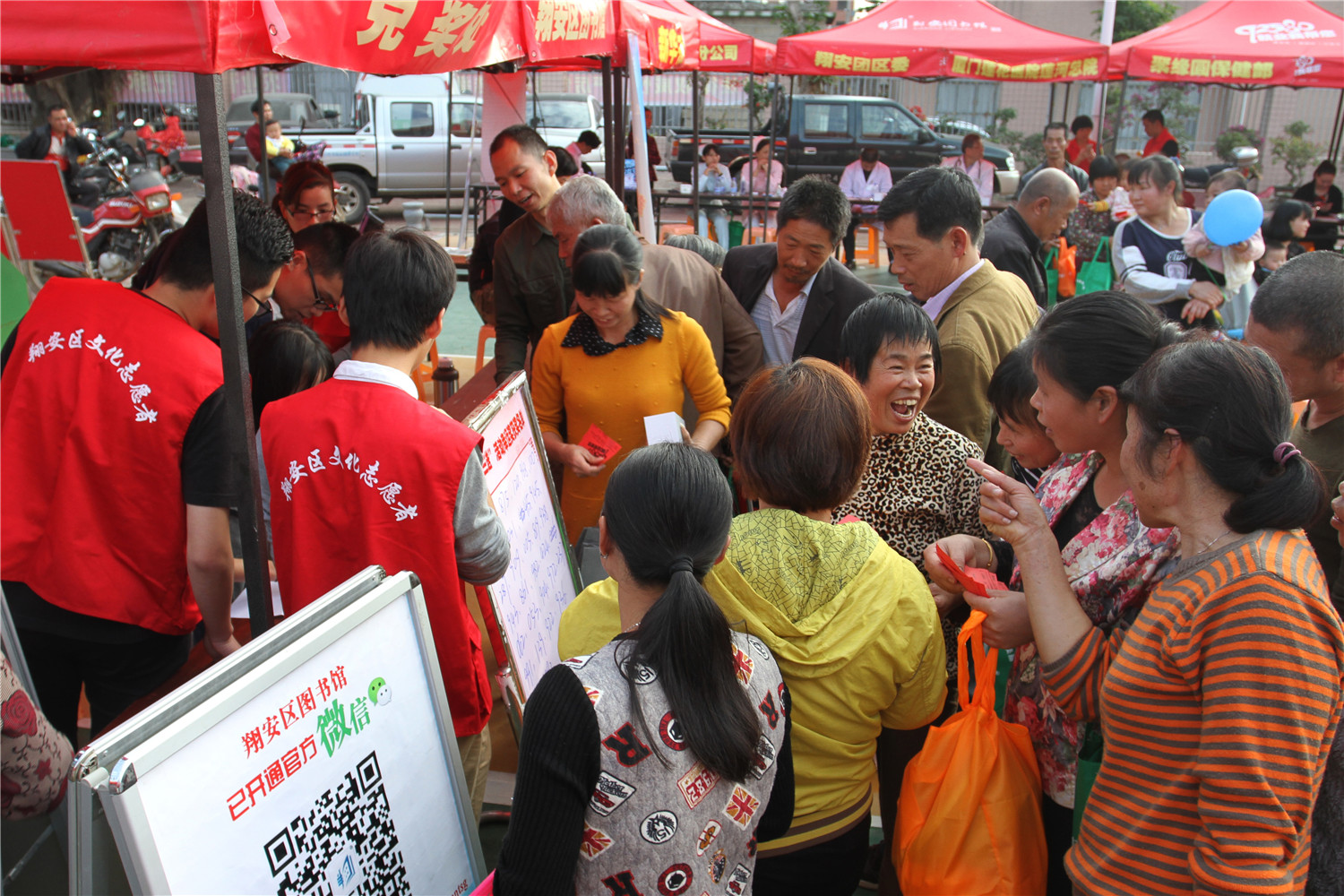 此外,翔安区图书馆还整合了区相关单位,以“92580就业我帮您”为主题,以送文化、送岗位、送服务“三送”为内容,除区图书馆服务活动外,92580志愿者联盟也到现场开展服务,还有大型文艺演出、卡拉OK大家唱;有企业现场招聘,以及区直相关单位在现场摆摊设点向村民提供就业创业优惠政策、法律知识、环境保护、安全生产、社会科学知识等宣传,并接受现场咨询;主办单位还印发了宣传单2000多份,开设了有奖互动问答;设置了92580服务处,开展创业培训、技能培训宣传和接受咨询报名;厦门莲花医院莲河总院提供现场义诊服务;阳光视线、聚缘圆等公司免费为村民验光、配镜、推拿等;厦门市铖信财务有限公司免费赠送二维码pos机;厦门施普康药业免费赠送血糖仪等。