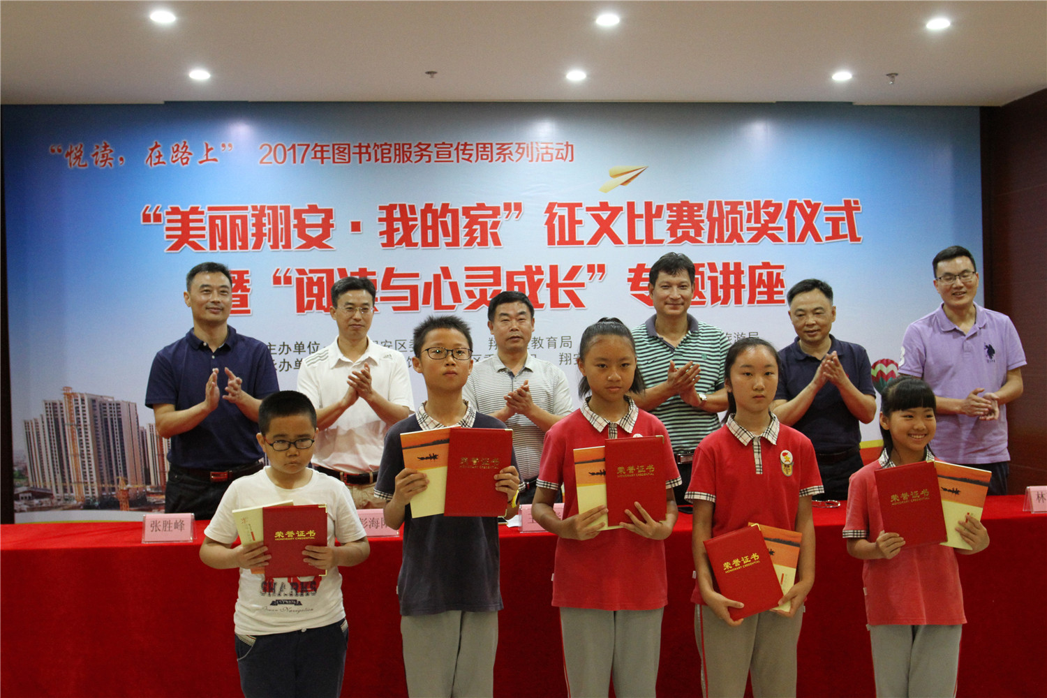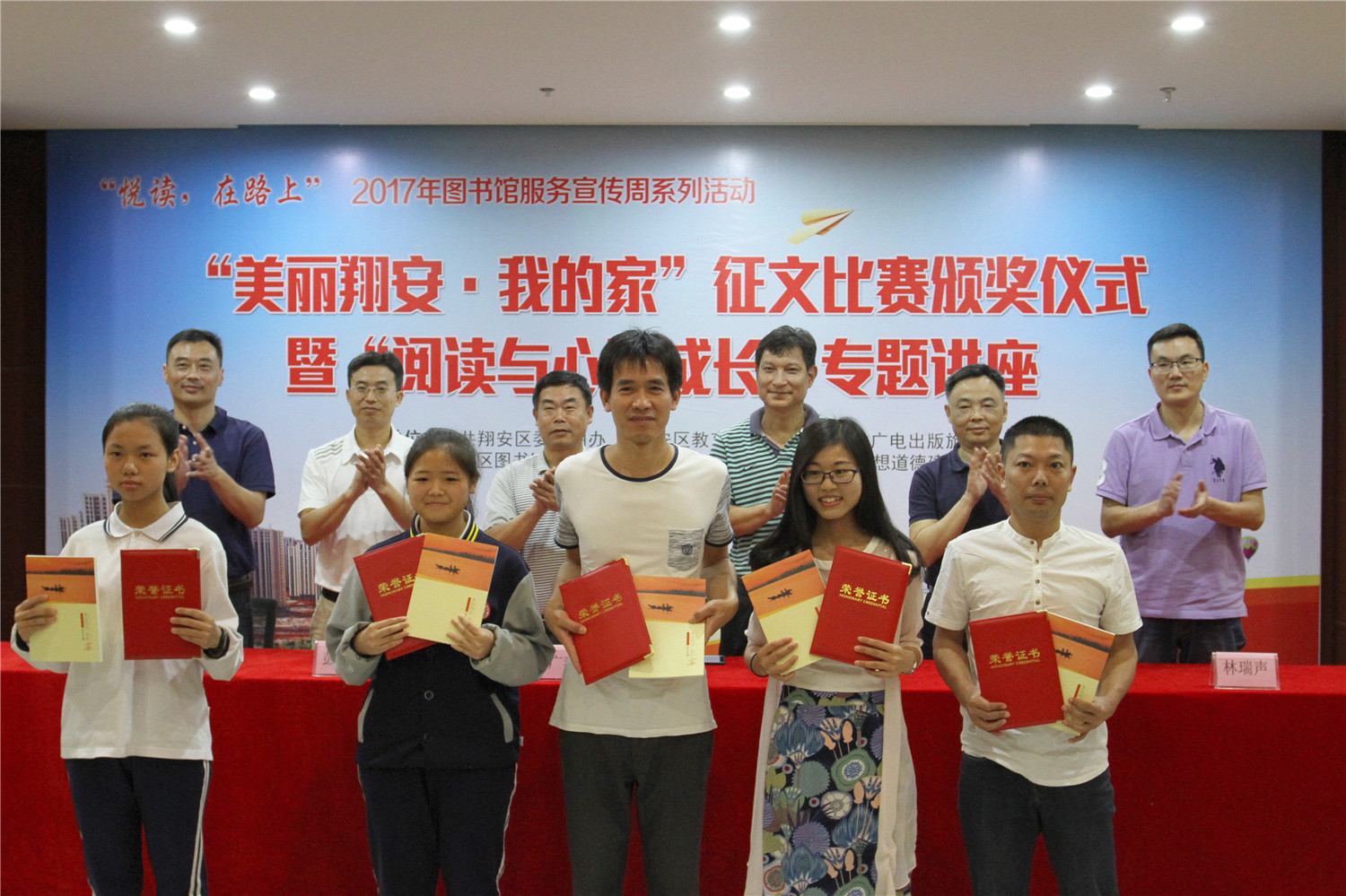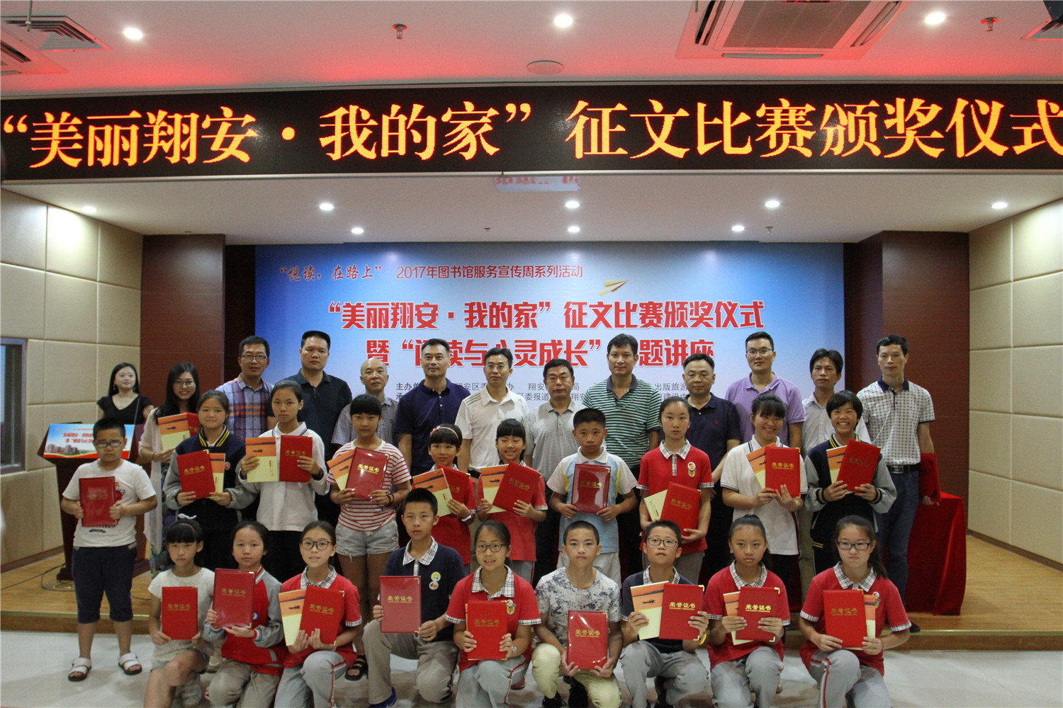 5月26日上午,翔安区图书馆在二楼报告厅举办“悦读,在路上”2017年图书馆服务宣传周系列活动之“美丽翔安我的家”征文比赛颁奖仪式暨《阅读与心灵成长》阅读讲座。翔安区文体广电出版旅游局副调研员张世强、中共翔安区委文明办副调研员王广春、翔安区教育局局长助理蔡辉录、中共翔安区委报道组组长林瑞声、翔安区未成年人思想道德建设中心主任彭海阳、翔安区图书馆馆长张胜峰及获奖学生、指导老师出席了颁奖仪式。颁奖仪式后还举办了《阅读与心灵成长》阅读讲座。