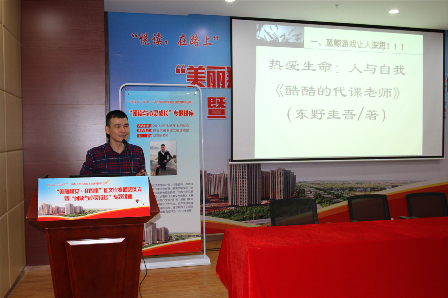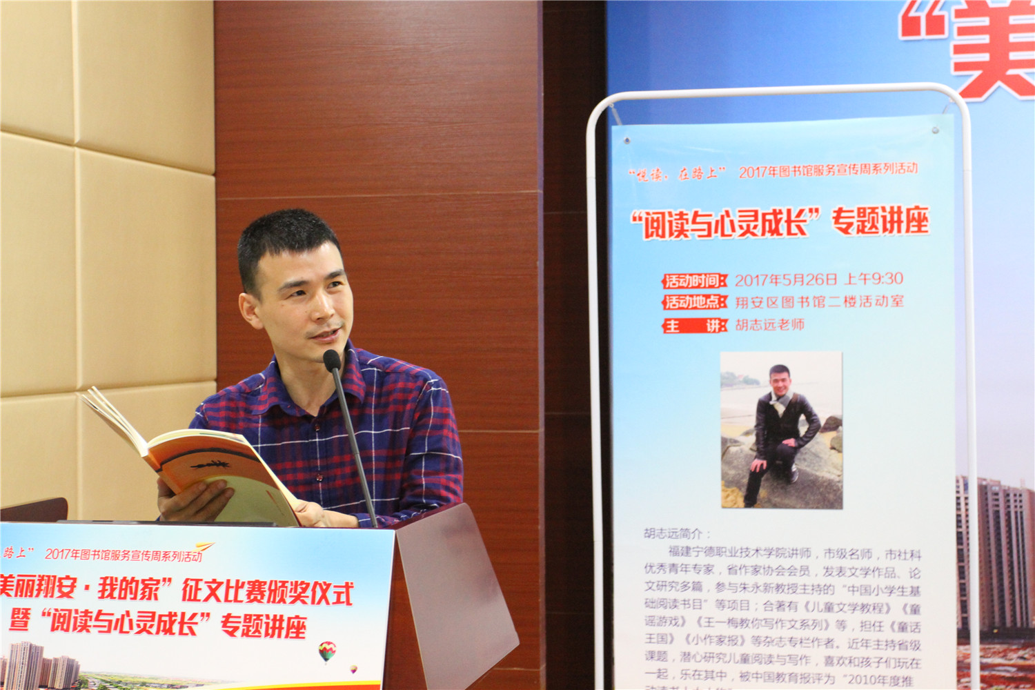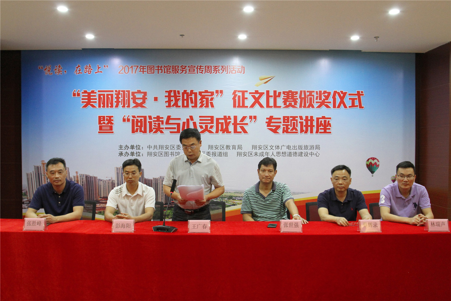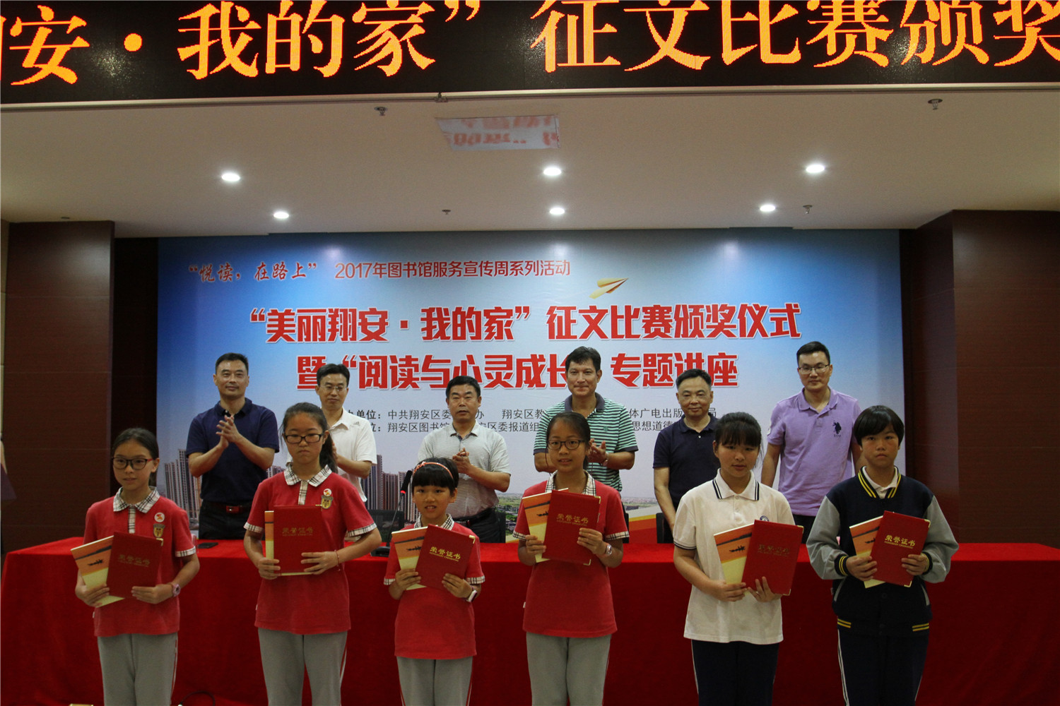 5月26日上午,翔安区图书馆在二楼报告厅举办“悦读,在路上”2017年图书馆服务宣传周系列活动之“美丽翔安我的家”征文比赛颁奖仪式暨《阅读与心灵成长》阅读讲座。翔安区文体广电出版旅游局副调研员张世强、中共翔安区委文明办副调研员王广春、翔安区教育局局长助理蔡辉录、中共翔安区委报道组组长林瑞声、翔安区未成年人思想道德建设中心主任彭海阳、翔安区图书馆馆长张胜峰及获奖学生、指导老师出席了颁奖仪式。颁奖仪式后还举办了《阅读与心灵成长》阅读讲座。