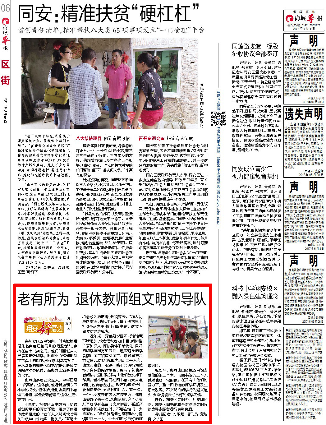 4年前,翔安区图书馆为了给读者创设更好的阅读环境,组建了由退休教师组成的“老年人文明阅读劝导队”,郑寿山成为第一批队员。“有这个机会成为志愿者,我很高兴。”加入劝导队至今,他风雨无阻,每个周末早上7点多从家里出门到图书馆,做文明阅读劝导志愿者。
