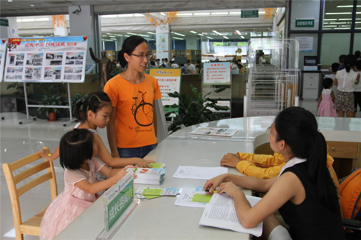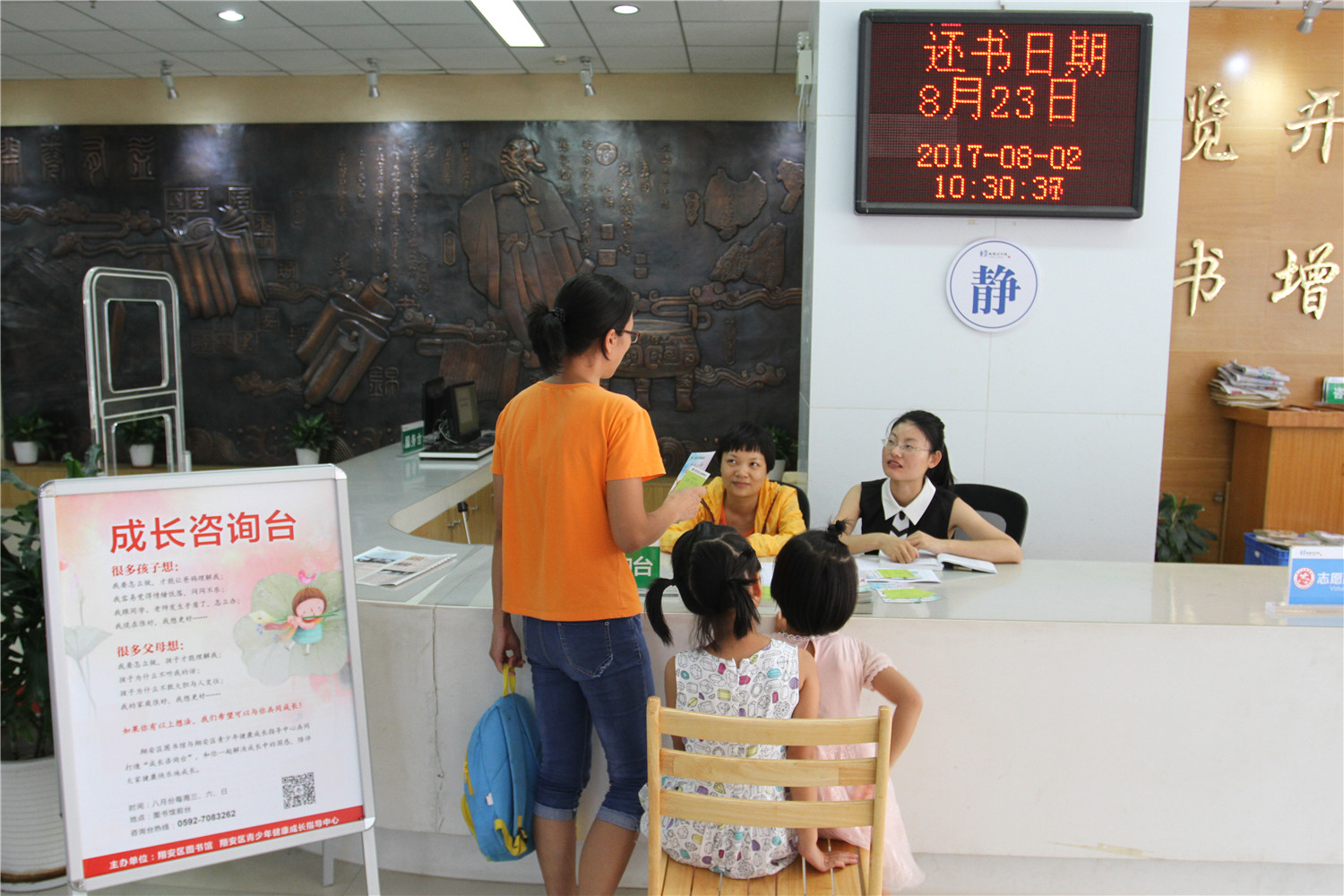 8月2日,翔安区图书馆与区青少年健康成长指导中心在服务台共同开设“成长咨询台”,邀请专业咨询师与到馆青少年读者及家长面对面交流,针对青少年读者成长中遇到的烦恼、父母在教育子女中遇到的困惑等问题接受咨询。