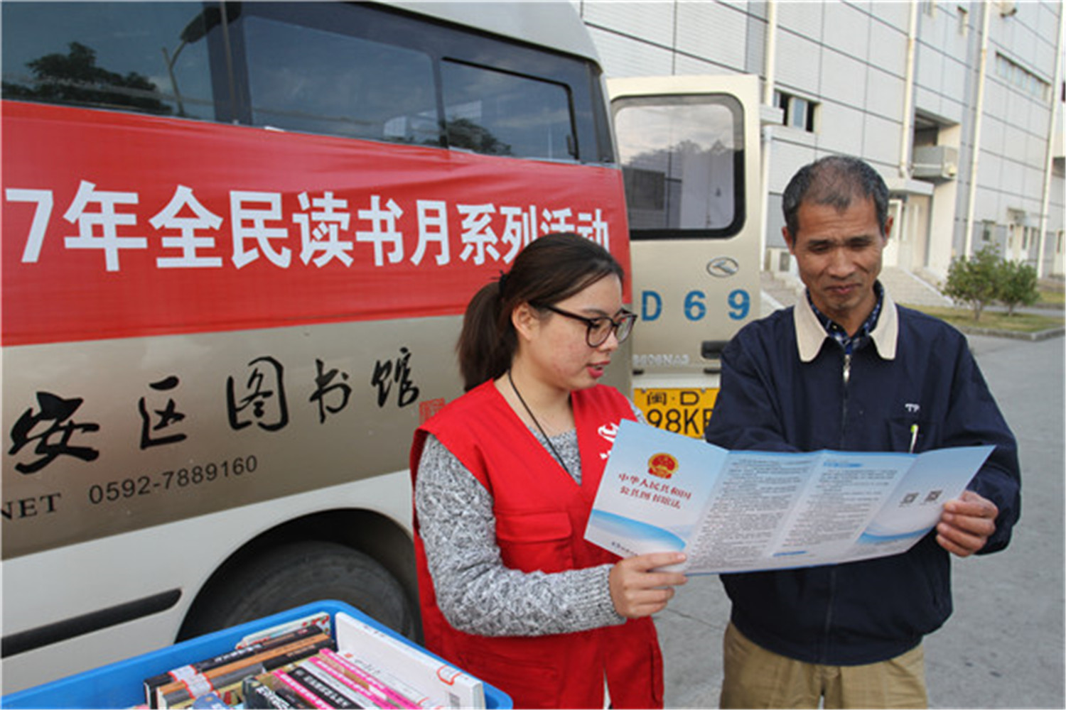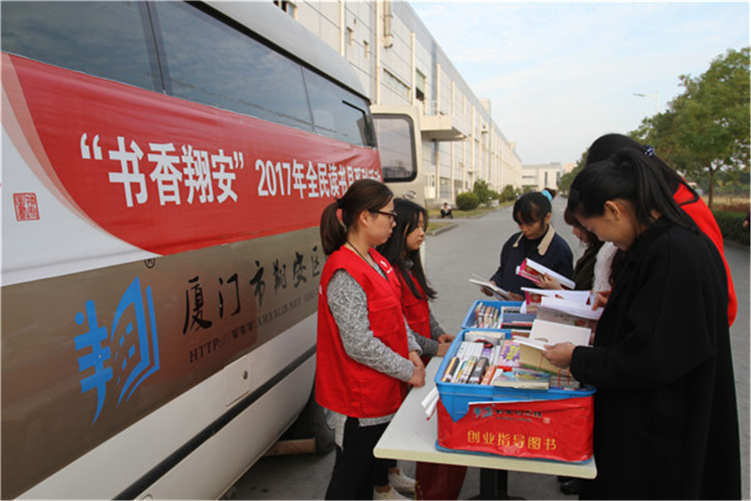 12月26日,翔安区图书馆组织馆员和文化志愿者走进冠捷显示科技有限公司,为企业员工提供办证借书服务、图书馆宣传、掌阅翔图推广、《中华人民共和国公共图书馆法》宣传、《中华人民共和国公共服务保障法》宣传、《不忘初心 继续前进--认真学习贯彻党的十九大精神》图片展宣传等,受到了他们的热烈欢迎。此次活动是翔安区图书馆举办的“书香翔安”2017年全民读书月系列活动之一。