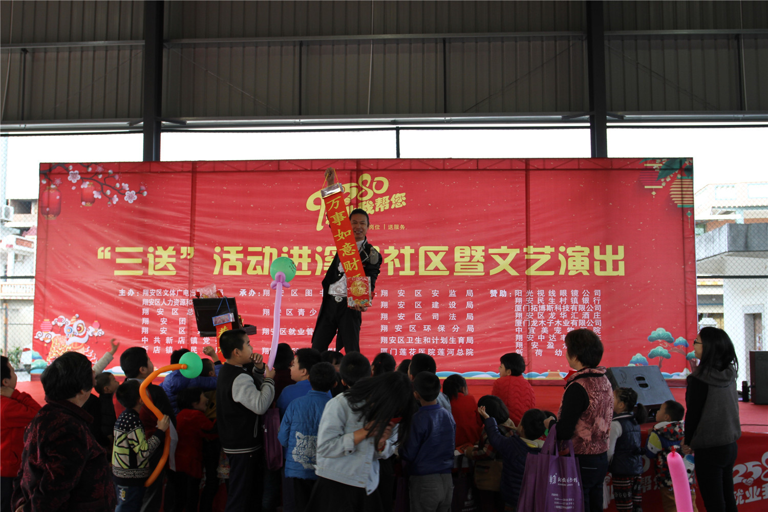 1月25日,翔安区图书馆在新店镇溪尾社区篮球场举办翔安区92580就业我帮您“三送”进社区暨文化下乡活动。翔安区图书馆组织文化志愿者开展了现场办证借书、“掌阅翔图”移动图书馆推广、图书馆宣传、《中华人民共和国公共图书馆法》宣传、《中华人民共和国公共服务保障法》宣传、好书推介等;还特别邀请了本地书法家开展“手写春联送祝福”活动,为社区群众们带来一幅幅饱含新春祝福的春联;精心设计了与翔安区地名有关的具有本土特色的灯谜活动,倡导全民阅读,推动书香翔安建设,受到了广大社区居民的热烈欢迎和积极参与。