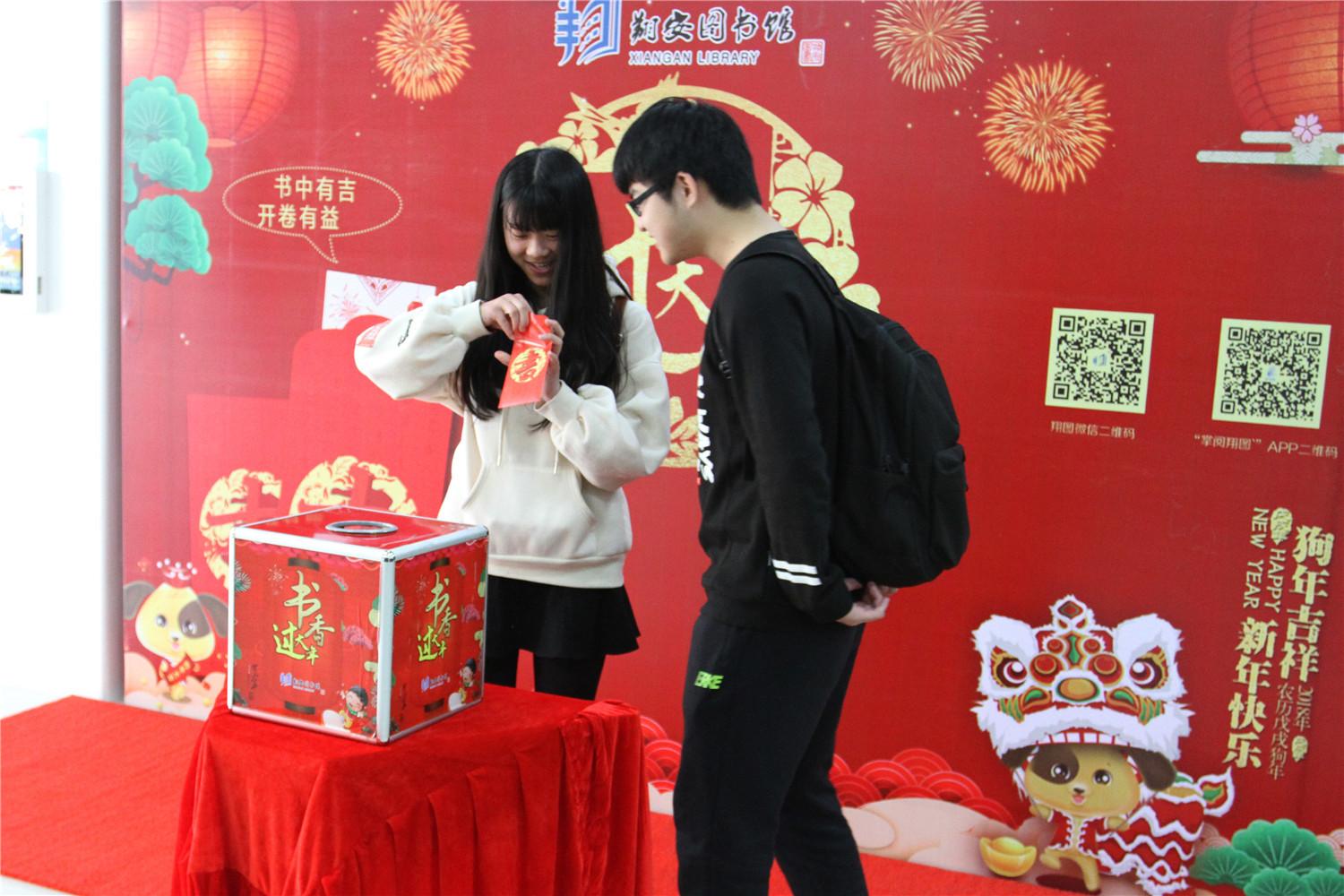 “九州日月开春景,四海笙歌颂狗年”。狗年春节的喜庆气氛渐次浓郁,2月14日,翔安区图书馆在馆内举办“书香过大年”系列活动。精心设计了带有“書”中有“吉”的hong包袋,寓意“书中有吉,开卷有益”。每个hong包袋中都放有“新年幸运书目推荐”和精美礼品的兑奖券。这些书目推荐均从近年来“向全国青少年推荐百种音像电子类优秀出版物推荐书目”、“中国好书”、“大众喜爱的50种好书”等群众喜闻乐见的书目中遴选,寓意吉祥的“hong包”不仅为读者送上了新年祝福,也向他们推介了图书,更促进了全民阅读。活动走进企业、社区、军营等地,并还将在2月16(正月初一 )、18日(正月初三)举办。