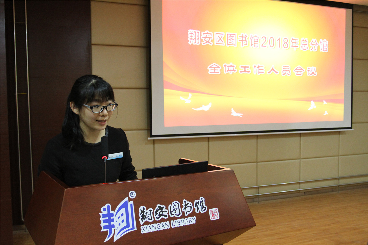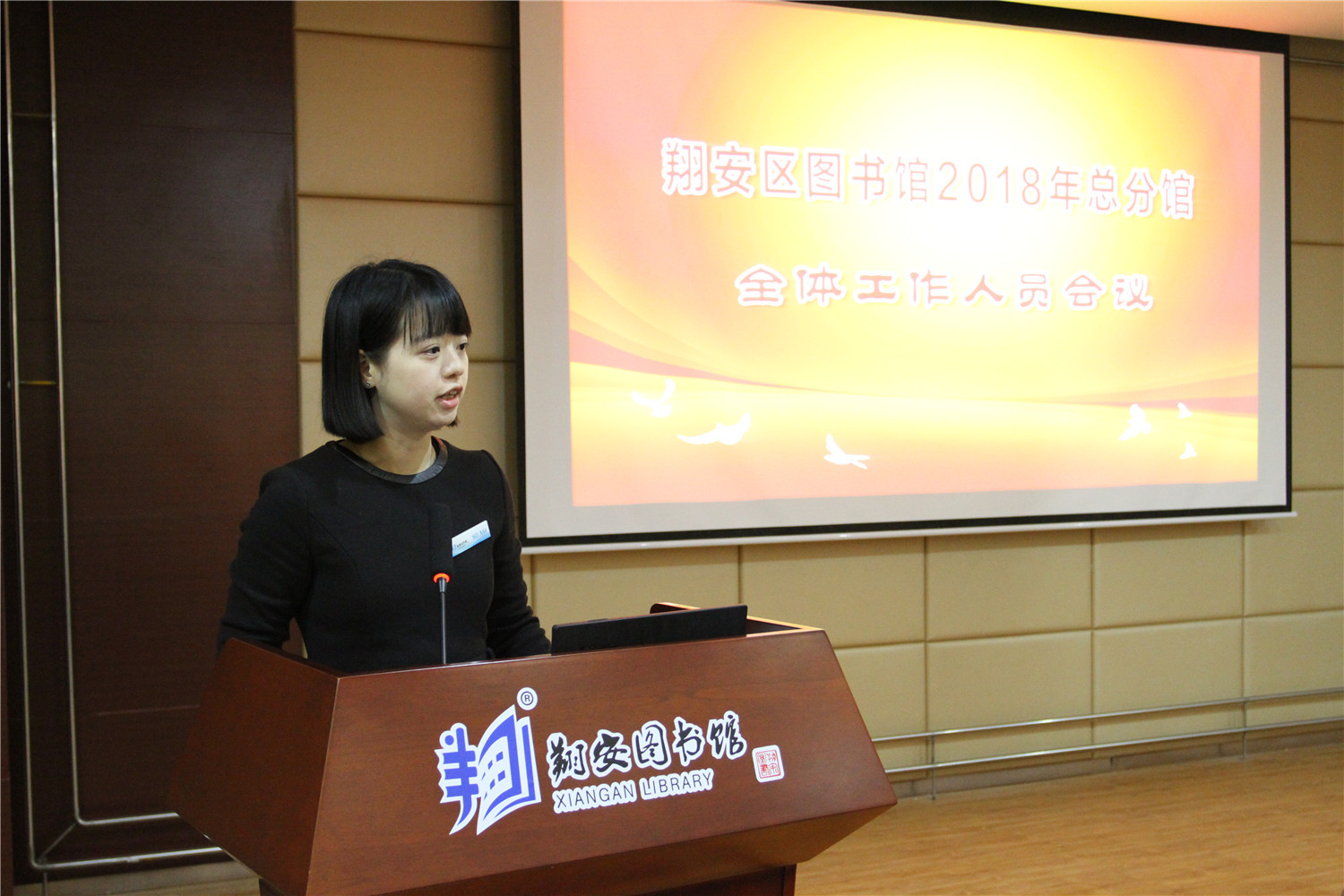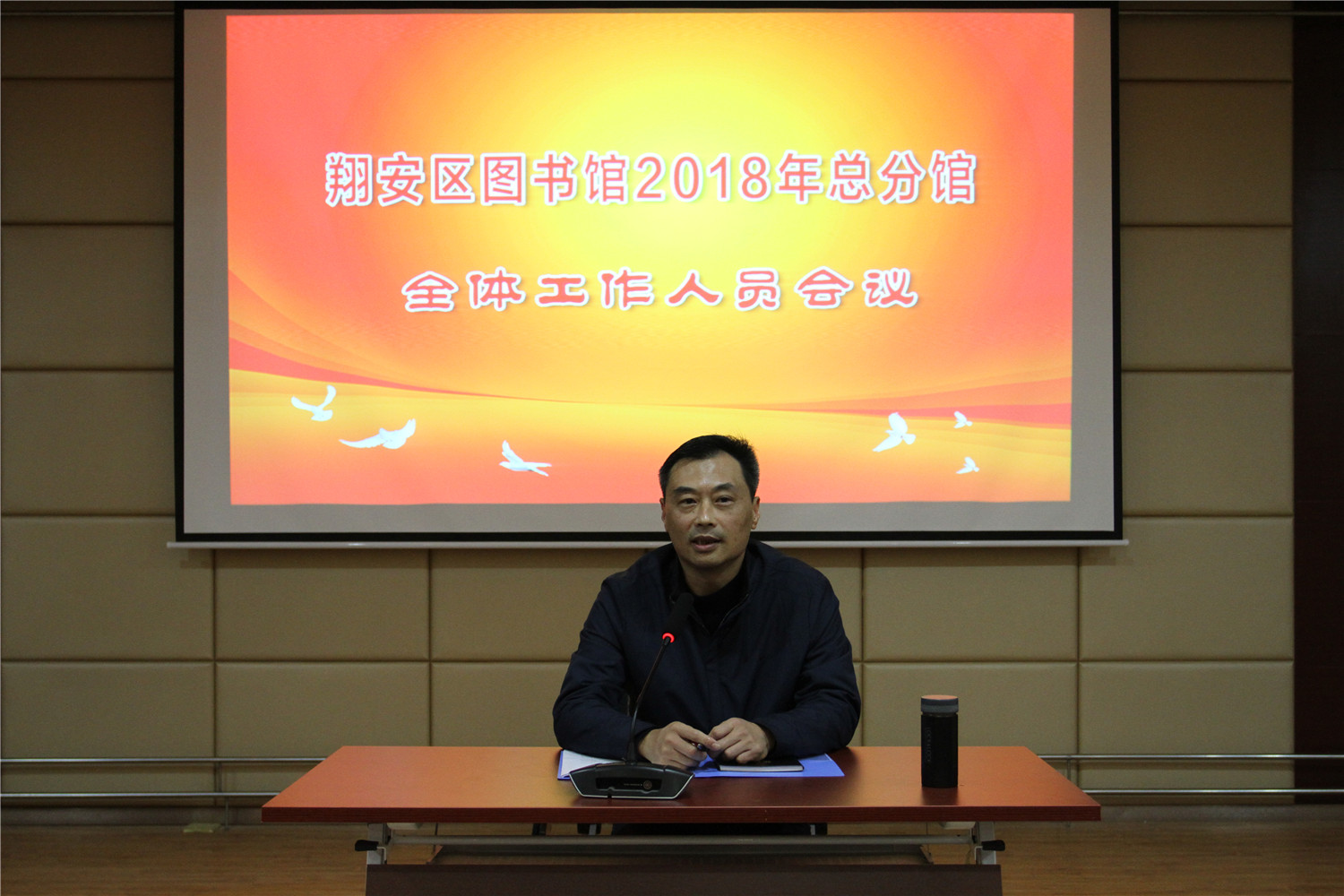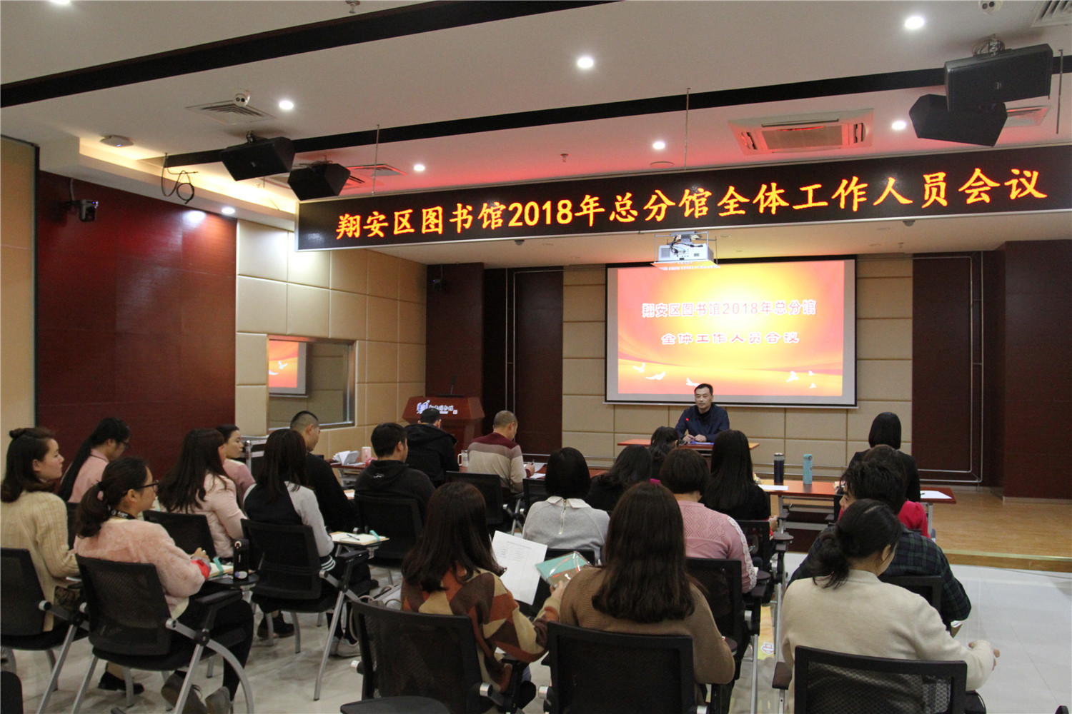 会议由综合保障部主任陈梅玲就总分馆人员分工、工作职责和总分馆运行制度、人事管理制度作详细解读;流通服务部林琳布置今年部门工作任务。张胜峰馆长作了“依法办馆,创新发展,推动新时代翔安公共图书馆事业取得新辉煌”的主题工作报告,内容包括“2017年工作回眸”、“进入新时代 开启新征程”、“未来三年工作谋划”、“2018年工作展望”四部分。他强调,图书馆要全面贯彻党的十九大精神,以习近平新时代中国特色社会主义思想为指导,按照《关于加快构建现代公共文化服务体系的意见》精神,紧紧围绕区委区政府建设“五大发展示范区”的发展定位,以打造公共图书馆联盟翔安区级中心馆为目标,以人民群众基本文化需求为导向,按照公益性、基本性、均等性和便利性要求,实施“八大工程”,提高服务效能,完善服务网络,丰富服务内容,进一步推进全民阅读,提高人民群众科学文化素质,增强人民群众对公共文化服务的获得感。全体工作人员要统一思想,形成共识,明确目标和任务,锐意进取,扎实工作,按照“我的图书馆”的理念,依法办馆,创新发展,推动新时代翔安公共图书馆事业取得新辉煌。
