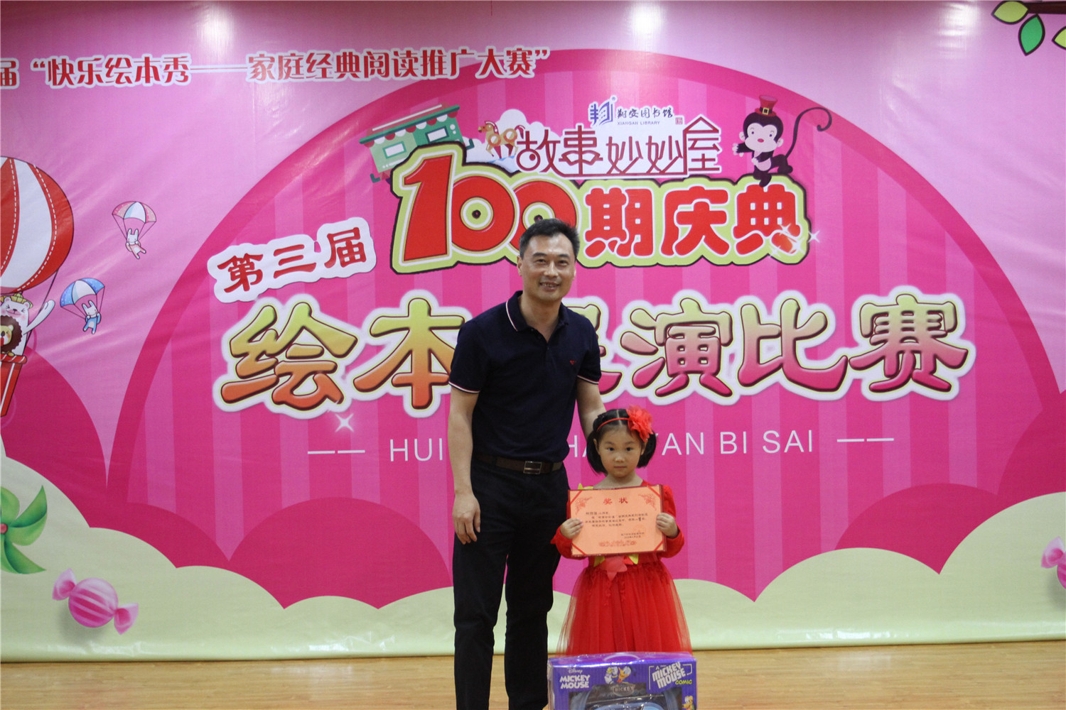 图书馆馆长张胜峰为林诗语小朋友颁发展演比赛一等奖