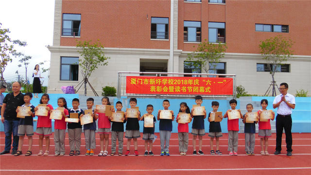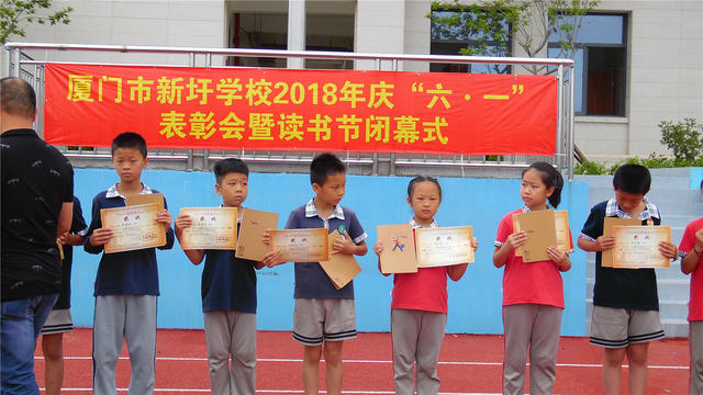 翔安区图书馆新曦邻里书屋与厦门市新圩学校联合举办读书节活动,评选出“读书之星”与“书香班级”,激励同学们多读书,读好书。“读书之星”以班级为单位,每班产生2名,以在采蜜卡的数量及借阅量最多者为胜。6月1日,新圩学校领导在大操场上对“读书之星”与“书香班级”进行颁奖。