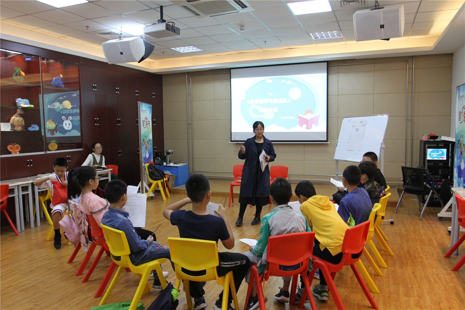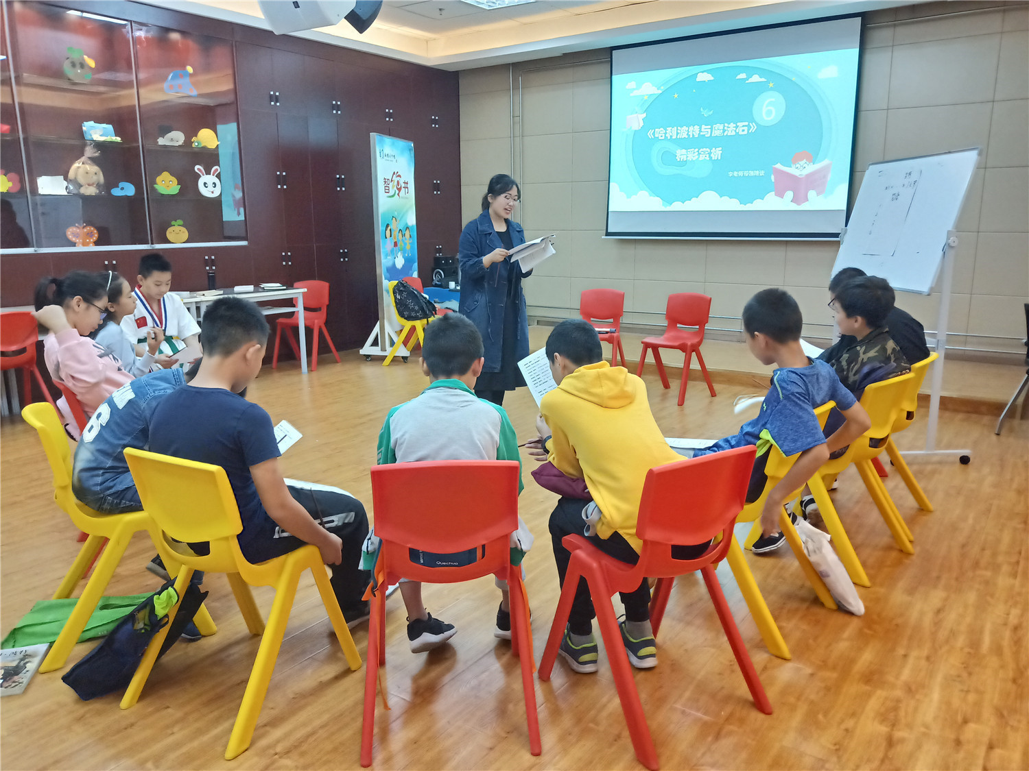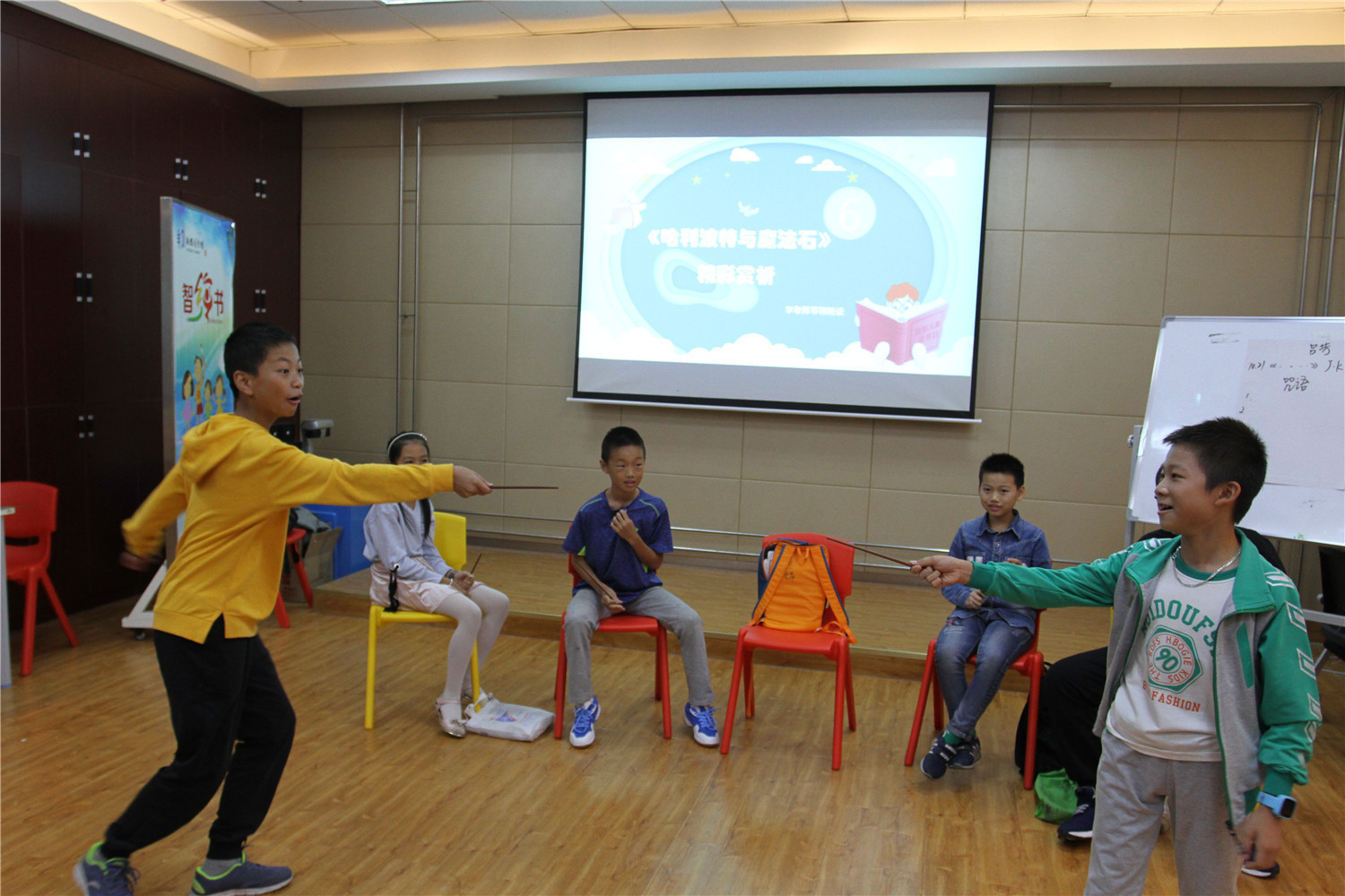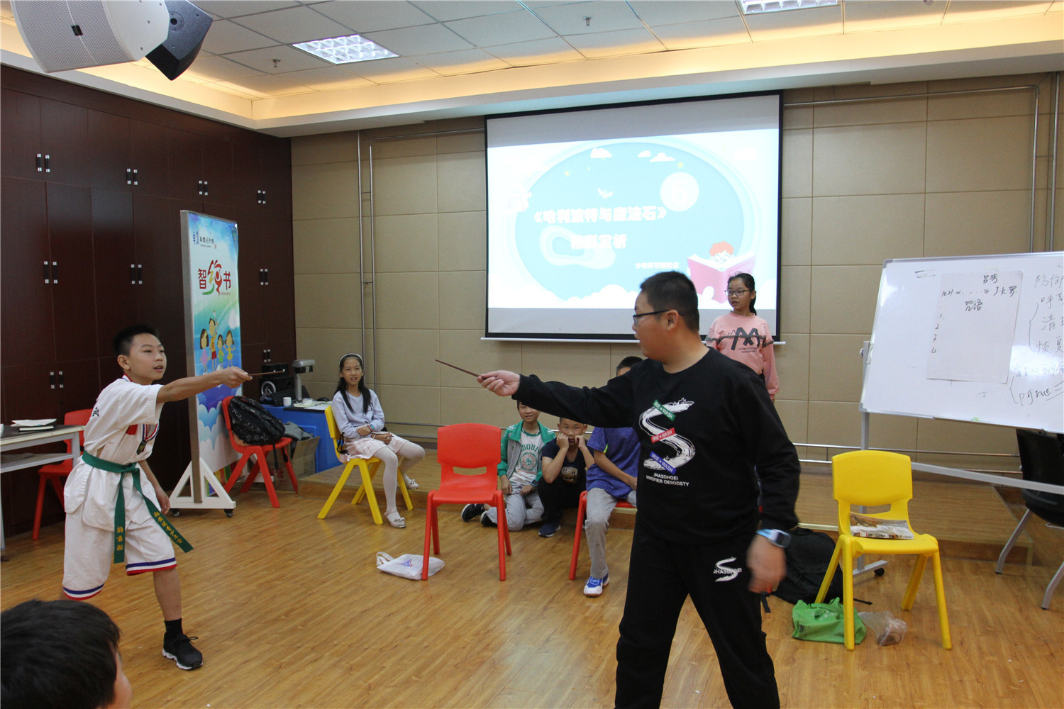 第4期活动的参与对象为小学五、六年级的学生,老师引导他们阅读《哈利波特与魔法石》,小读者都表现出对这本书的浓厚兴趣。在第一周的读书会上老师带着孩子们一起回顾书中人物和故事情节,并指导小读者不同书籍不同的摘记方法,引导大学摘记书中的“咒语”和“神奇生物”,并评选出一名摘记达人。在第二周的读书会上老师把哈利波特书系中的咒语拎出来,一边解释一边回顾书中情节和人物,通过“魔法变变变”的活动,分组让大家熟记咒语,制定好对战策略,两两出列分别使用咒语对抗,极大调动起了小读者的积极性。读书会上,老师指导小读者撰写读后感,填写“同读一本书”、“好书我推荐”卡片,其中郭昱麟成为本期“精读达人”。