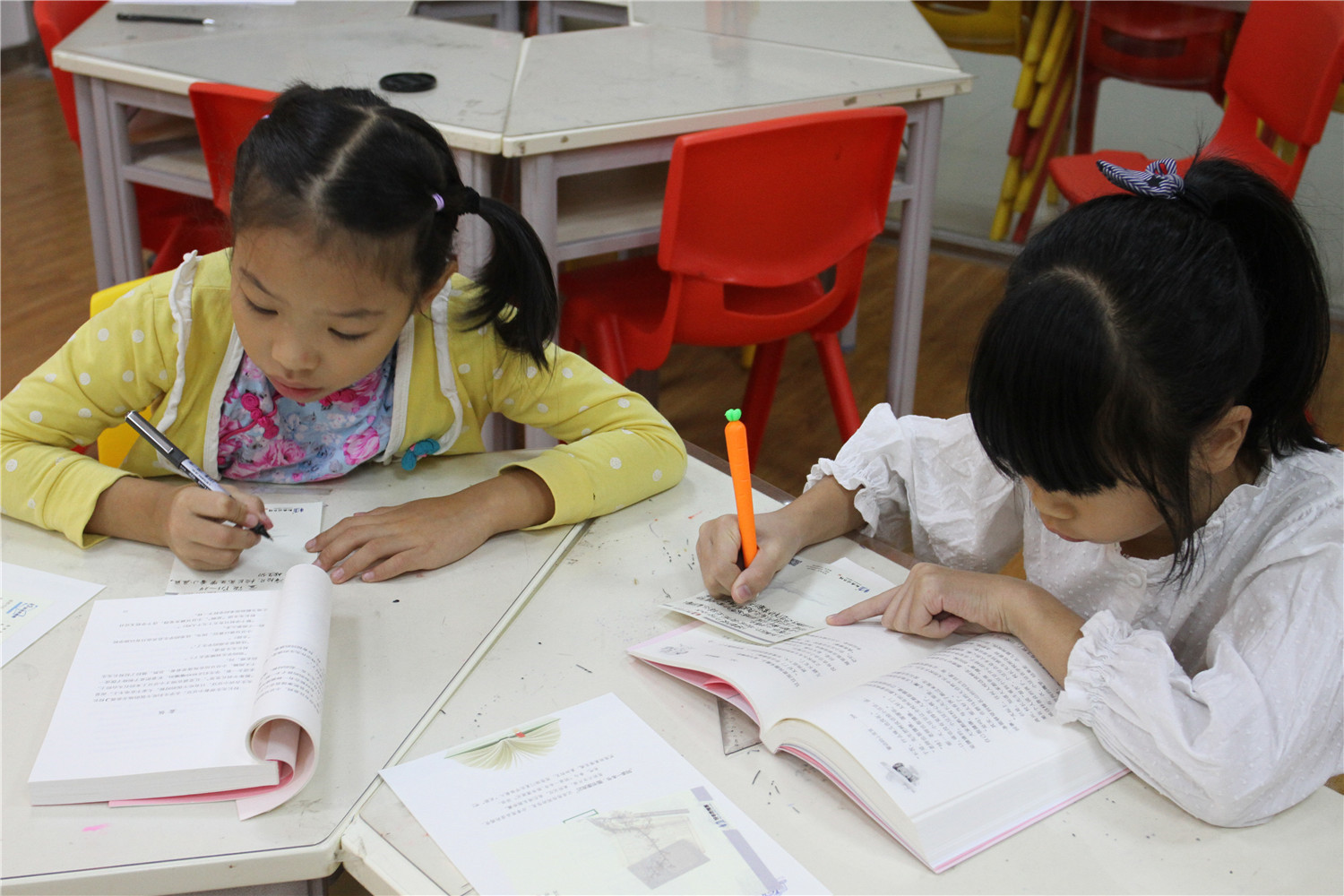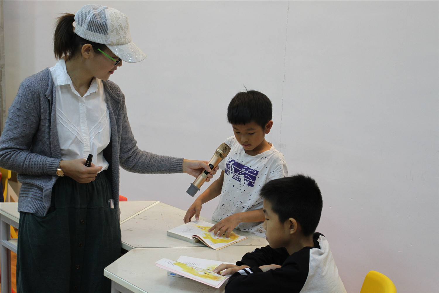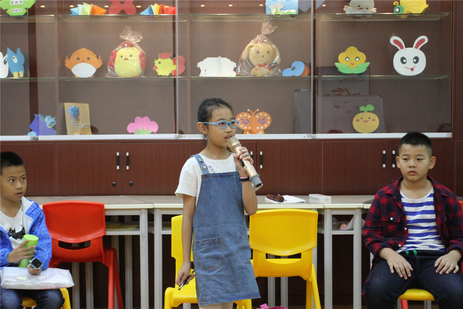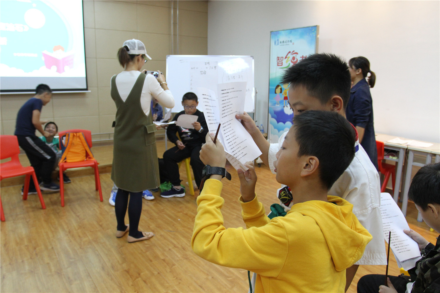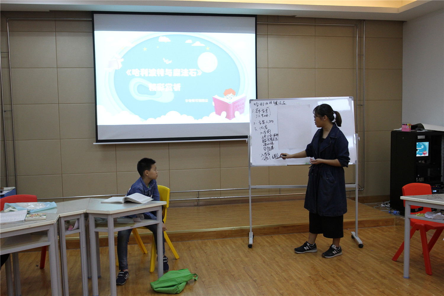 第4期活动的参与对象为小学五、六年级的学生,老师引导他们阅读《哈利波特与魔法石》,小读者都表现出对这本书的浓厚兴趣。在第一周的读书会上老师带着孩子们一起回顾书中人物和故事情节,并指导小读者不同书籍不同的摘记方法,引导大学摘记书中的“咒语”和“神奇生物”,并评选出一名摘记达人。在第二周的读书会上老师把哈利波特书系中的咒语拎出来,一边解释一边回顾书中情节和人物,通过“魔法变变变”的活动,分组让大家熟记咒语,制定好对战策略,两两出列分别使用咒语对抗,极大调动起了小读者的积极性。读书会上,老师指导小读者撰写读后感,填写“同读一本书”、“好书我推荐”卡片,其中郭昱麟成为本期“精读达人”。