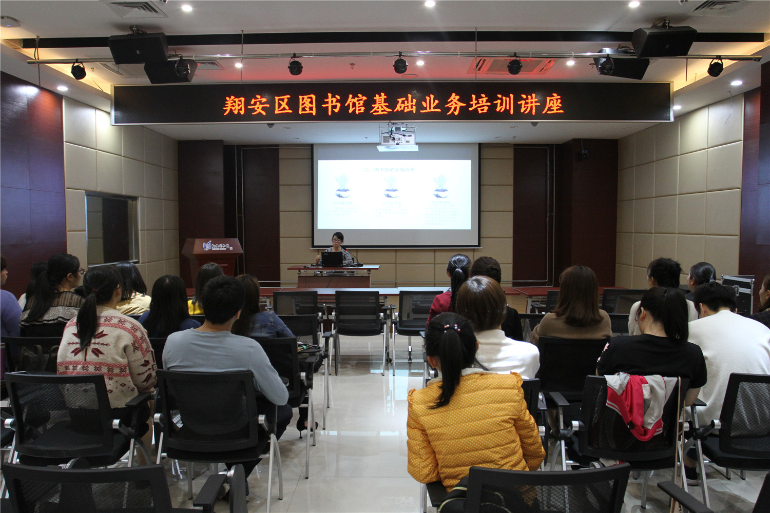 11月23日,翔安区图书馆召集总馆、分馆、邻里书屋全体工作人员在二楼报告厅参加“图书馆基本业务培训”讲座。