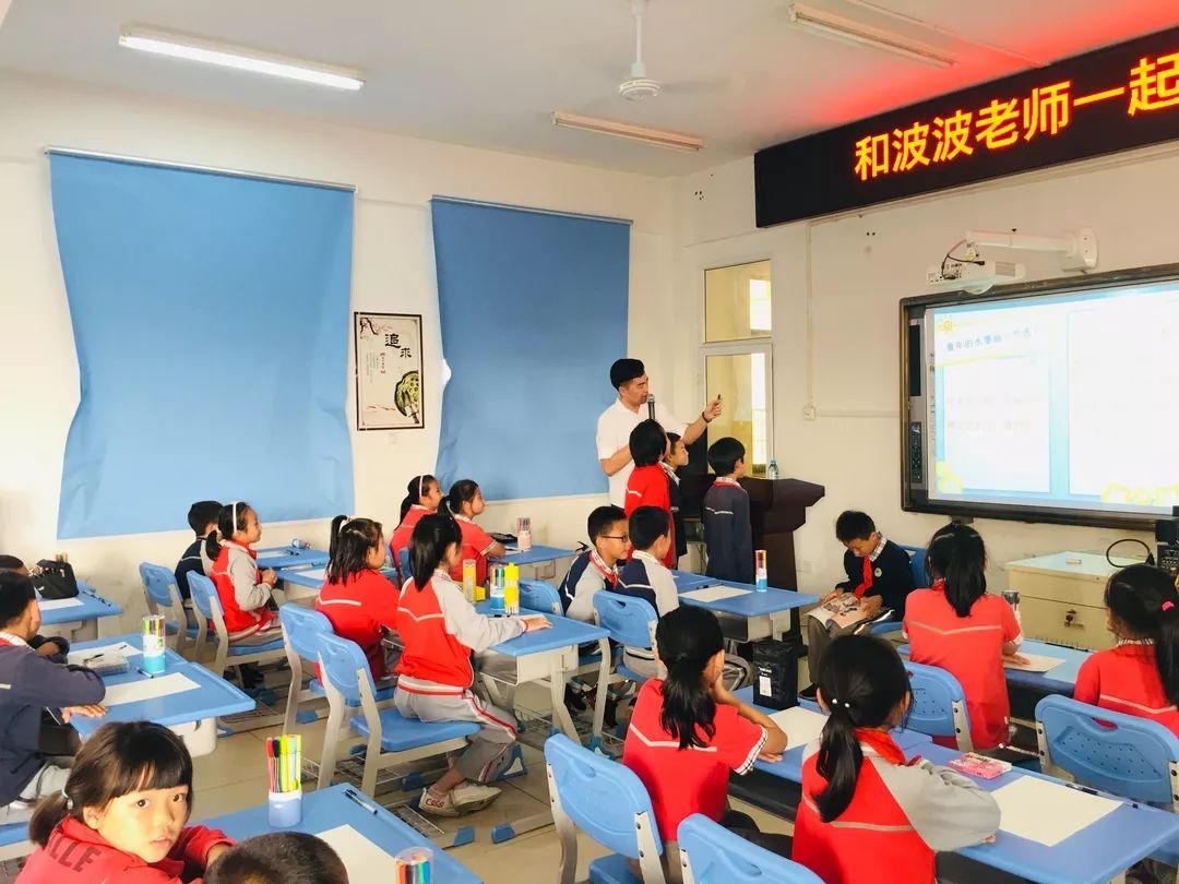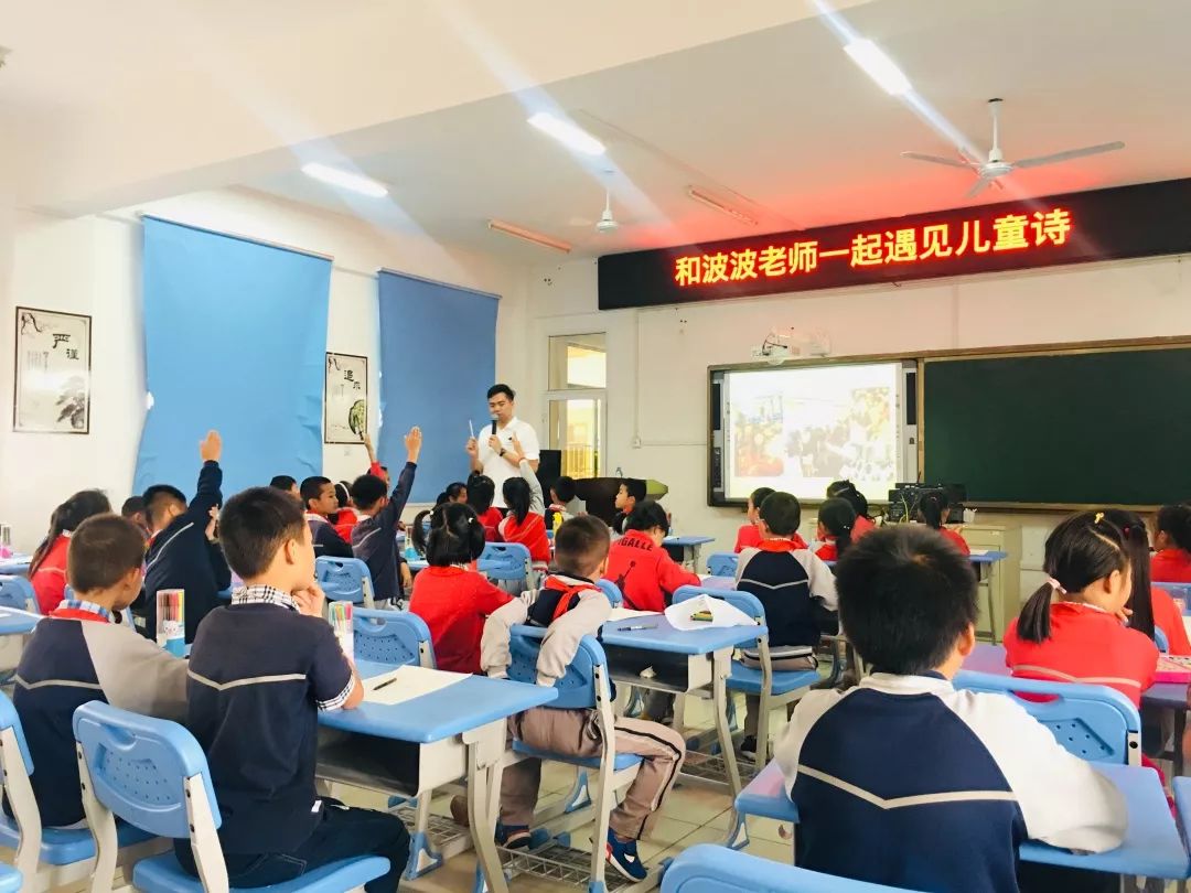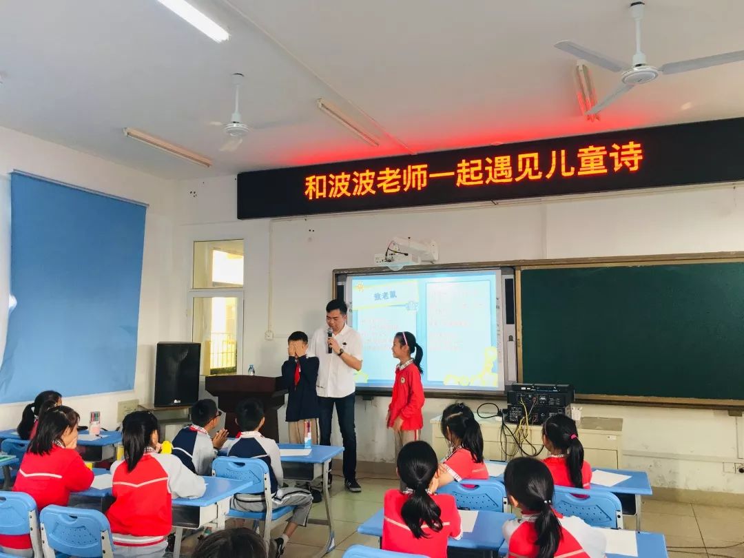 波波老师一开始就以轻松幽默的语气带领大家进入儿童诗的世界,让大家徜徉在诗歌的海洋里。《童年的水墨画》师生配合表演,将学生的注意力一下子就吸引到诗歌上。