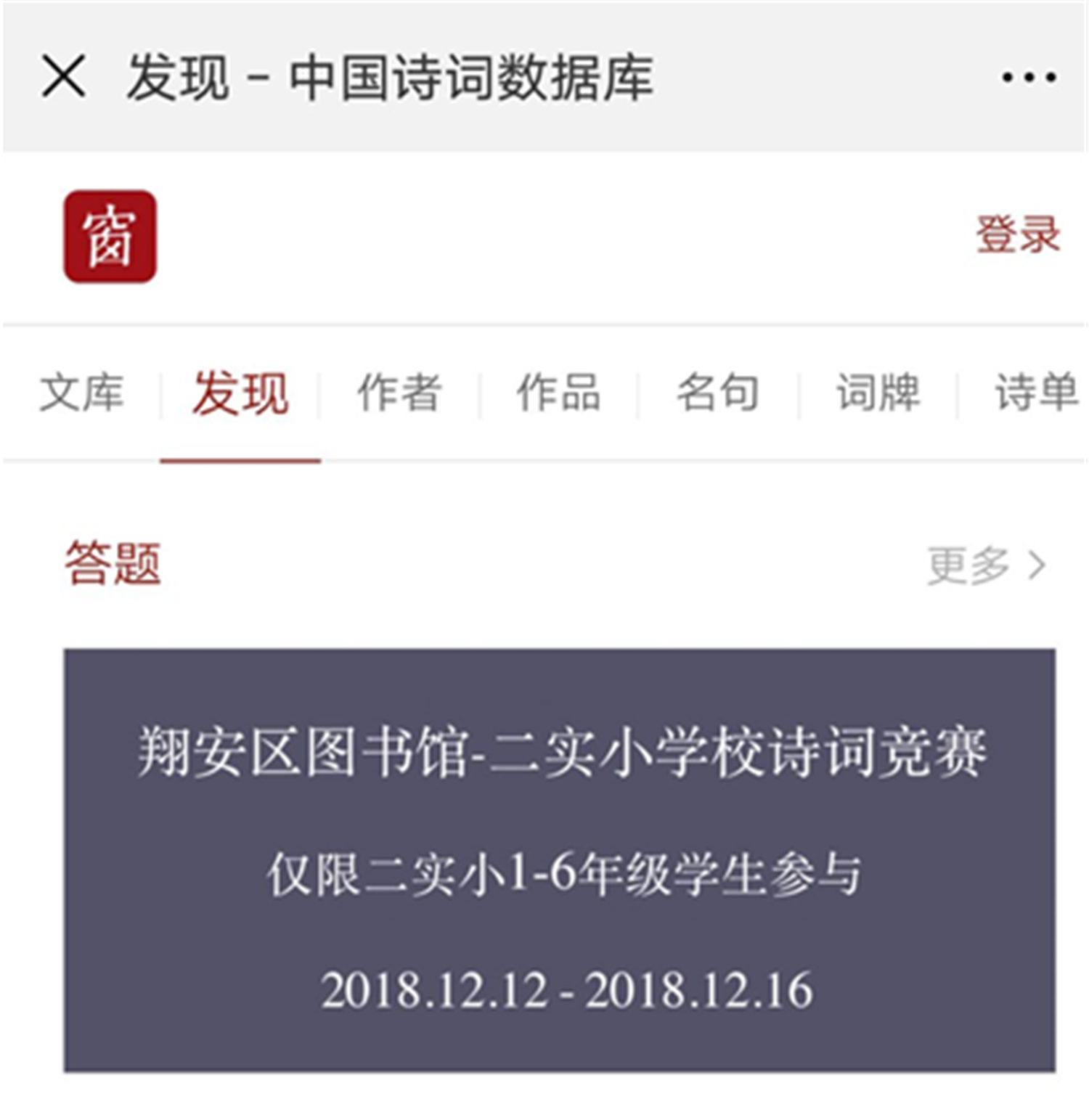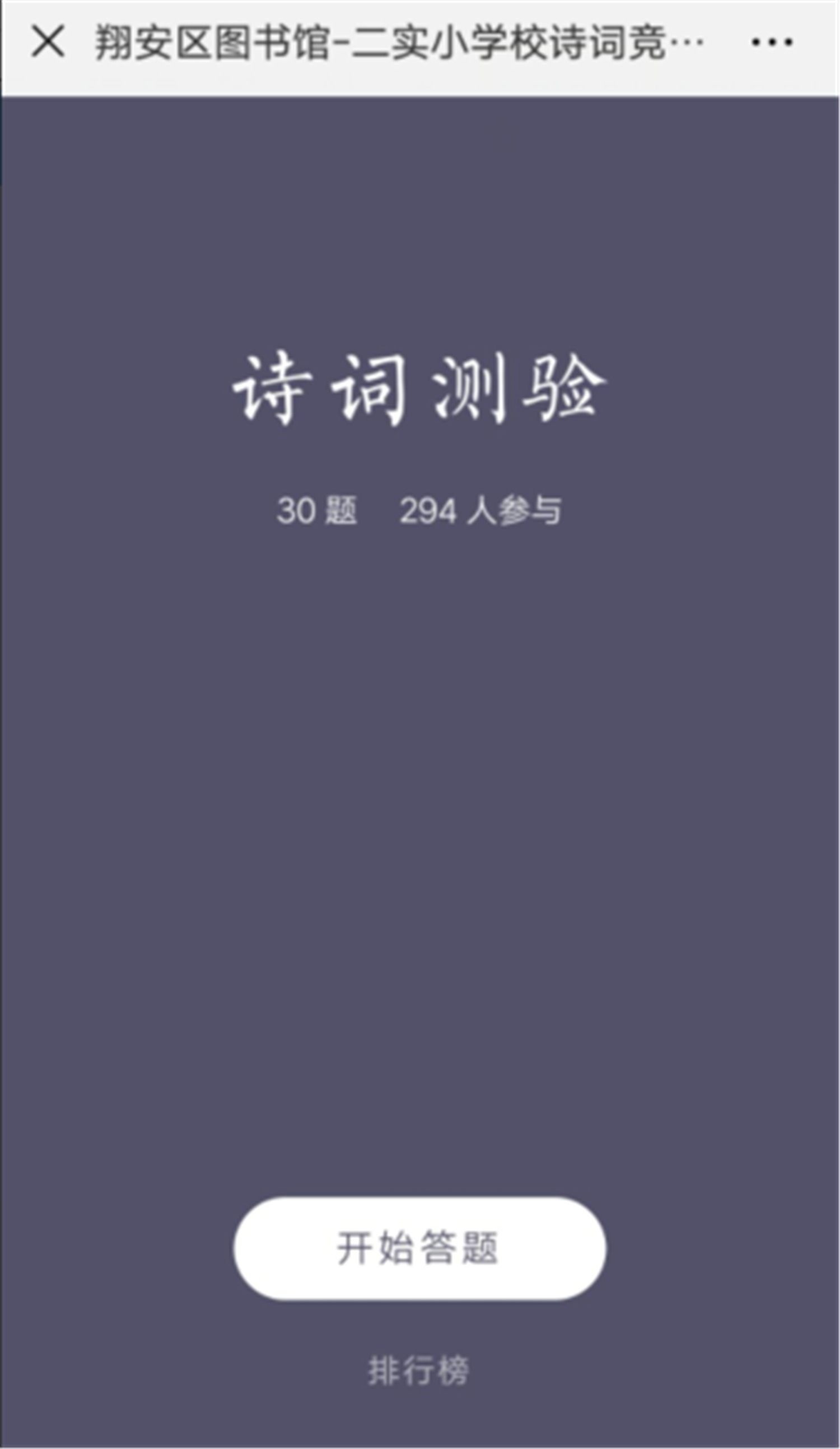 中华古诗词博大精深,意存高远,学习经典诗词,可以开阔学生的视野,净化学生的心灵,丰富学生的精神世界,全面提升学生的素质。12月12日-12月16日,在翔安区图书馆联合翔安第二实验小学举办第一届“传统文化进校园——中华古诗词线上线下知识大比拼”活动中,通过中华诗词库平台线上比赛—共有290多名学生参赛,最终评选出20名优胜者参与线下比拼。