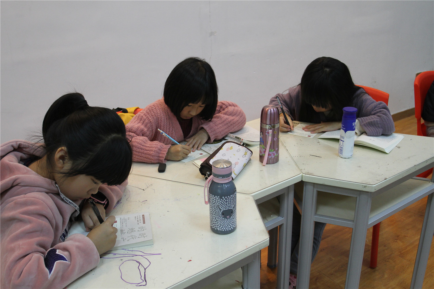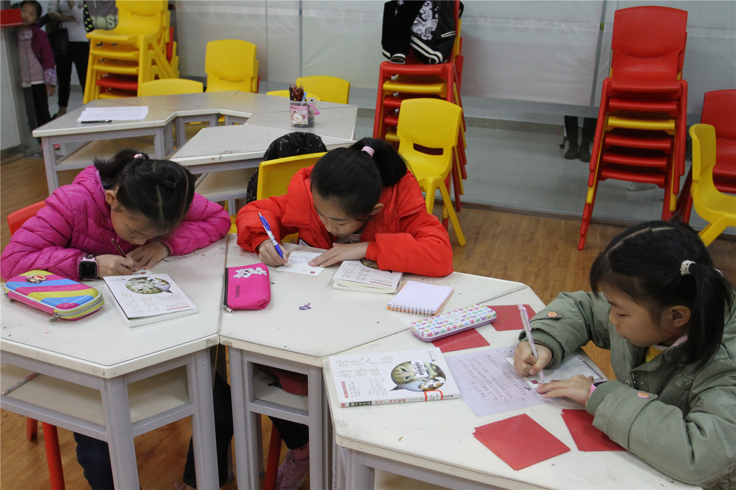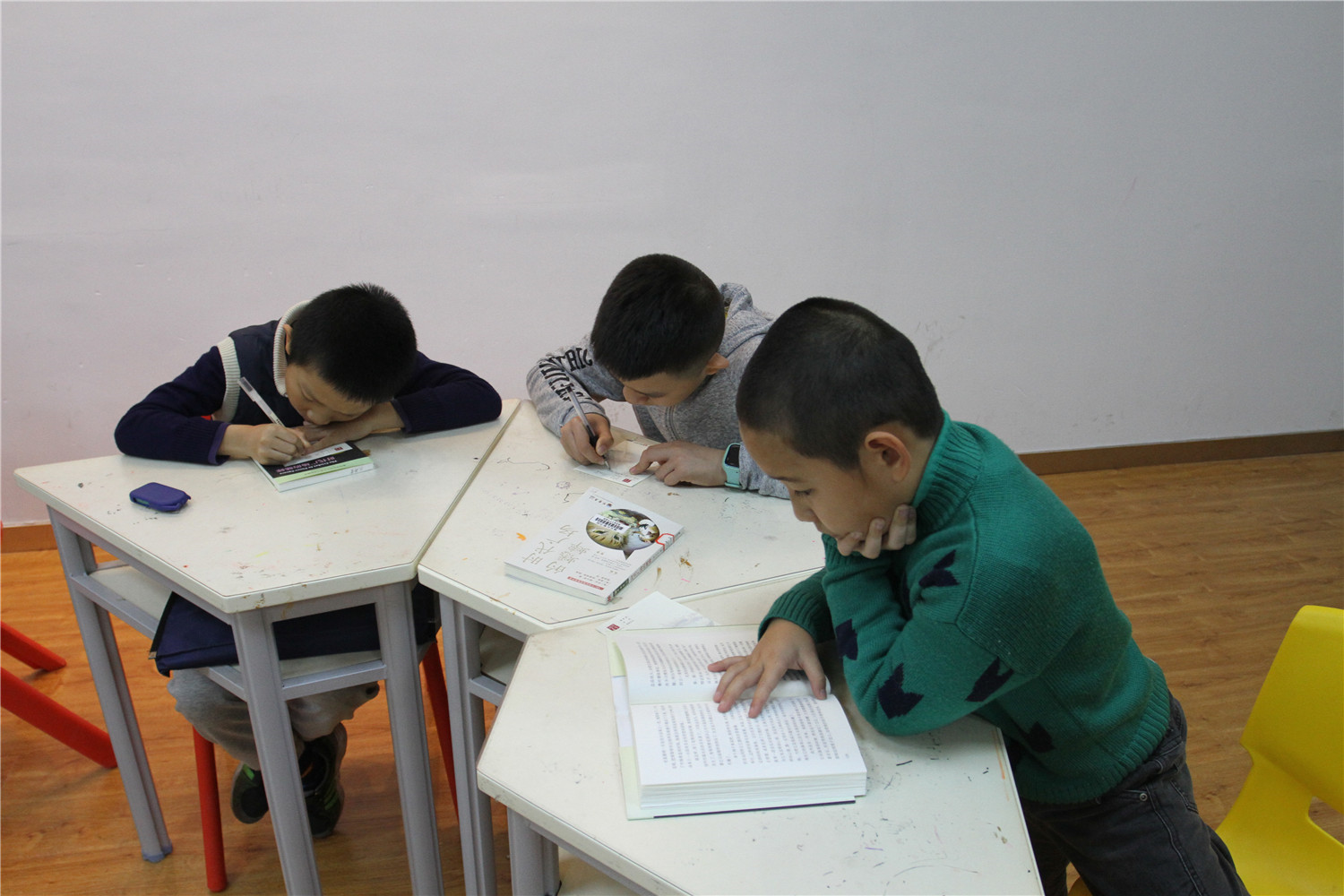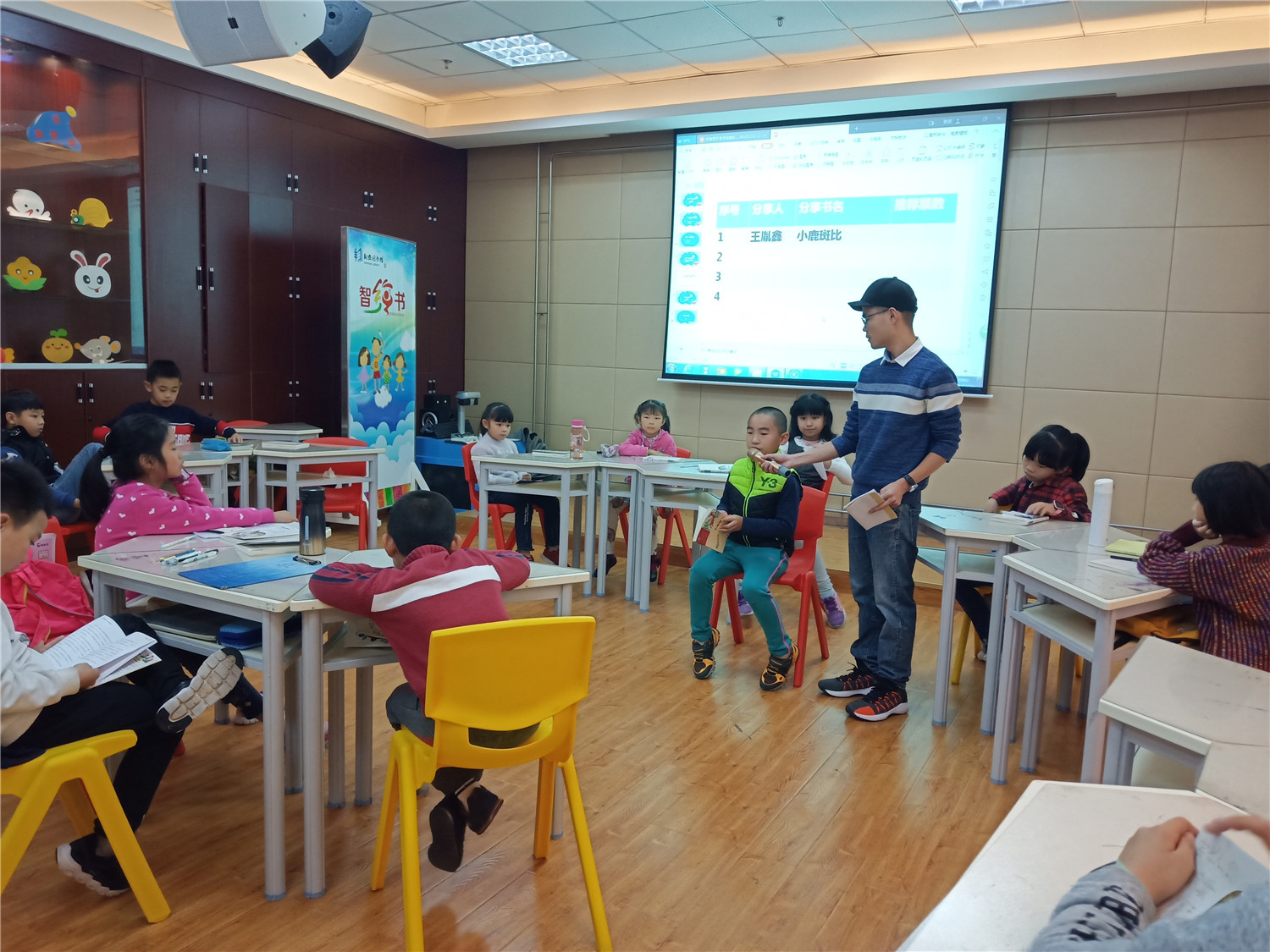 读书会活动中,老师指导小读者撰写读后感,填写“同读一本书”、评选出张晧宇、陈彦彤、傅思婕、郭坤泽四位小读者为精读达人。