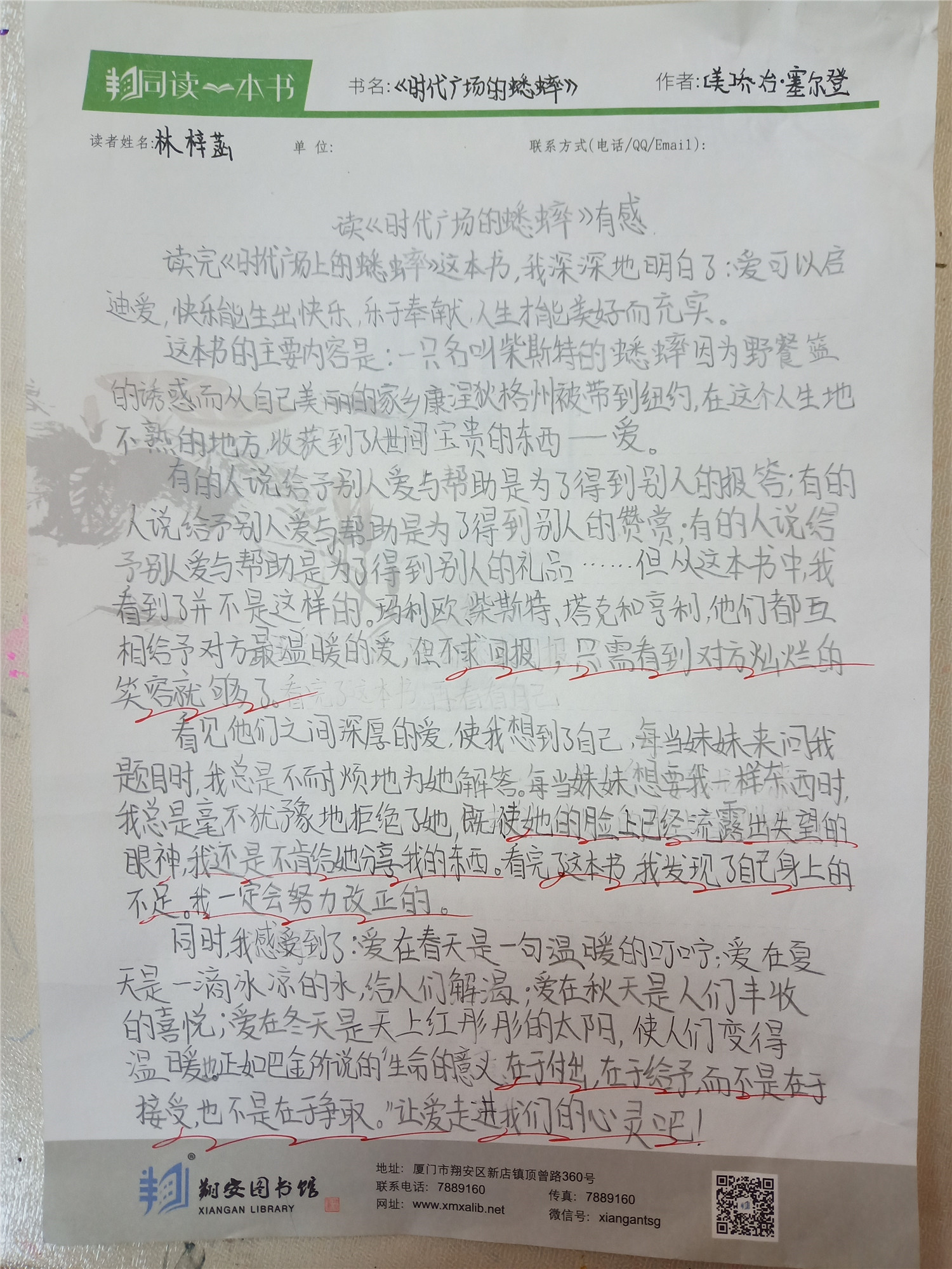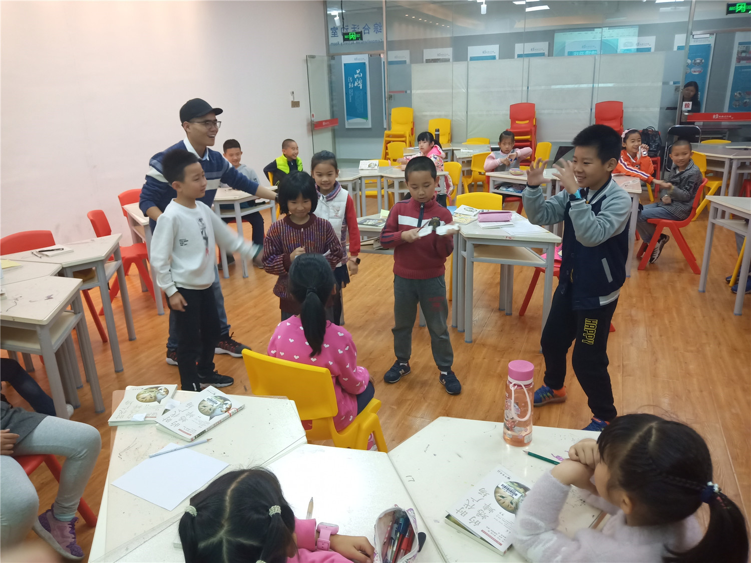 第7期活动的参与对象为小学三、四年级的学生,阅读书目为《时代广场的蟋蟀》。第一周的阅读活动由老师带领孩子们分析书中各个角色的性格品质,把书中主要故事情节串起来,再通过摘记捡拾好词好句,最后的读后感让孩子们谈谈从书中理解到的友情的意义。第二周的读书会中由老师先带领孩子们回顾故事的主要情节,引导大家提出自己的疑问,然后通过“开书店”、“放学路上的交流”和“采访作者”三个活动让孩子们对自己提出的问题自己解答。