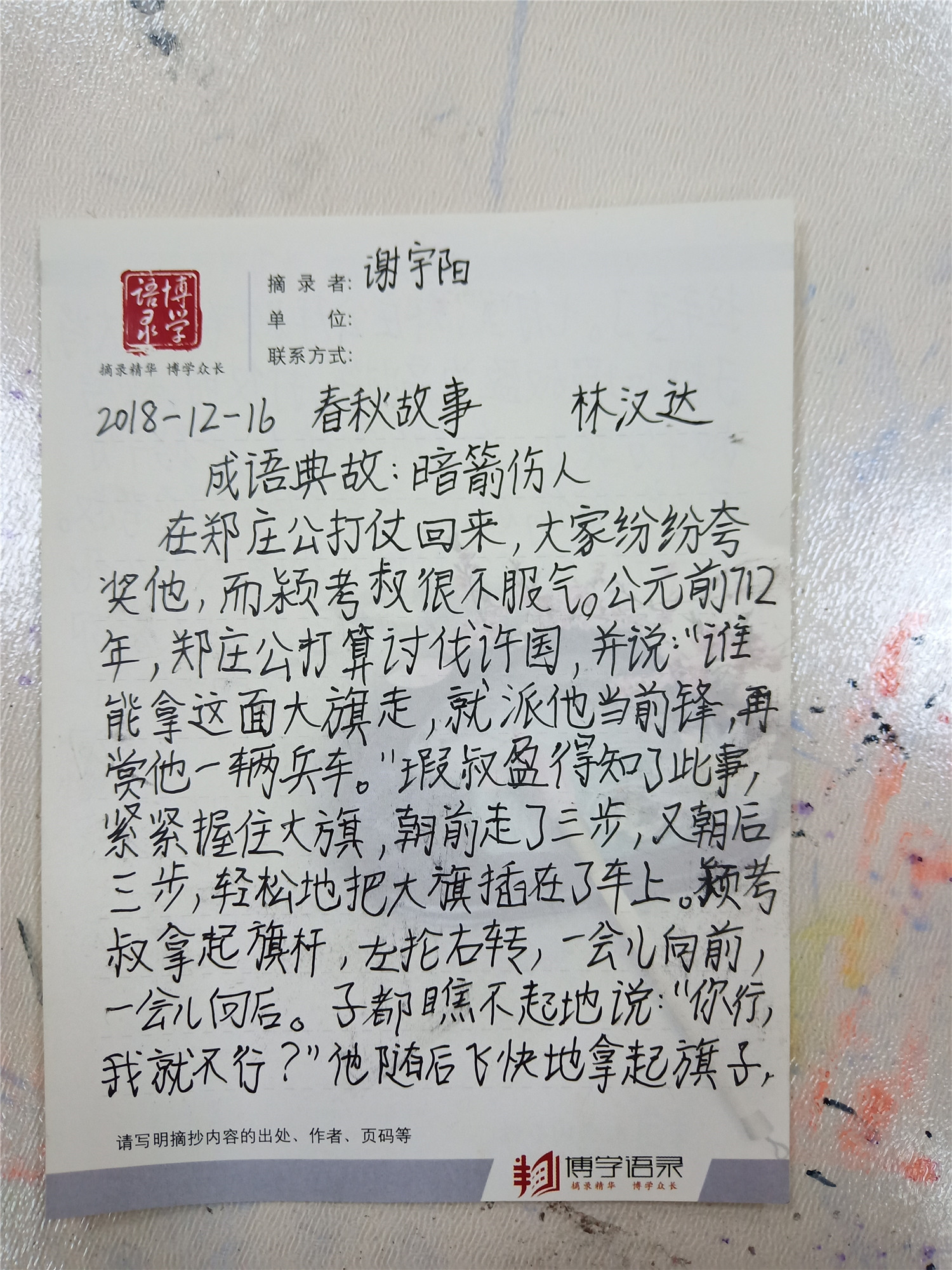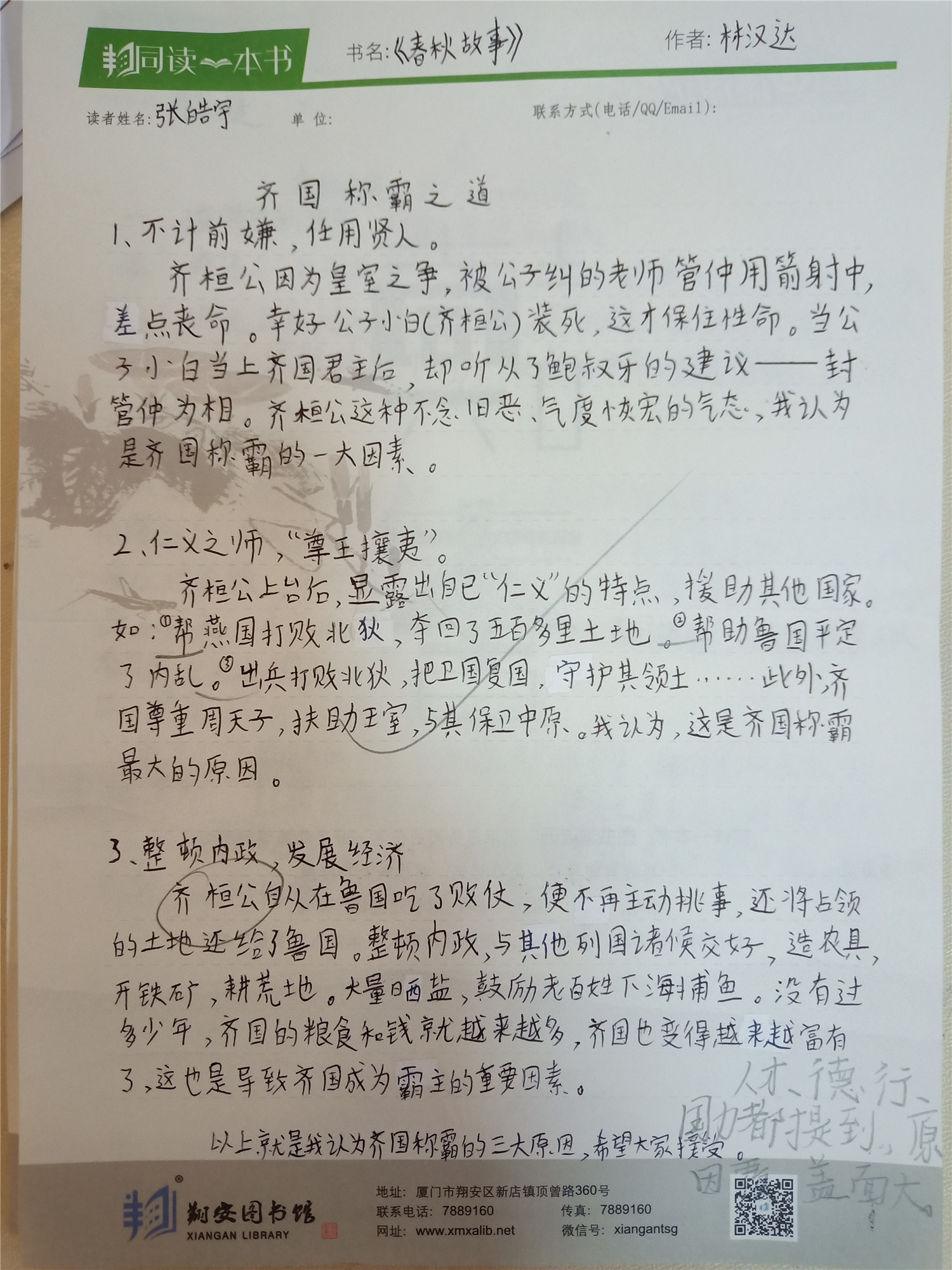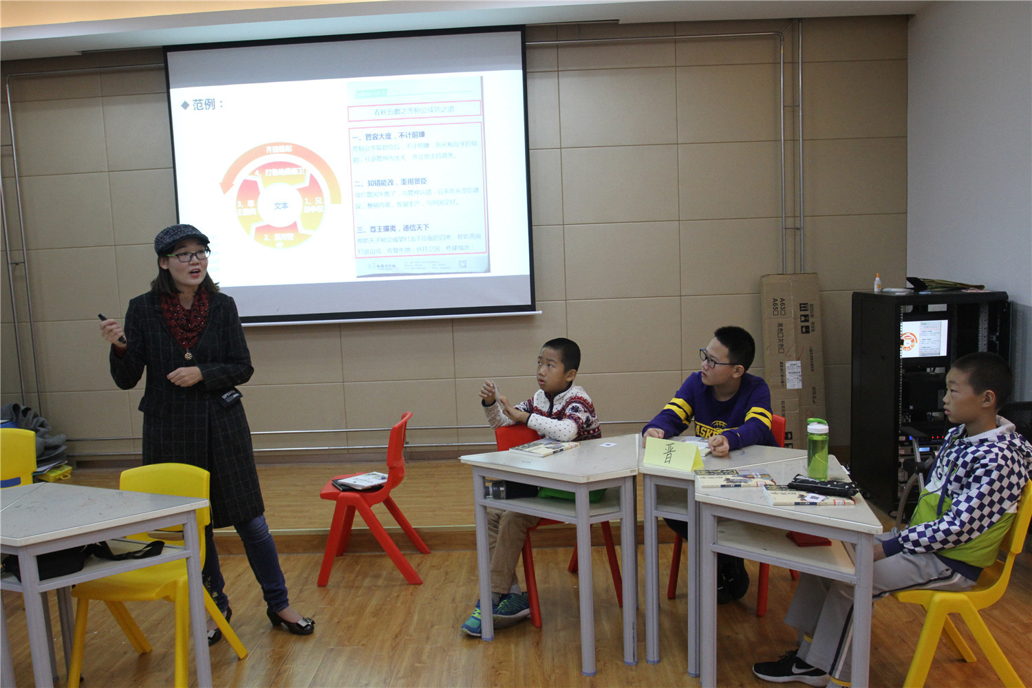 第8期活动的参与对象为小学五、六年级的学生,阅读书目为《春秋故事》。第一周的阅读活动由老师讲述春秋五霸出现的历史背景,然后把学员分成六个小组,分别扮演春秋时期的周及五个霸主国。最后由“各国”体验“史官”的角色,分别摘记自己国家流传千古的成语典故,这样就完成了摘记的读书任务,通过完成读后感让孩子们分析霸主成功之道。其中谢宇阳、陈彦彤、罗一凡三位小读者评为最佳“史官”。