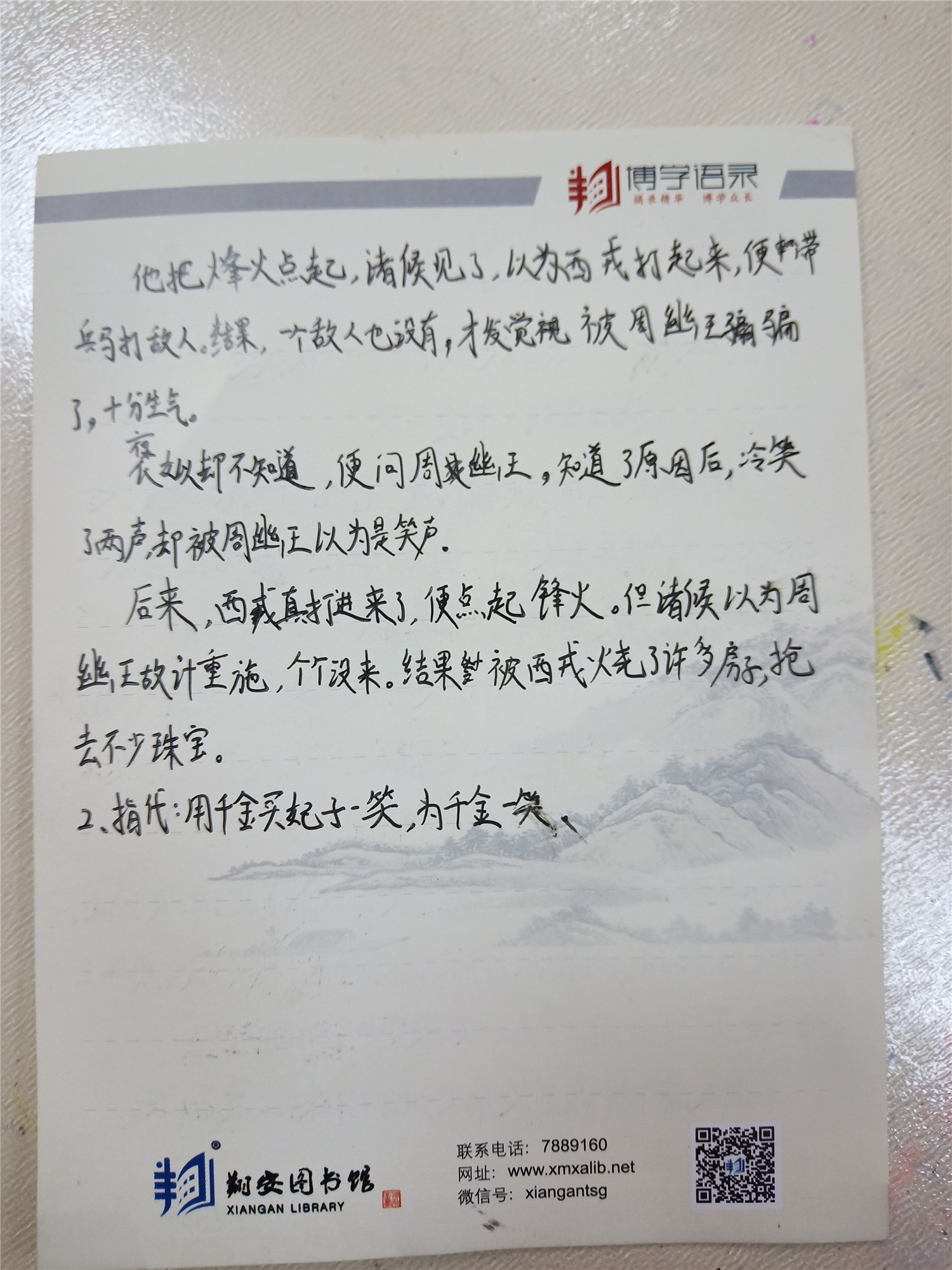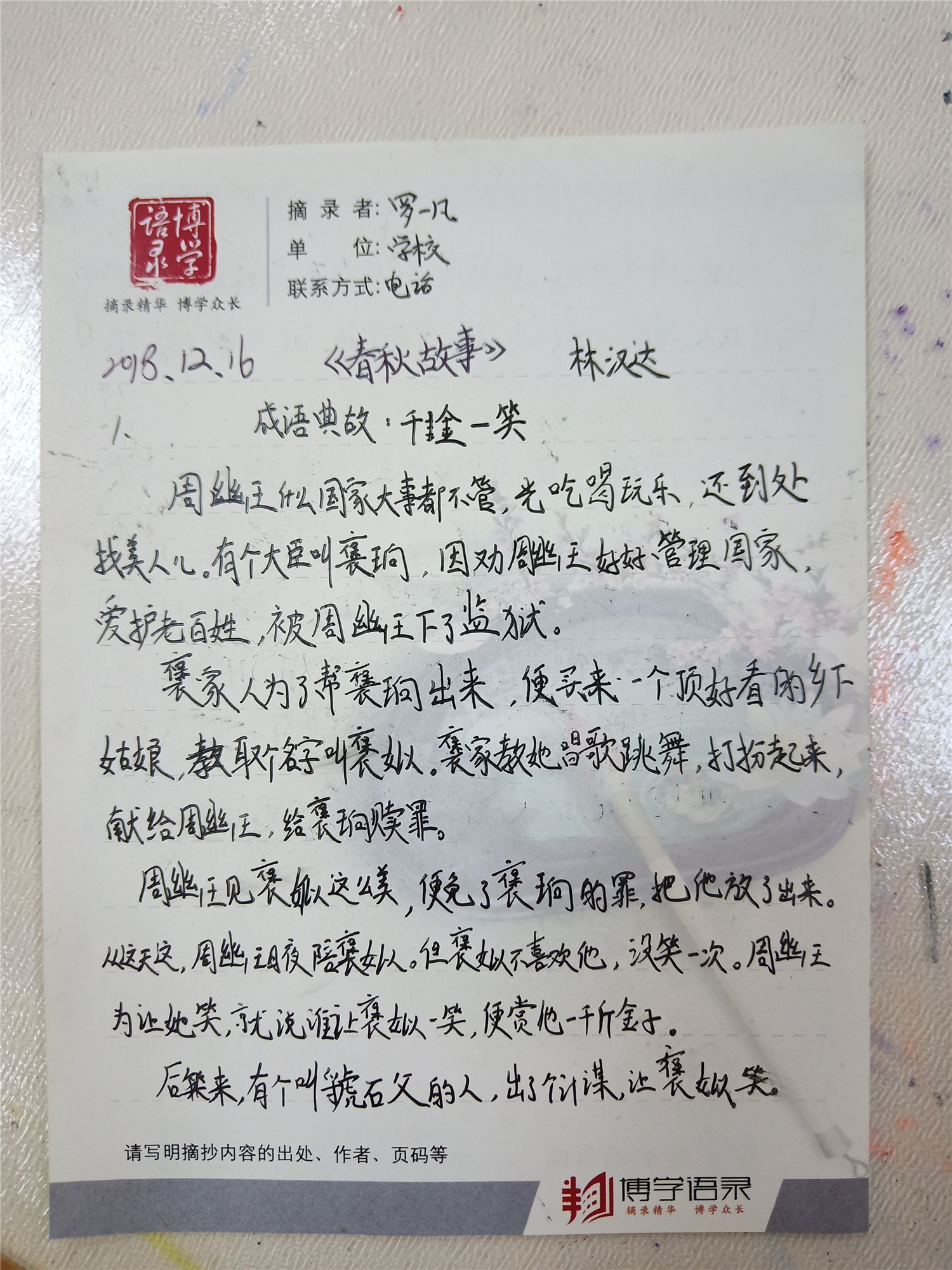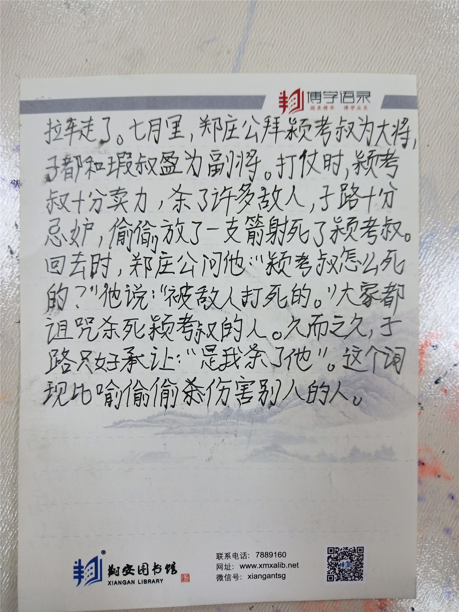 第8期活动的参与对象为小学五、六年级的学生,阅读书目为《春秋故事》。第一周的阅读活动由老师讲述春秋五霸出现的历史背景,然后把学员分成六个小组,分别扮演春秋时期的周及五个霸主国。最后由“各国”体验“史官”的角色,分别摘记自己国家流传千古的成语典故,这样就完成了摘记的读书任务,通过完成读后感让孩子们分析霸主成功之道。其中谢宇阳、陈彦彤、罗一凡三位小读者评为最佳“史官”。