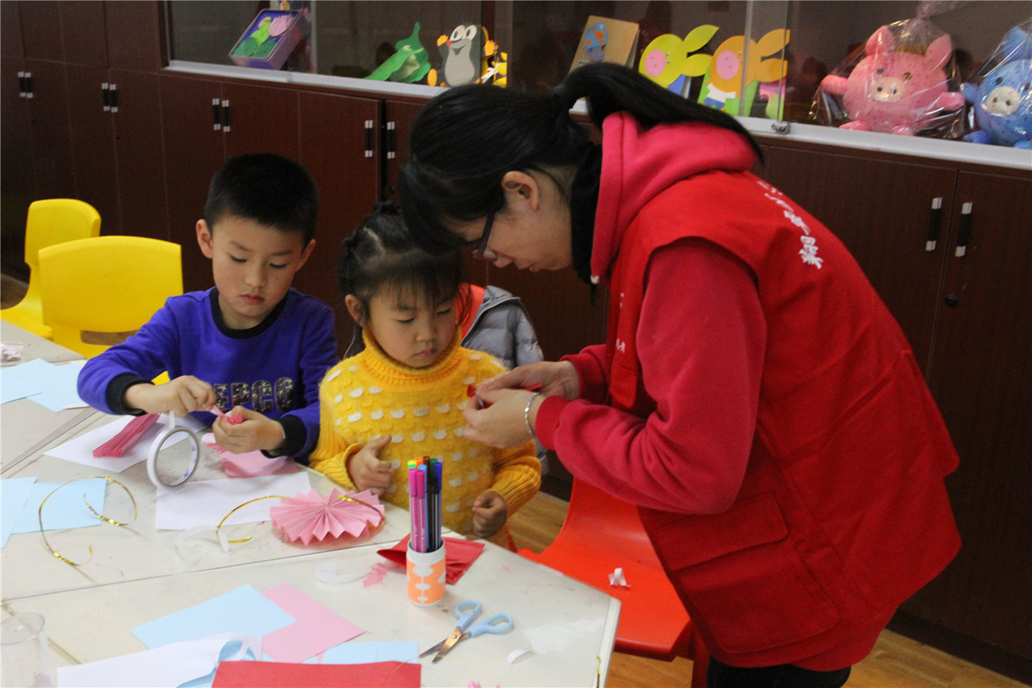 2019年1月6日,翔安区图书馆新店分馆举办了“故事妙妙屋”活动。春节是中国人心目中最最重要的节日,春节将近,也是一家人恣意释放亲情、享受亲情的日子;此次老师为小朋友讲述了《团圆》的绘本故事,在这个故事里让小朋友们感受到了一个家庭在春节期间的甜蜜浓浓,父母子女之间的亲情是如此纯真美好。希望每个家庭都团团圆圆。故事结束后,老师教小朋友做出了一盏盏的红灯笼。