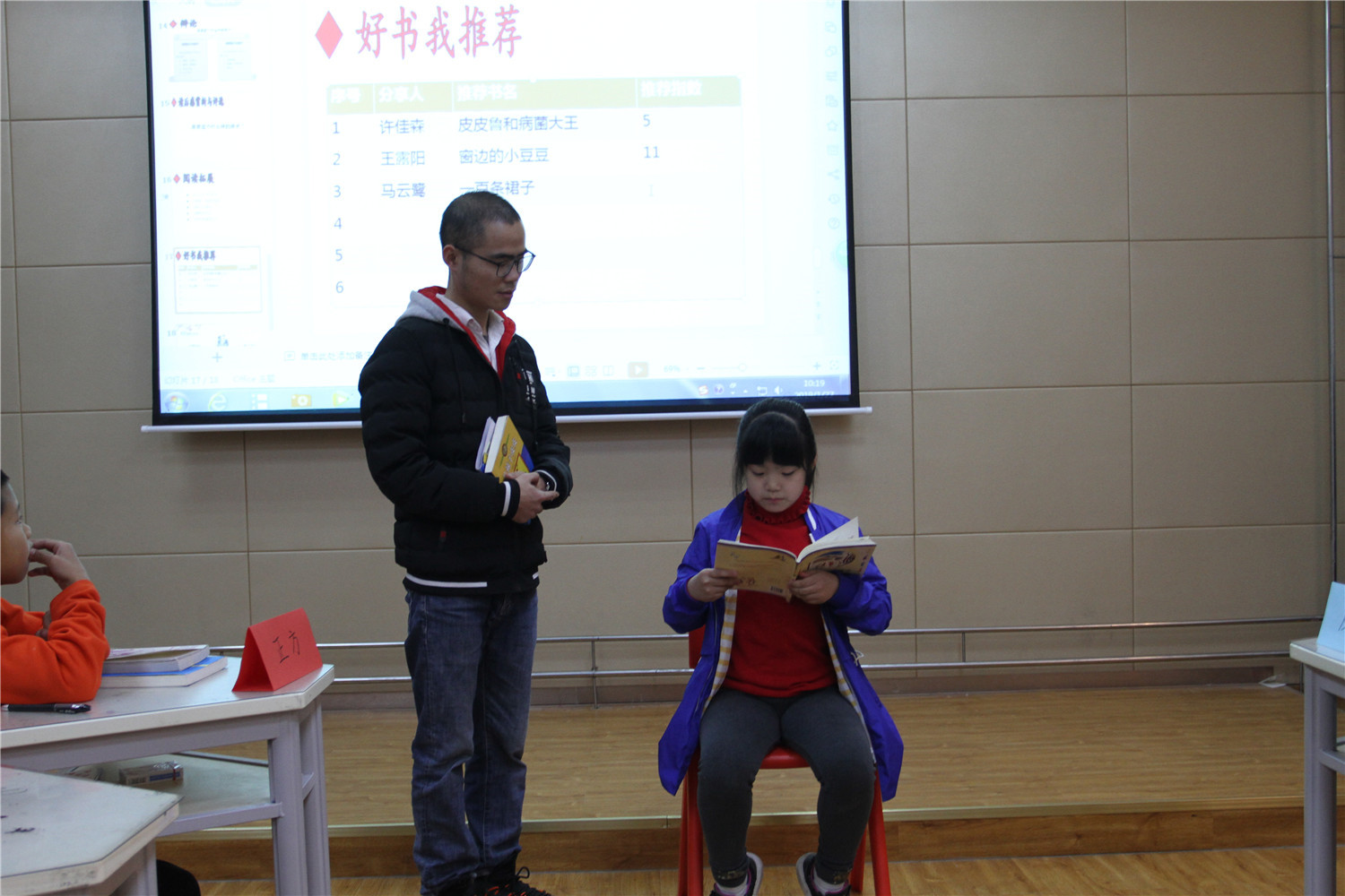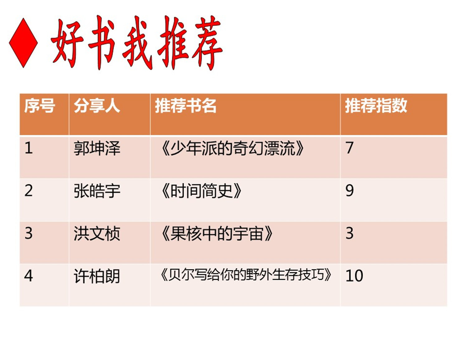 “好书我推荐”环节,许柏朗同学分享的《贝尔写给你的野外生存技巧》当选为本期人气图书。