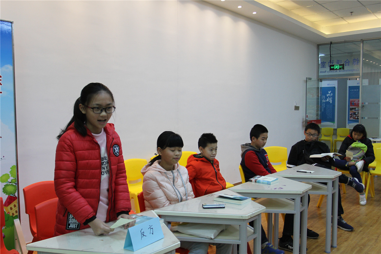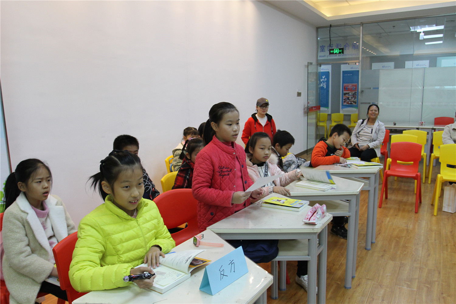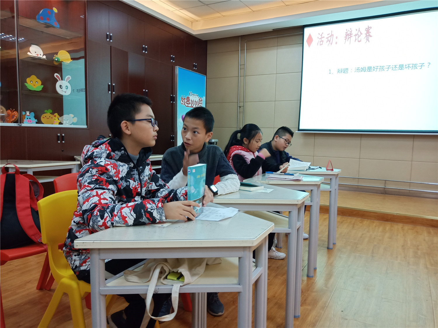 在第二天的活动中,老师带领小读者们举行了一场“汤姆是个好孩子还是坏孩子?”的辩论赛,让小读者们提前准备(写读后感),依据准备情况选出正、反方各四位辩手,辩论赛分为立论、自由辩论和结辩三个环节,其他小读者当观众,分别于每个环节后投票支持哪一方的观点。正反方四位辩手在自由辩论环节打得异常激烈,思考很有深度,这场辩论锻炼了小读者们的思辨能力、总结概括能力和团队合作能力。最后,辩论赛以观众投票数确定反方为胜!在辩论赛尾声,老师引导大家把对人物的分析上升到更深的哲学领域——马克思主义哲学的辩证思想和发展眼光看问题,了解每个人、每件事都有好的方面,也有坏的方面,然而只要我们用发展的眼光看待事情,面对问题,都能把坏的一面变成好的。