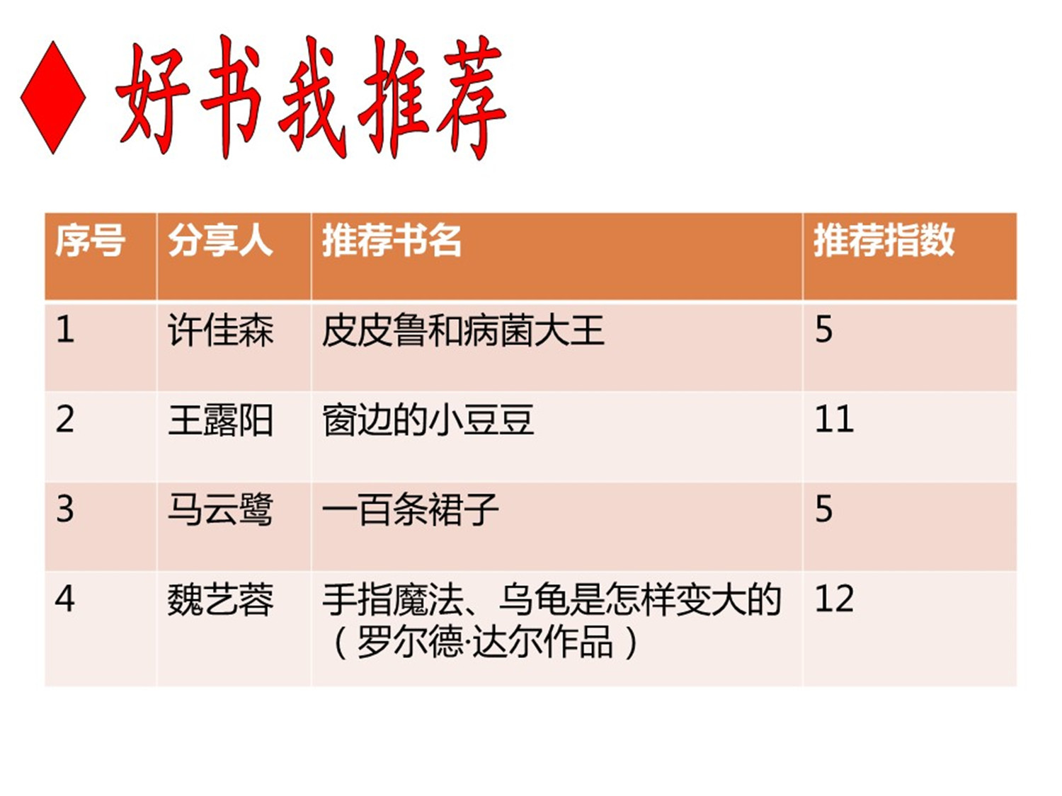 “好书我推荐”环节,魏艺蓉同学分享的罗尔德达尔的系列小说当选为本期人气图书。三位小读者成为本期精读达人。5位小读者被评为最佳辩手。