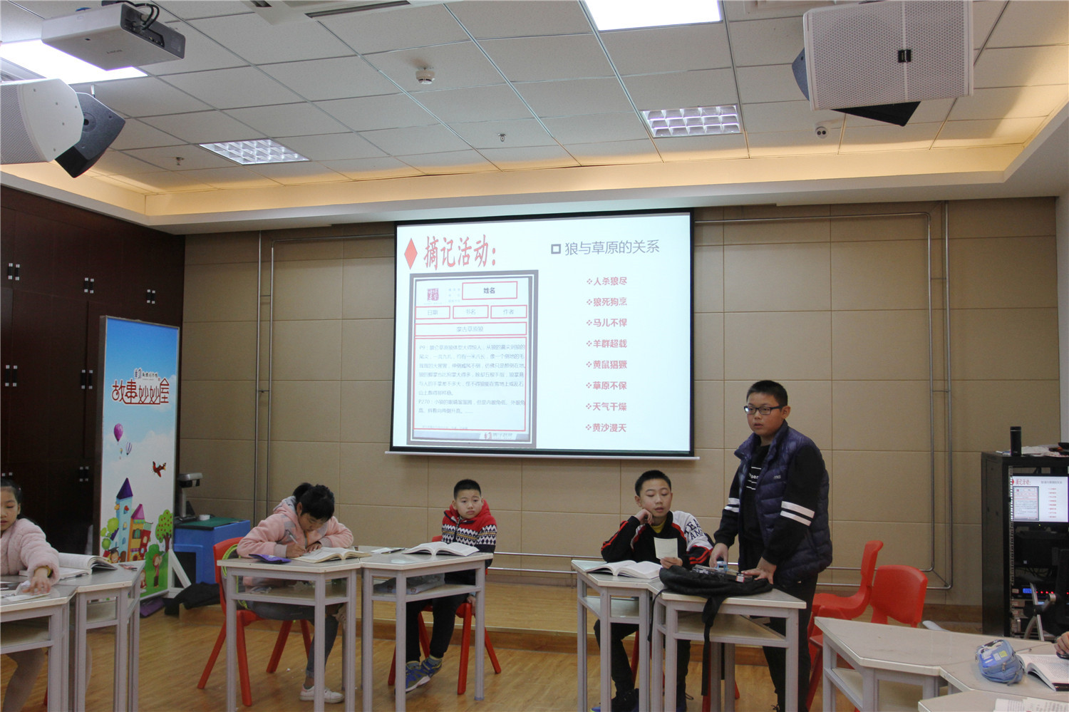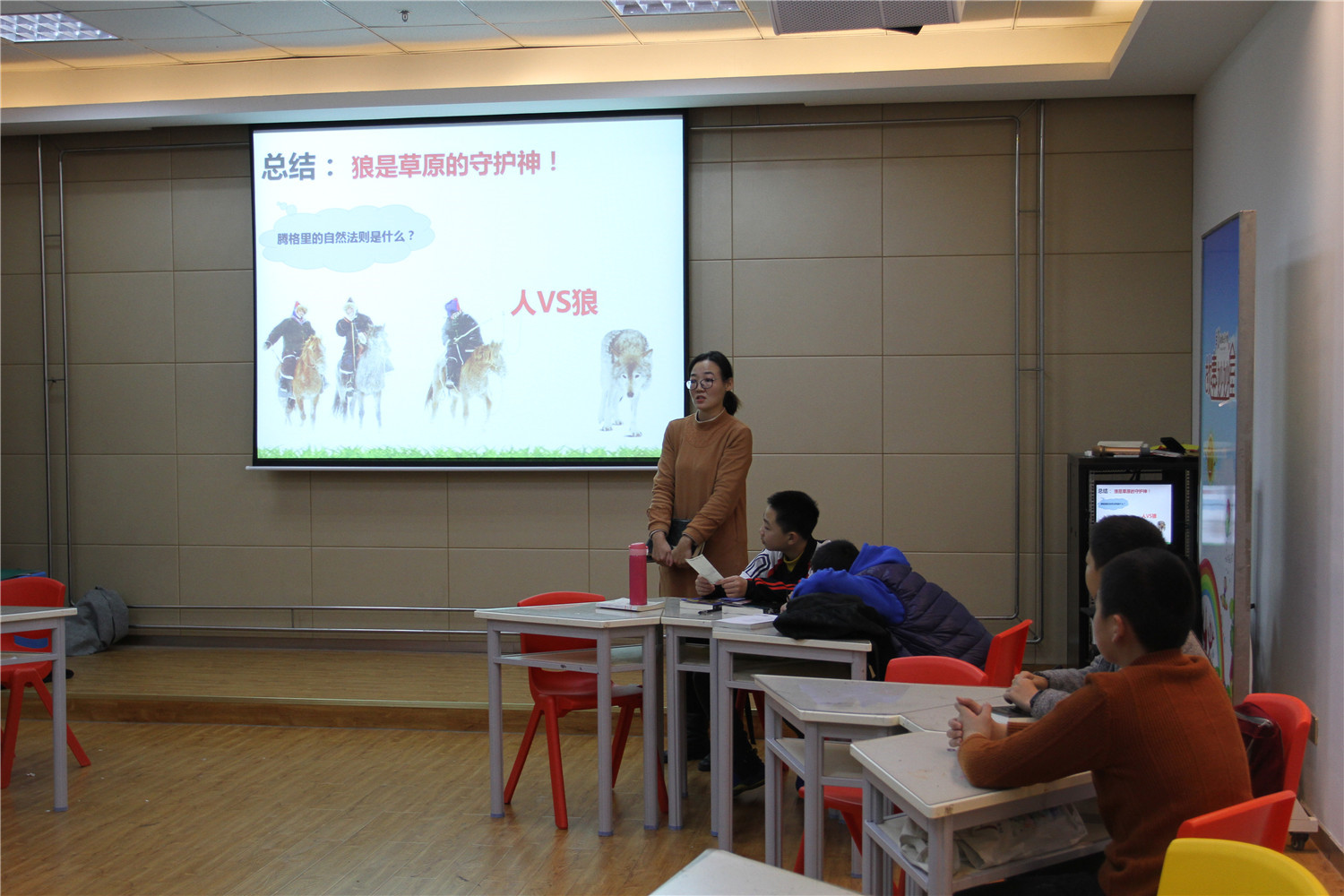 在第二场活动中,老师带领小读者们观看了据小说改编的《狼图腾》电影片段——狼马大战,十分钟的感官刺激,让小读者们对小说关于此部分的描述有了更形象的想象。将电影片段与小说原文进行比对分析后,小读者们一致认为阅读小说能给我们更加丰富的想象空间,小说内容也比电影更加精彩激烈。接着,领读老师引导小读者们分享“狼群是如何把军马群逼入绝境的?”从而总结出十多条我们要跟狼学习的地方。最后,大家纷纷分享自己从书中读到的、感触最深的狼故事,一起重新认识了狼这个物种。