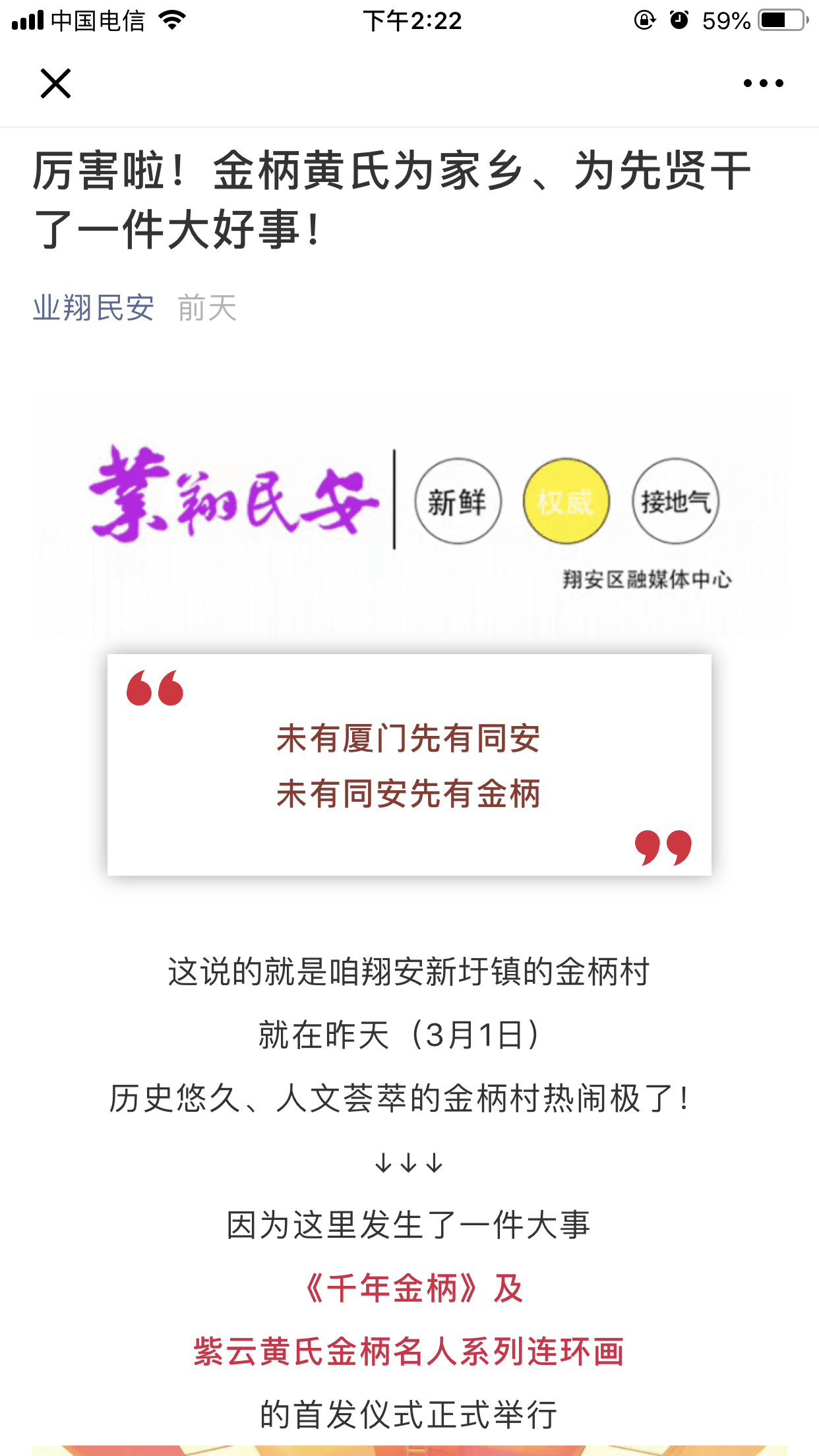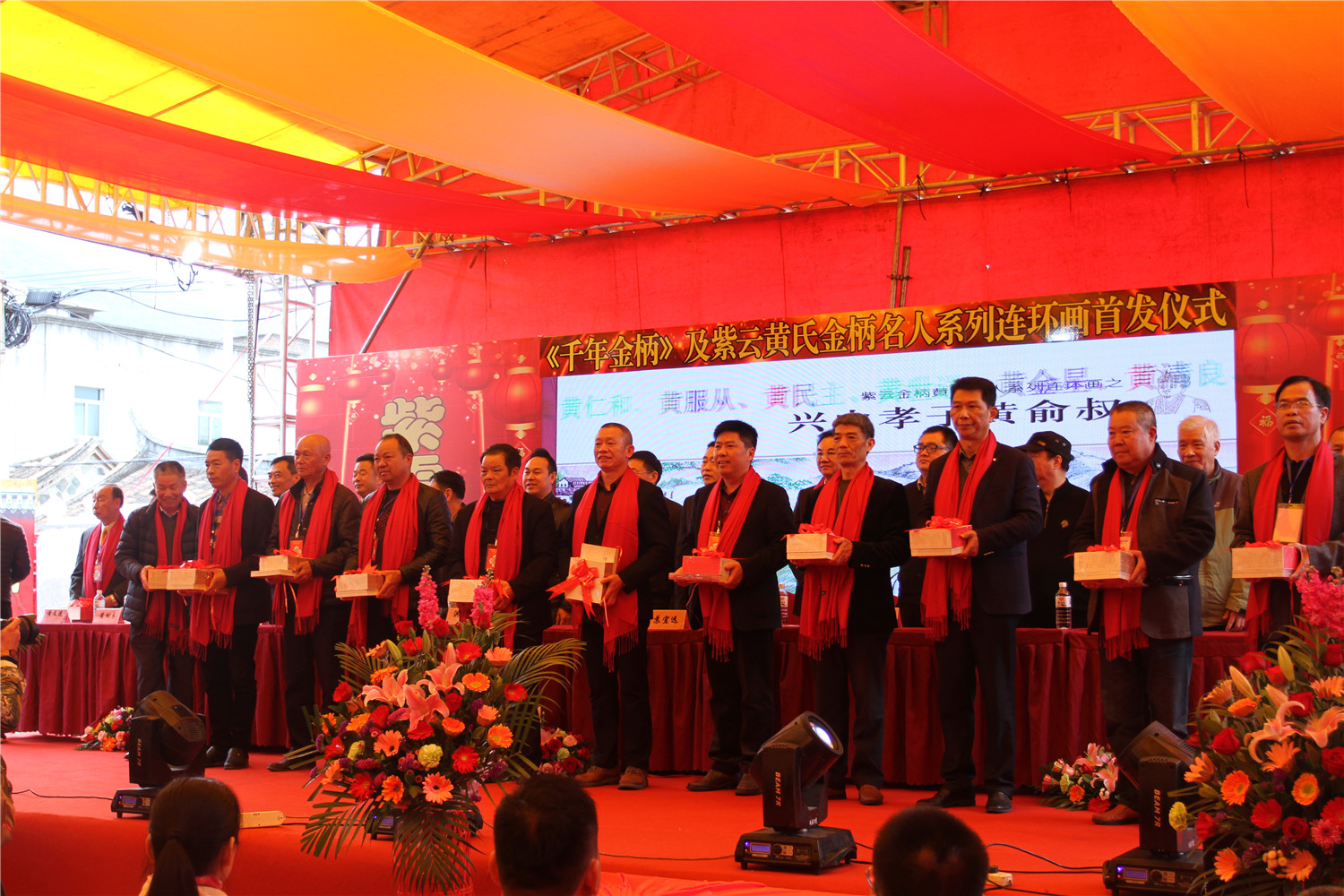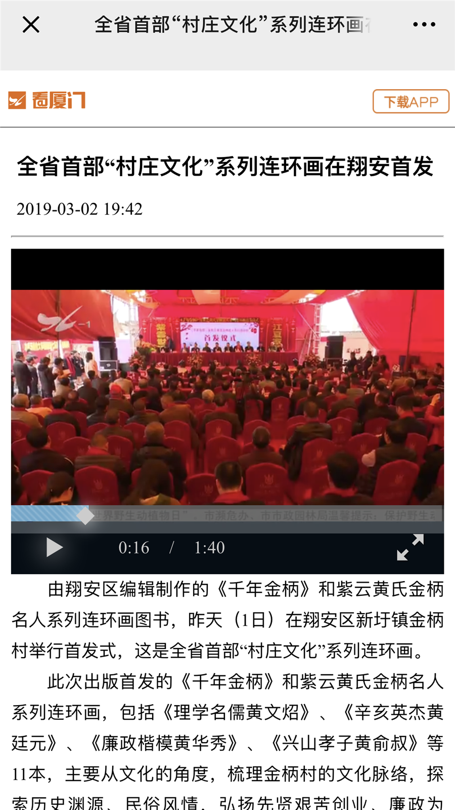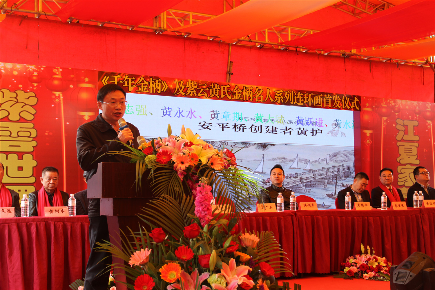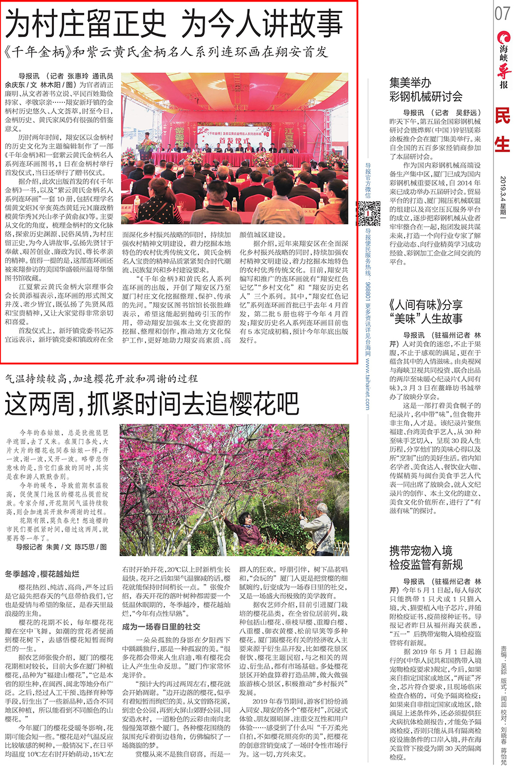 3月1日上午,翔安区举行《千年金柄》及紫云黄氏金柄名人系列连环画首发仪式。区委宣传部、区文体广电出版旅游局、新圩镇党委政府领导以及相关村居书记、主任、老人协会会长和黄氏宗亲代表500余人出席了首发仪式。