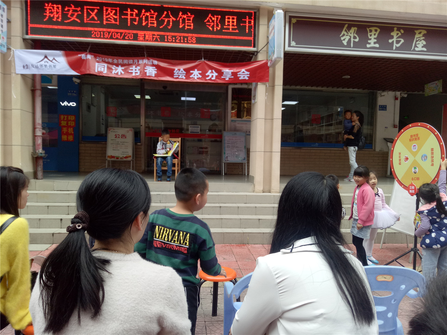 活动首先开展了阅读书籍推荐、故事分享会的环节,让小读者们以讲故事的形式跟大家分享读书的浓浓乐趣,现场小读者踊跃上台,展现自己的才艺。活动还设有知识转转乐的环节,转盘上有脑筋急转弯、绕口令、图书馆知识竞答、亲子游戏等关卡,更是让大家一起在学与玩,玩中乐。