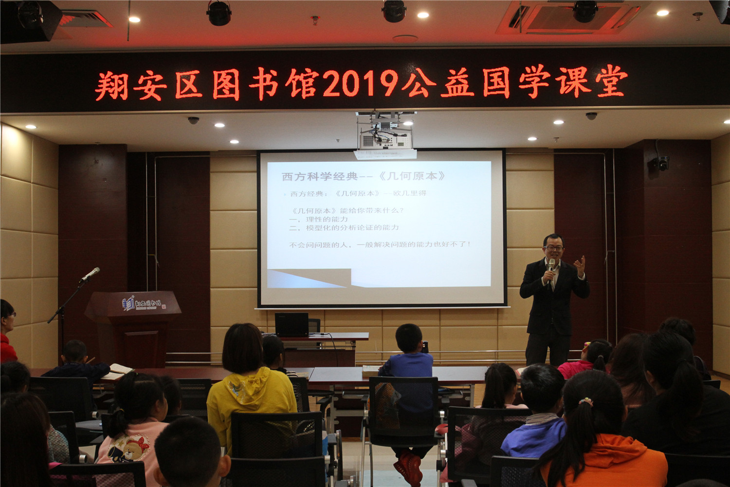 4月20日上午,公益国学课堂2019年第6期活动在翔安区图书馆报告厅举办,现场座无虚席。本次活动由新加坡国立大学的物理博士作《自然哲学经典与学习之道》的讲座,他介绍了自然哲学经典《几何原本》的基本思维,并分享用这种思维对学习方法进行的探索。区别于东方文化的内求,西方文化中独特的形式逻辑思维,帮助读者更好的了解客观世界和自己。课堂上有分享、有讨论、有答惑,由浅入深,亲子共学,在德能分享活动中帮助读者树立正确的知见。