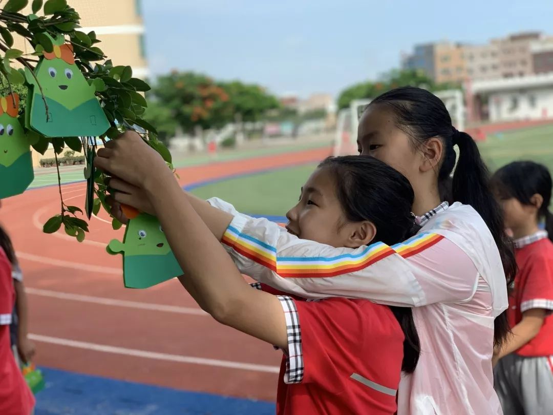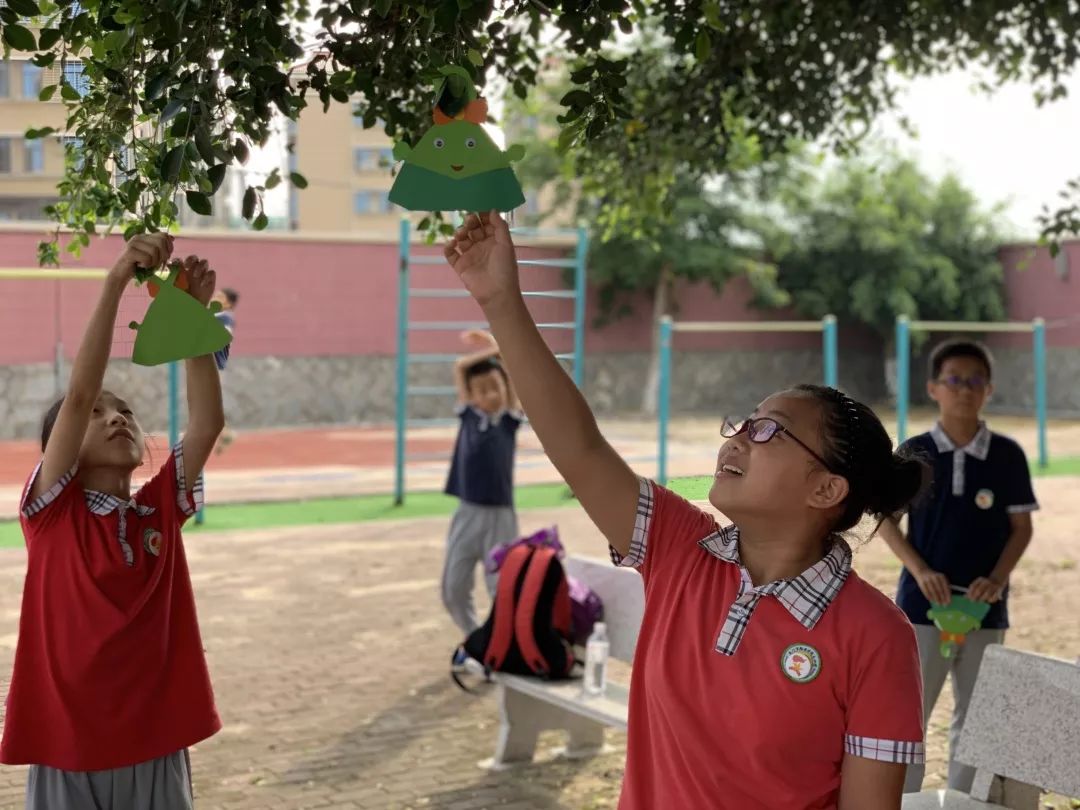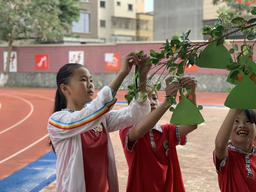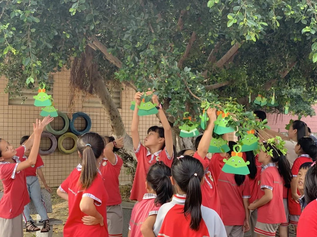 孩子们来到操场,把“粽子书”挂在树枝上,这颗长满“粽子”的大树,成为了校园里一道别致幸福的风景。