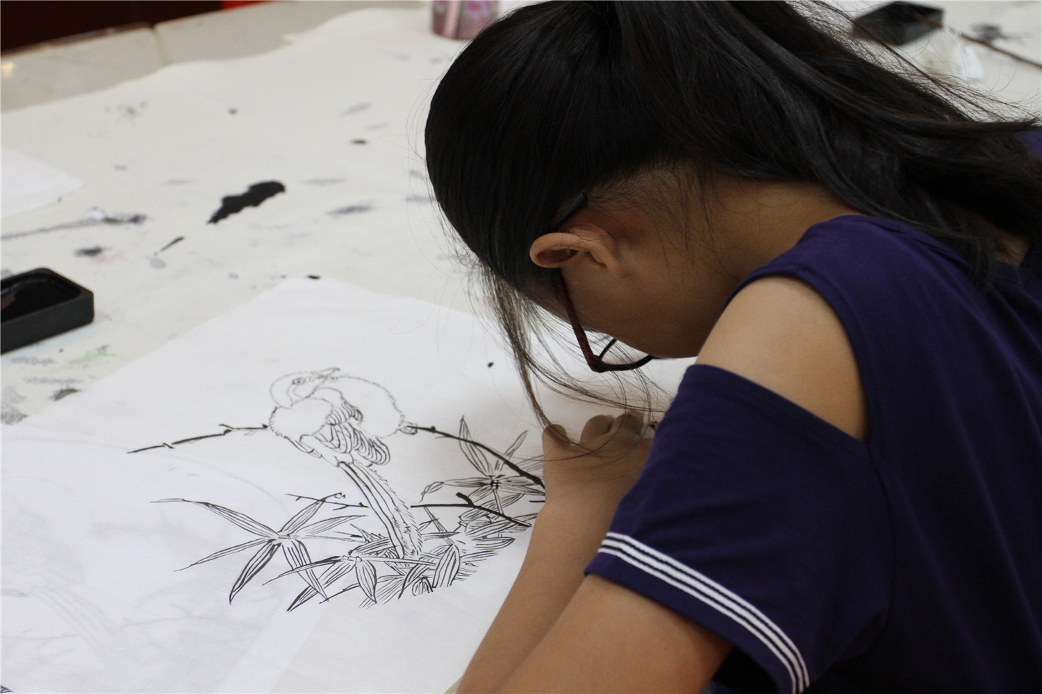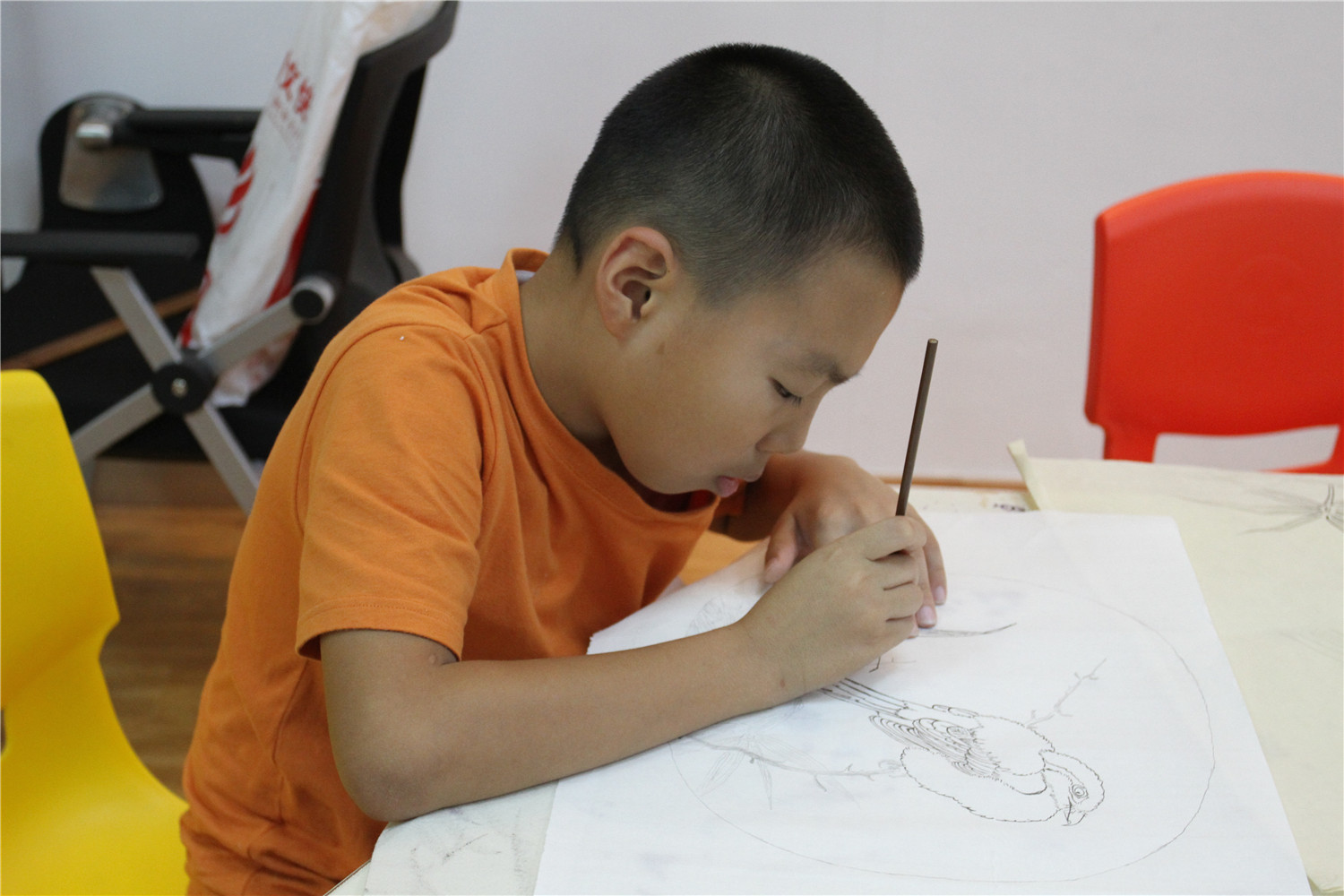 课堂上,杨老师首先纠正小读者执笔方式、指导正确的线条描绘方式、并介绍鸟类白描的方式方法。最后,小读者独立完成了鸟类白描画。