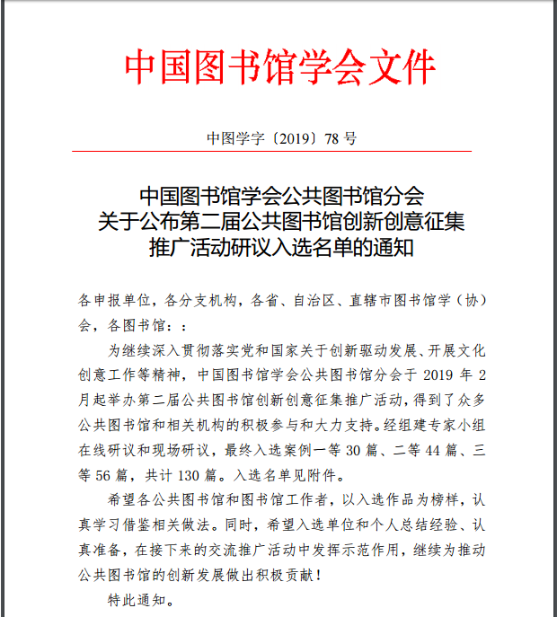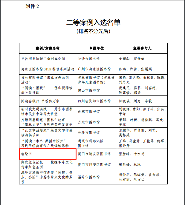 近日,由中国图书馆学会官网获悉,“第二届公共图书馆创新创意征集推广活动”评奖结果揭晓,翔安区图书馆“智绘书”案例获得全国二等奖。