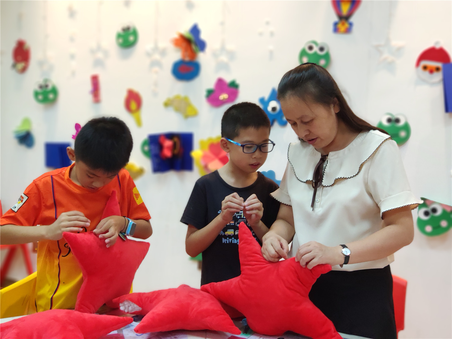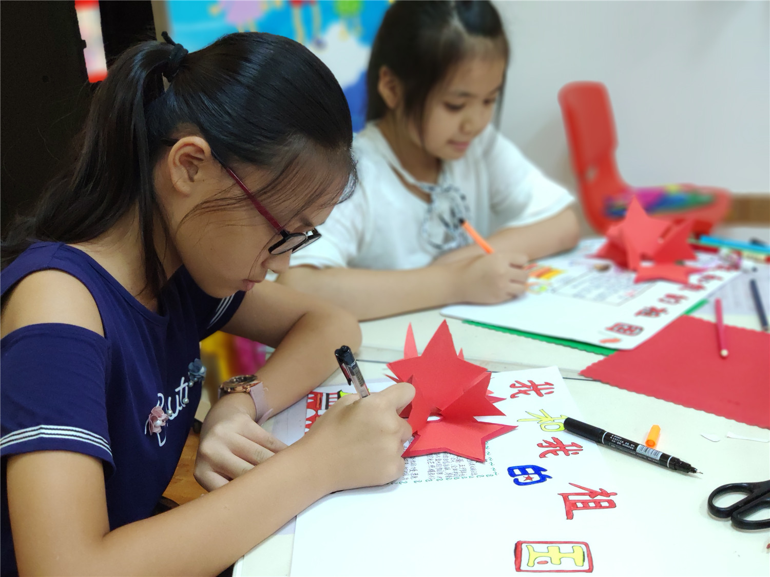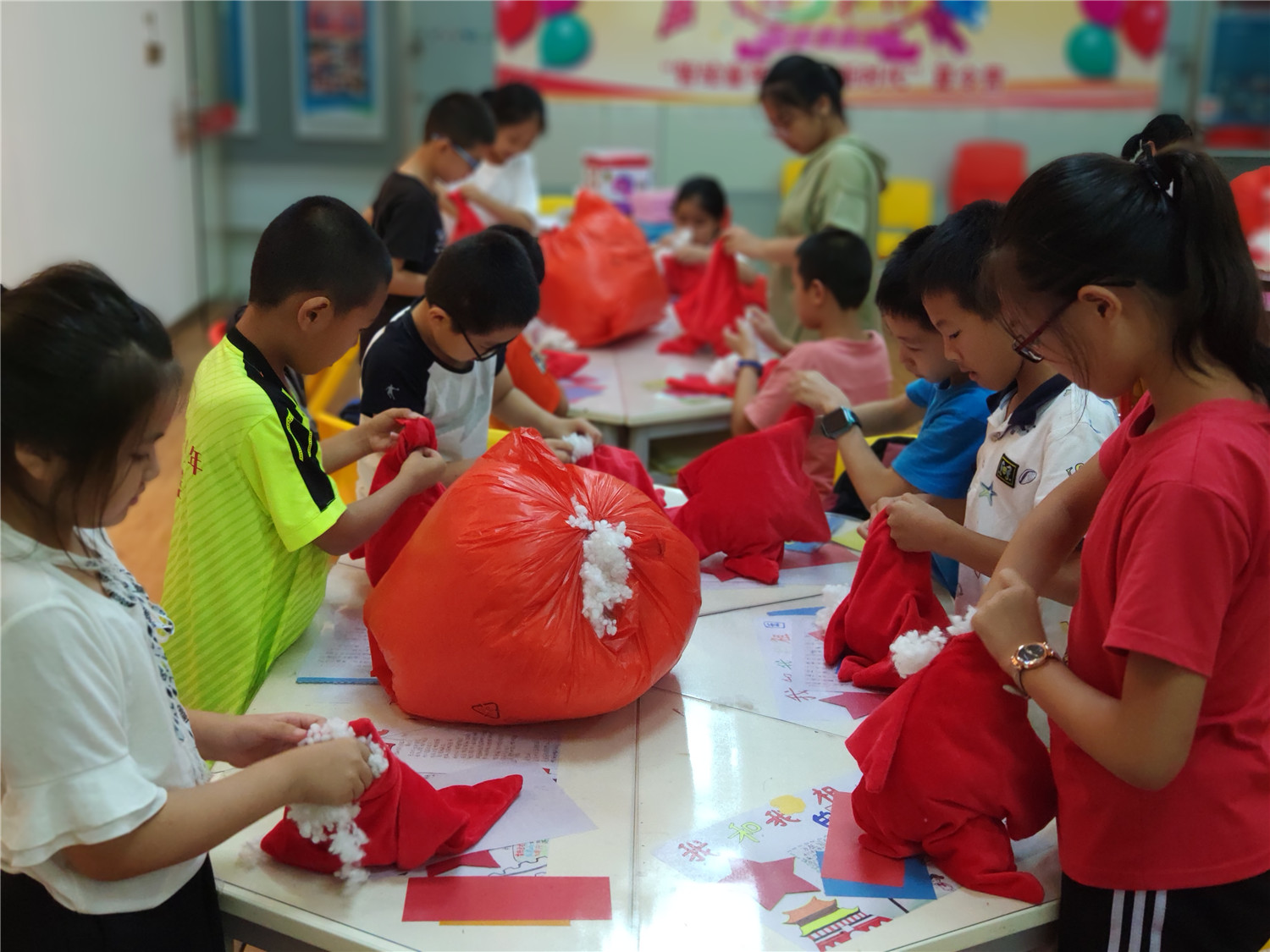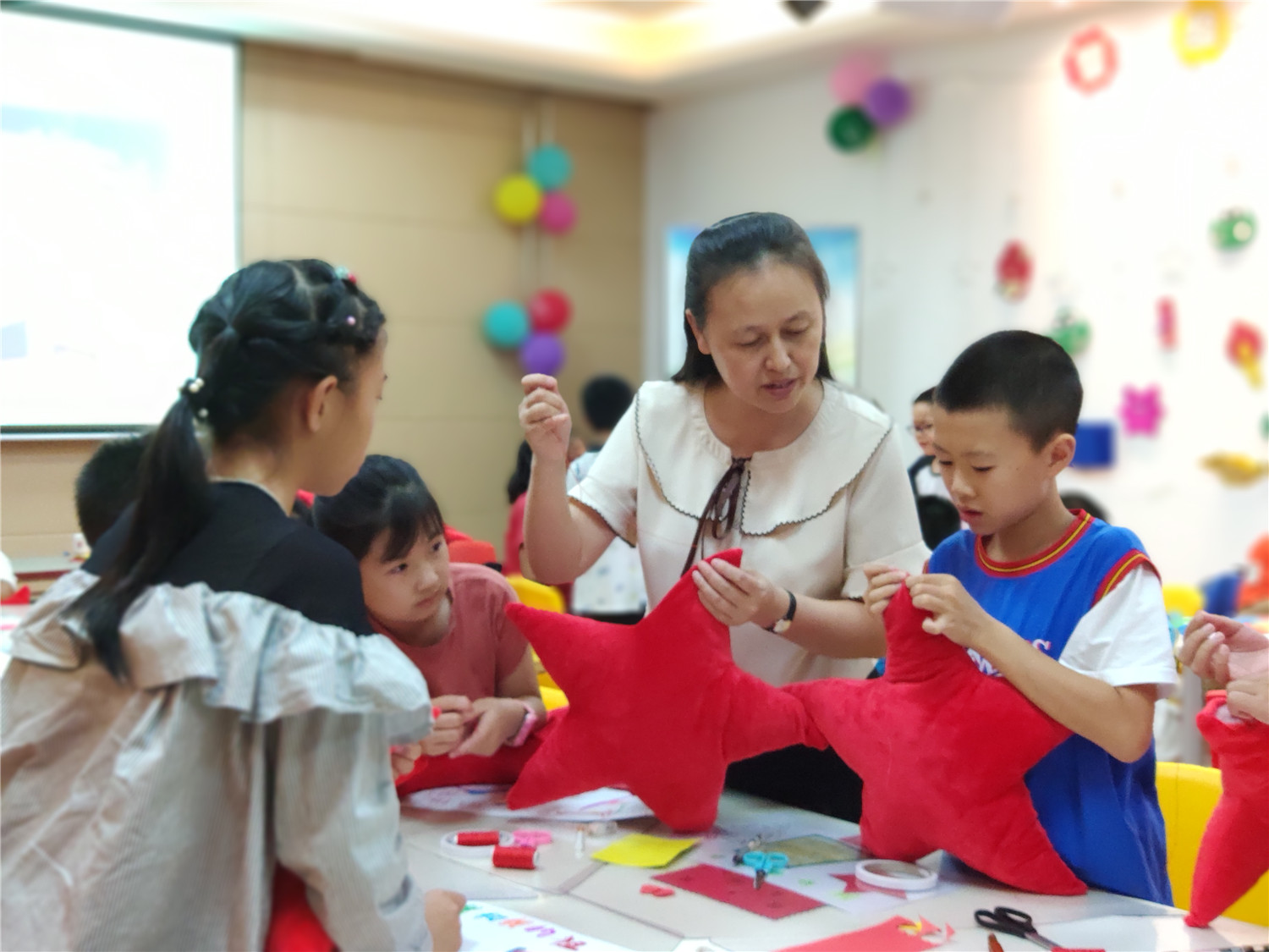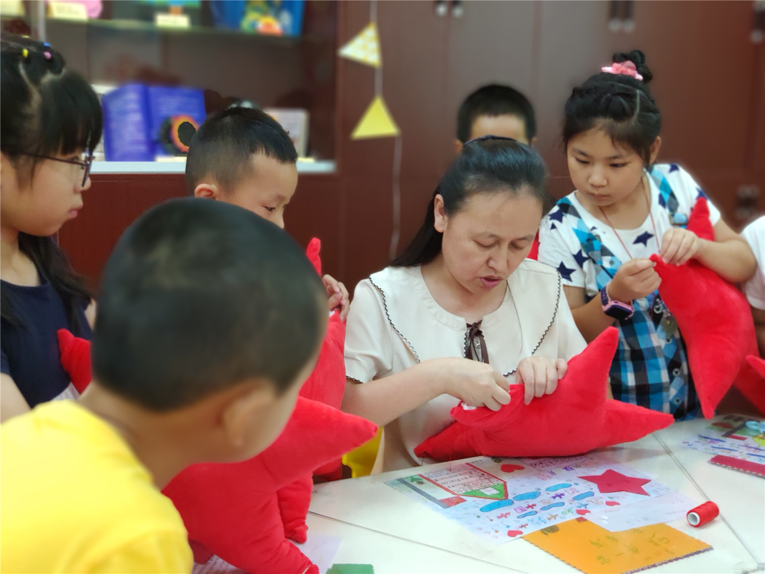 为期五天的夏令营活动内容丰富多彩:香橼老师讲述《乌龟一家去看海》、《你是我的爱》、《我的祖国》、《喀哒喀哒喀哒》绘本;指导小营员制作魔法盒立体贺卡,同时学写贺卡上的应用文;制作布艺绘本,并进行童话故事的创作;以“为我的祖国点赞”为主题进行手抄报的创作、以“我和我的祖国”为主题进行儿童诗创作;学习缝纫技能,亲手缝制五角星靠枕;以及制作百期贺卡、诗朗诵、故事会、作品展、颁奖仪式等。