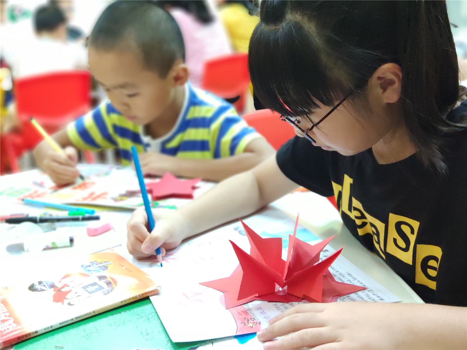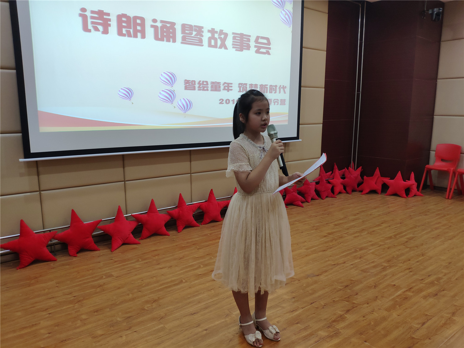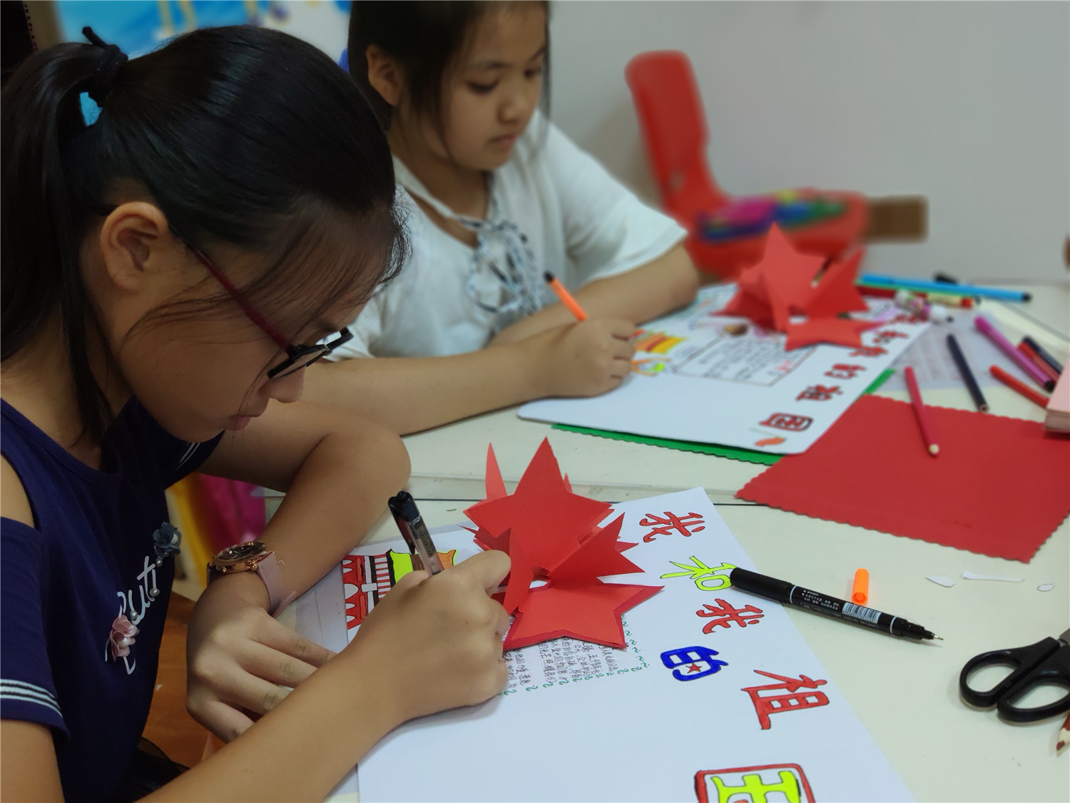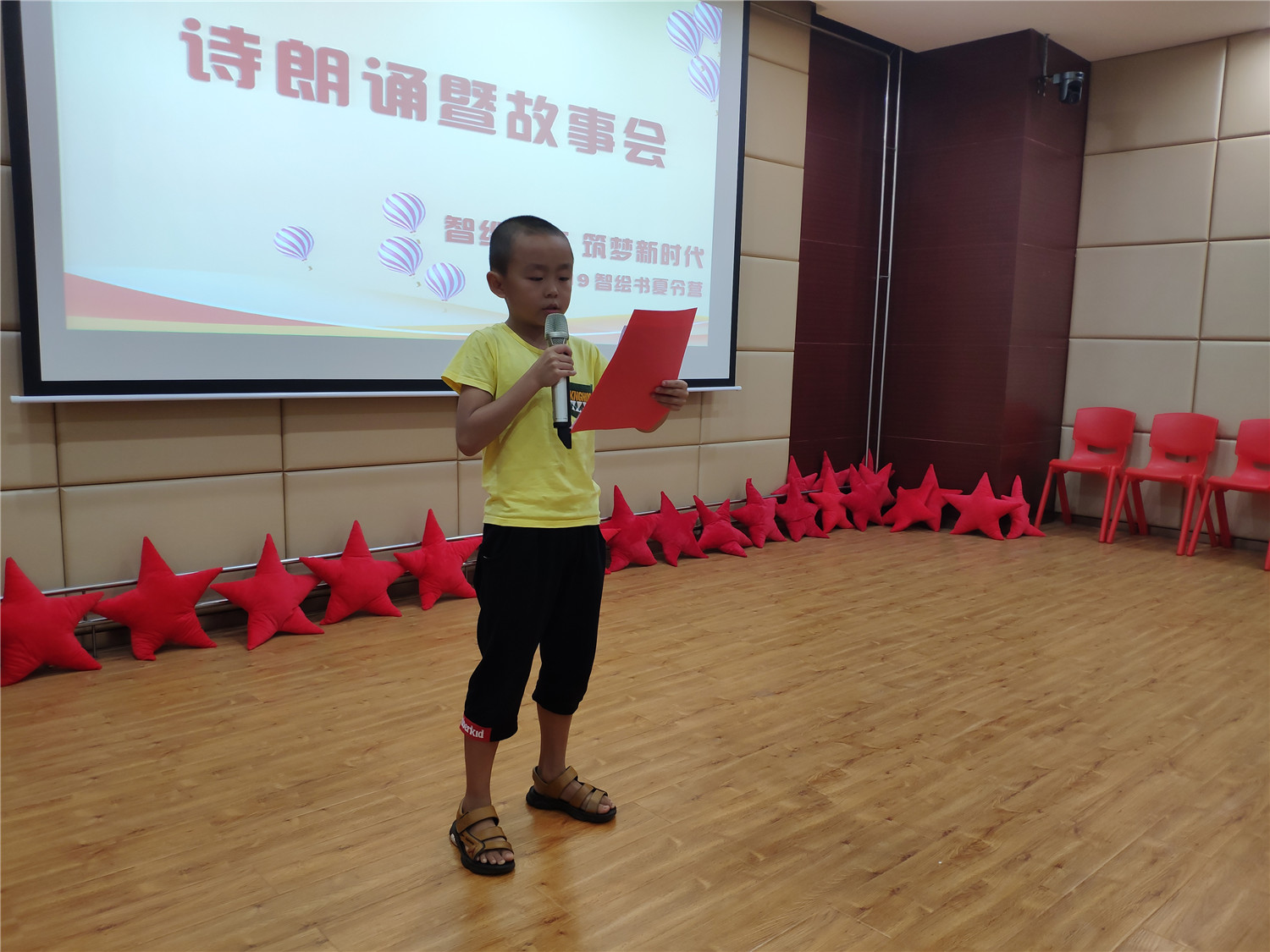 为期五天的夏令营活动内容丰富多彩:香橼老师讲述《乌龟一家去看海》、《你是我的爱》、《我的祖国》、《喀哒喀哒喀哒》绘本;指导小营员制作魔法盒立体贺卡,同时学写贺卡上的应用文;制作布艺绘本,并进行童话故事的创作;以“为我的祖国点赞”为主题进行手抄报的创作、以“我和我的祖国”为主题进行儿童诗创作;学习缝纫技能,亲手缝制五角星靠枕;以及制作百期贺卡、诗朗诵、故事会、作品展、颁奖仪式等。