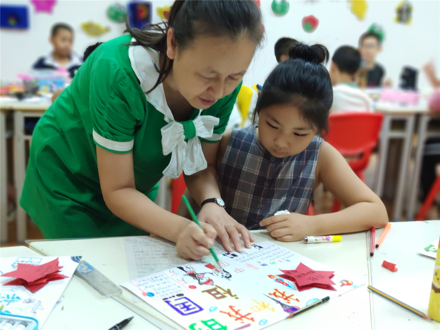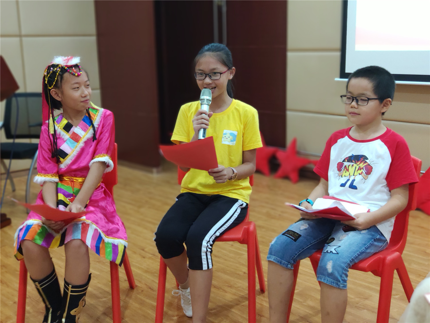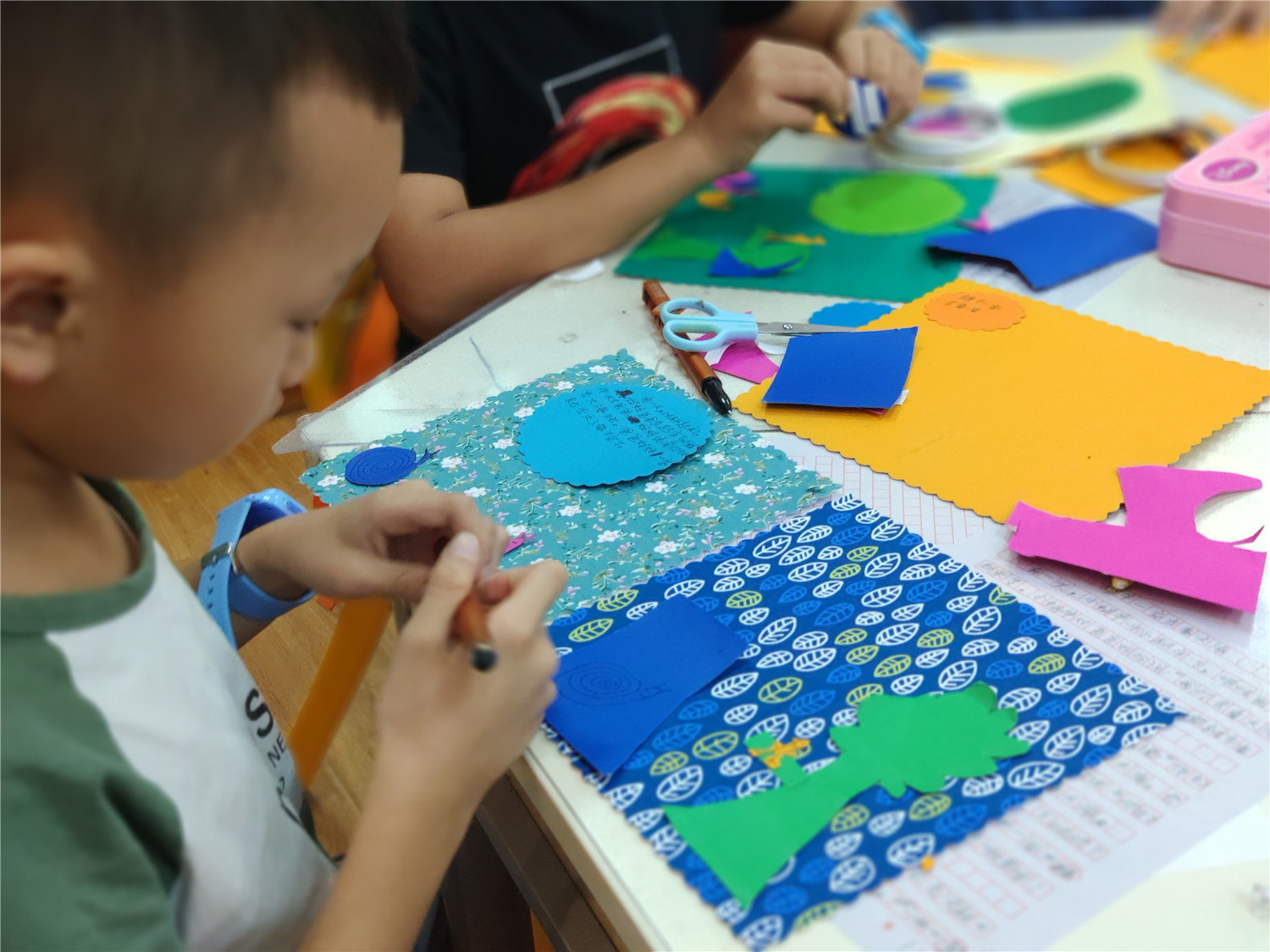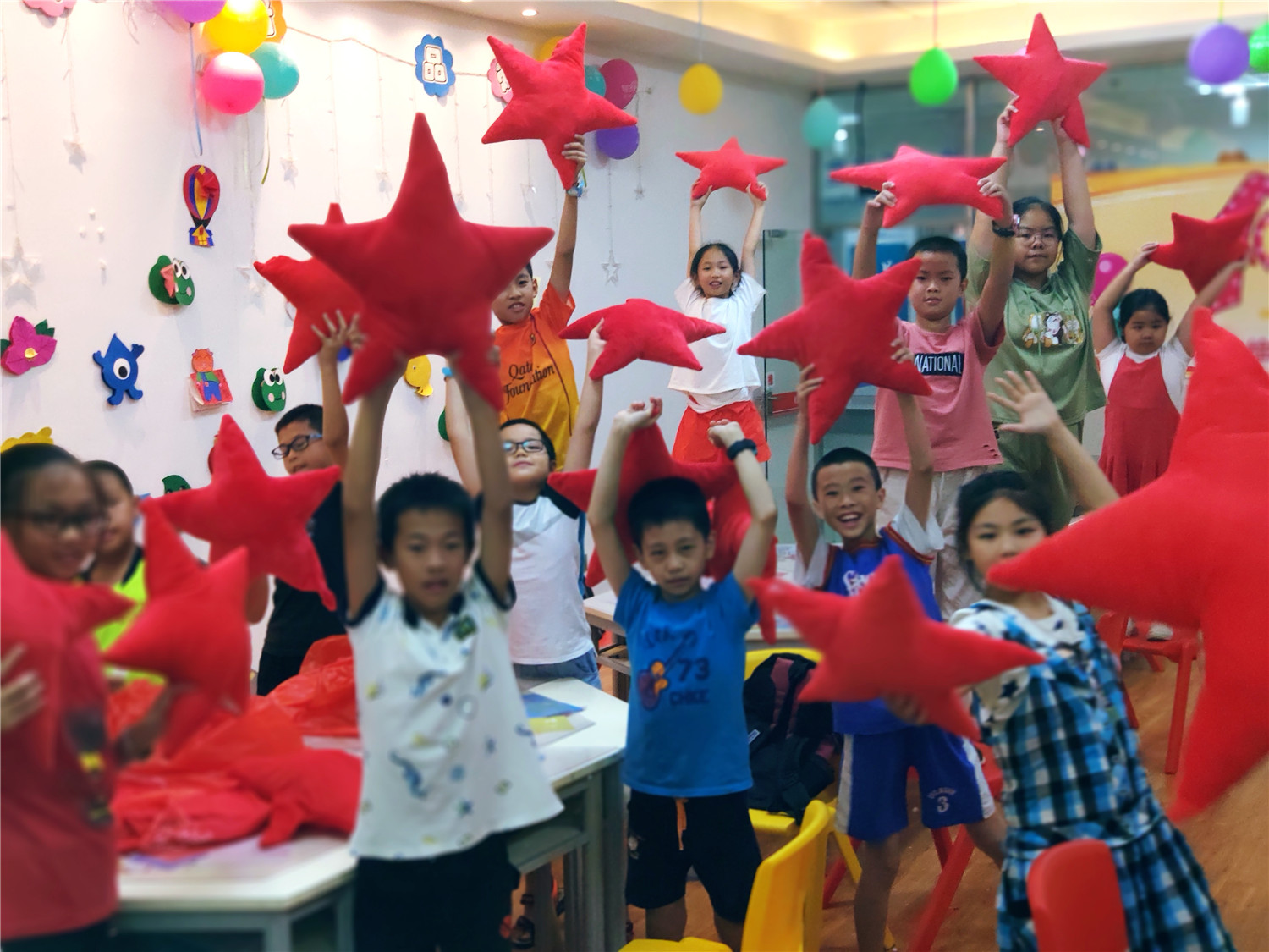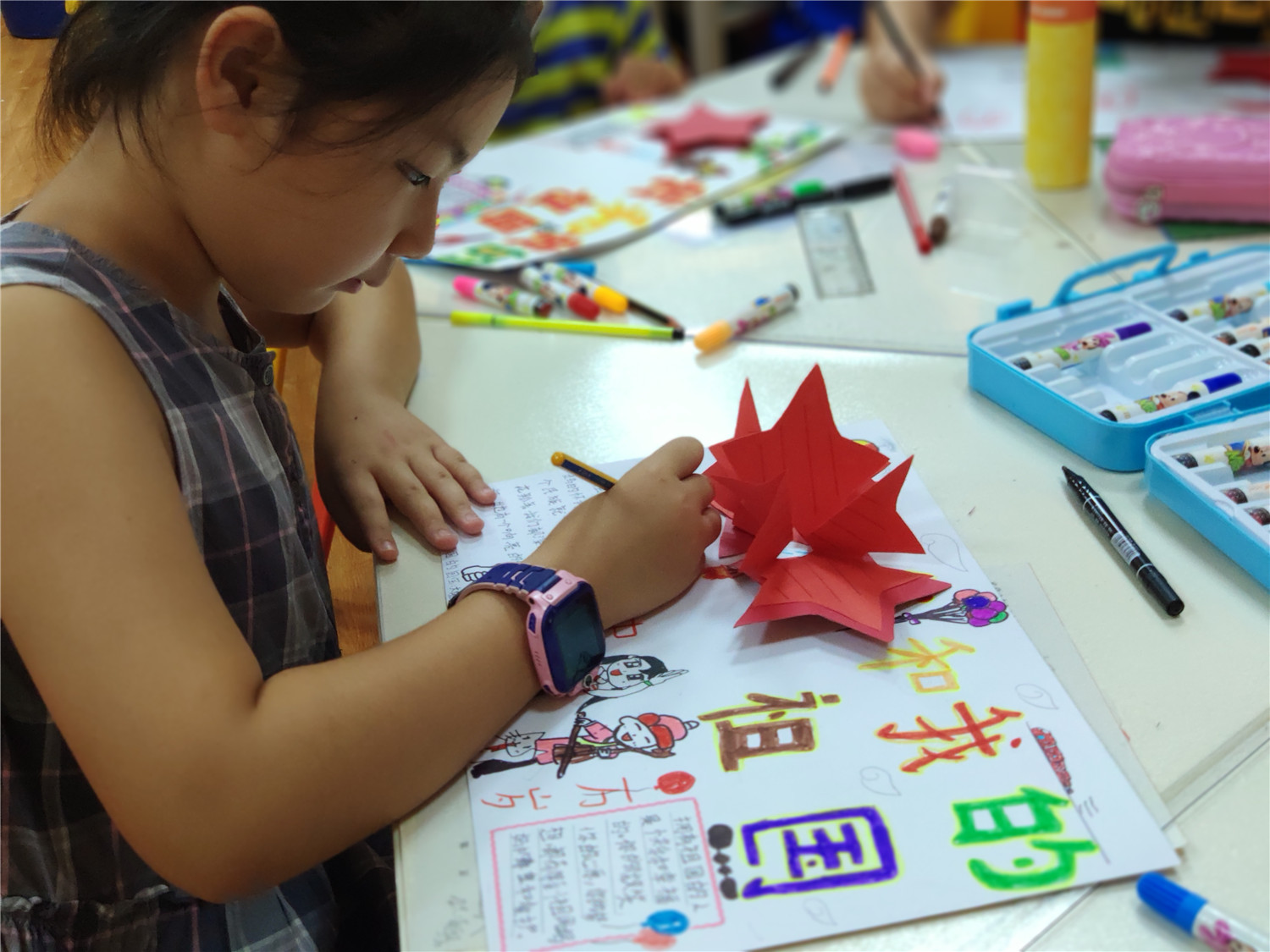 为期五天的夏令营活动内容丰富多彩:香橼老师讲述《乌龟一家去看海》、《你是我的爱》、《我的祖国》、《喀哒喀哒喀哒》绘本;指导小营员制作魔法盒立体贺卡,同时学写贺卡上的应用文;制作布艺绘本,并进行童话故事的创作;以“为我的祖国点赞”为主题进行手抄报的创作、以“我和我的祖国”为主题进行儿童诗创作;学习缝纫技能,亲手缝制五角星靠枕;以及制作百期贺卡、诗朗诵、故事会、作品展、颁奖仪式等。