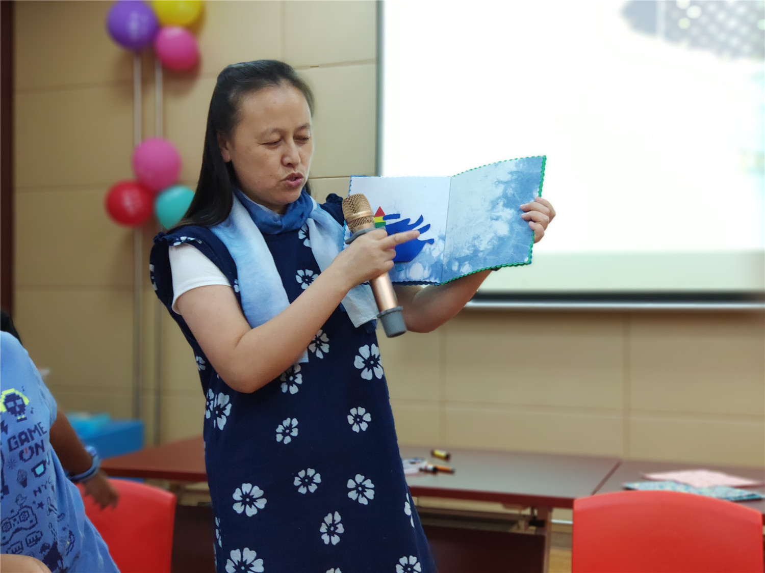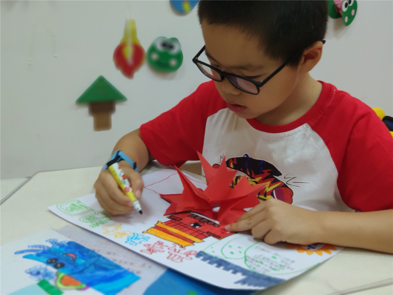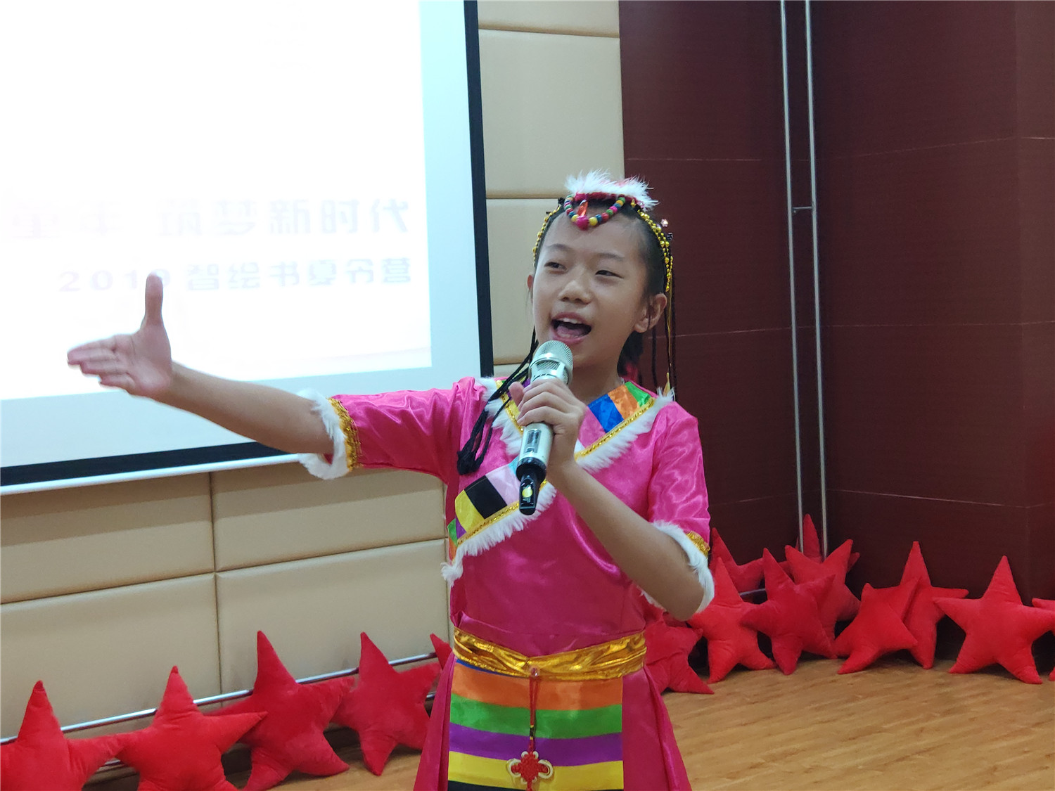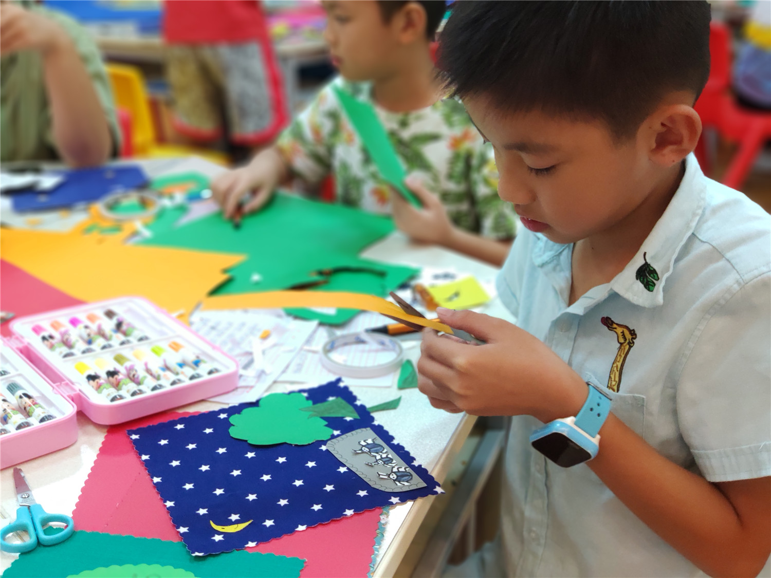 为期五天的夏令营活动内容丰富多彩:香橼老师讲述《乌龟一家去看海》、《你是我的爱》、《我的祖国》、《喀哒喀哒喀哒》绘本;指导小营员制作魔法盒立体贺卡,同时学写贺卡上的应用文;制作布艺绘本,并进行童话故事的创作;以“为我的祖国点赞”为主题进行手抄报的创作、以“我和我的祖国”为主题进行儿童诗创作;学习缝纫技能,亲手缝制五角星靠枕;以及制作百期贺卡、诗朗诵、故事会、作品展、颁奖仪式等。