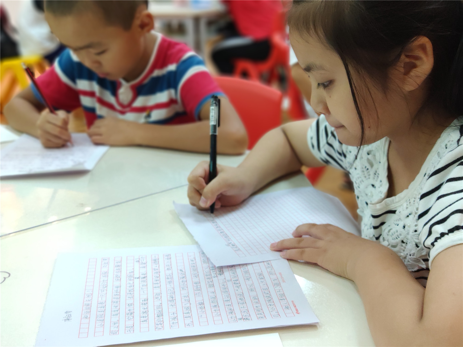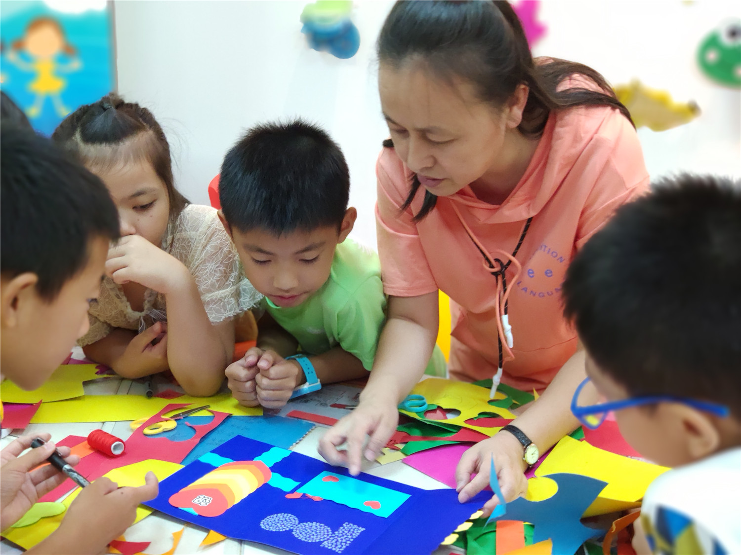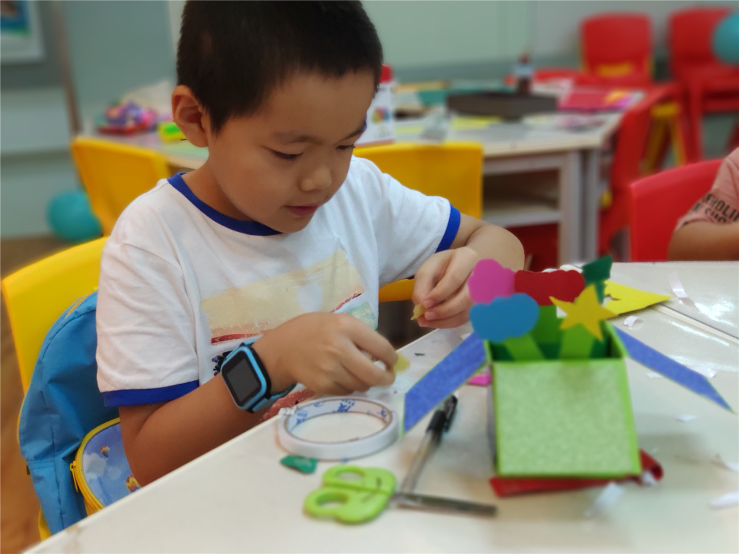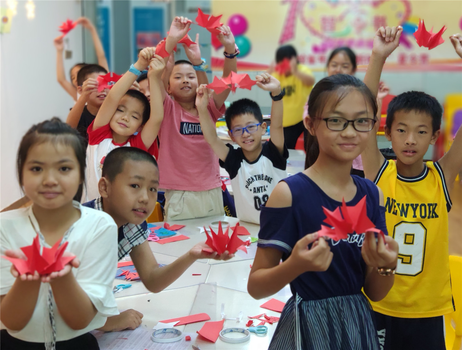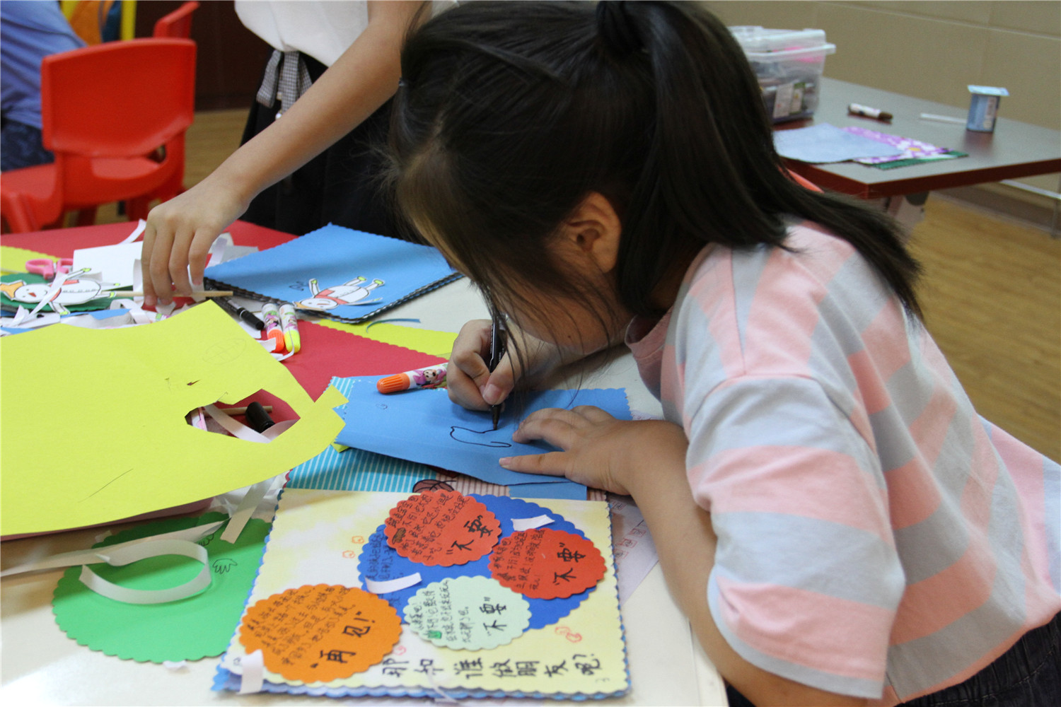 为期五天的夏令营活动内容丰富多彩:香橼老师讲述《乌龟一家去看海》、《你是我的爱》、《我的祖国》、《喀哒喀哒喀哒》绘本;指导小营员制作魔法盒立体贺卡,同时学写贺卡上的应用文;制作布艺绘本,并进行童话故事的创作;以“为我的祖国点赞”为主题进行手抄报的创作、以“我和我的祖国”为主题进行儿童诗创作;学习缝纫技能,亲手缝制五角星靠枕;以及制作百期贺卡、诗朗诵、故事会、作品展、颁奖仪式等。